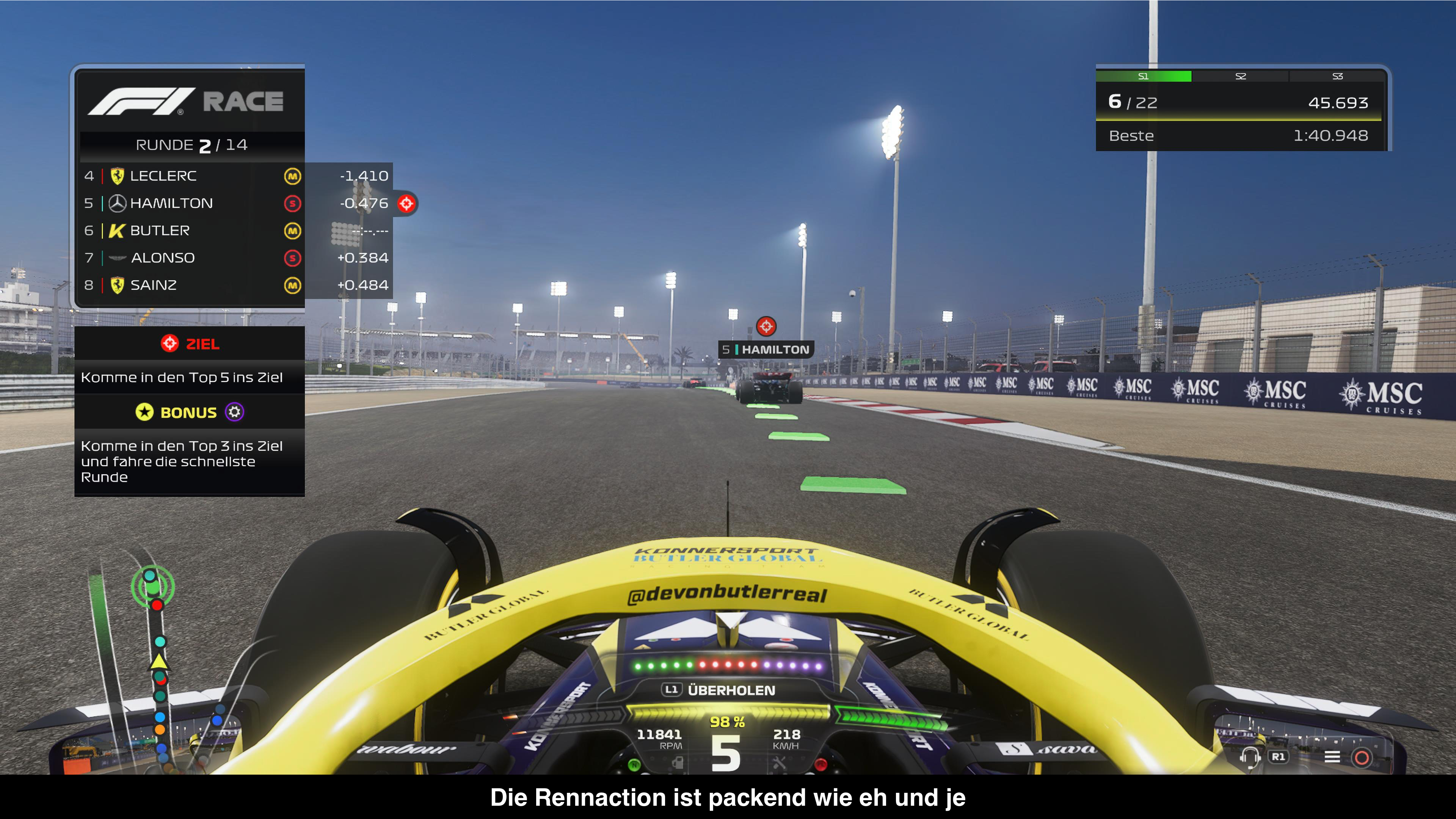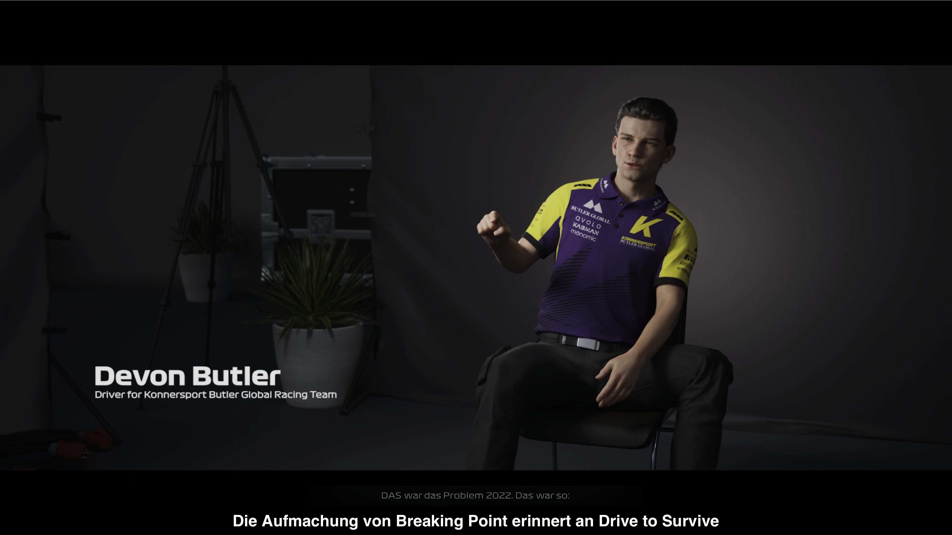 F1 21 bot erstmals einen Story-Modus, der euch den Formel 1 Zirkus noch näher bringen wollte und einige Fans fand. Leider entfernte man diesen dann letztes Jahr wieder, um ihn nun wieder zurückzubringen. In Breaking Point 2 wird eine Geschichte um das fiktive Team Konnersport erzählt, welches die altbekannten Charaktere Aiden Jackson und Devin Butler angeheuert hat. Früher waren sie jedoch erbitterte Rivalen und somit ist jetzt für reichlich Konfliktpotential vorgesorgt. Insgesamt gesehen ist die Geschichte relativ vorhersehbar und bleibt sehr oberflächlich. Das ist wirklich schade, denn es werden ein paar interessante Themen aufgegriffen, aber letztlich macht man damit überhaupt nichts was hängen bleibt. So versucht man den Stil der Netflix-Serie Drive to Survive nachzuahmen und zeigt reichlich Interviews, Kommentare und Behind the Scenes Situationen, die aber wenig interessant sind. Leider hat man die Action auf der Strecke vollständig vernachlässigt. Beispielsweise geht es direkt im ersten Rennen um einen Motorschaden, der euer Rennen frühzeitig beendet. Statt dass dies einfach abrupt beim Fahren passiert, blendet man eine Zwischensequenz ein. Dabei wäre die Alternative viel natürlicher.