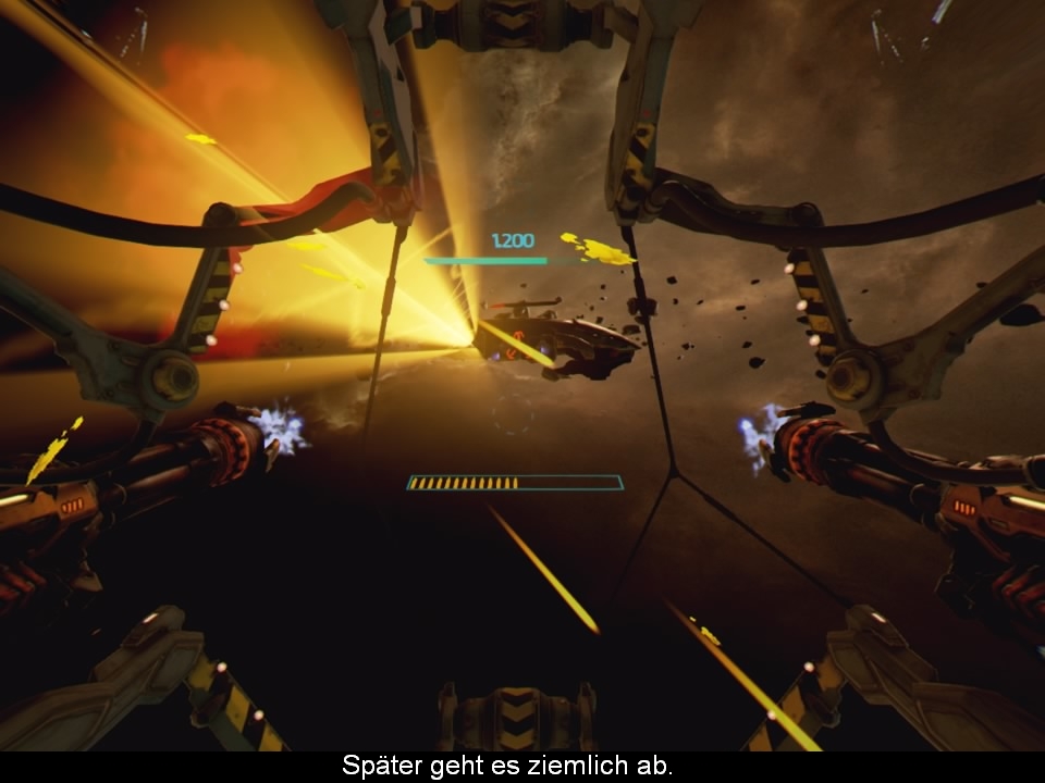Ohne großes Vorgeplänkel sitzt ihr schon nach ein paar kurzen Instruktionen in eurer Kanzel (Star Wars like wie im Falcon) und wartet auf das erste Kanonenfutter. Im Formationsflug düsen euch die feindlichen Jäger und Drohnen nun um die Ohren und ihr feuert aus allen Rohren. Gezielt wird dabei mit dem Kopf, was dank perfektem Tracking ohne Probleme funktioniert. Neben der Standard Kanone gibt es noch diverse Power Ups zum einsammeln, welche vernichtete Gegner hinterlassen. So könnt ihr Munitionsbegrenzt noch auf einen dicken Laser, zielsuchende Raketen oder eine Art Raketenwerfer zugreifen. Des Weiteren ergattert ihr mit etwas Glück noch Smartbombs, Reparatur Kits oder eine Art Energiewelle, die Feinde extrem verlangsamt. Größere Feinde hinterlassen auch schon mal Weltraumschrott, den ihr an euch andocken und somit als Schutzschild nutzen könnt.