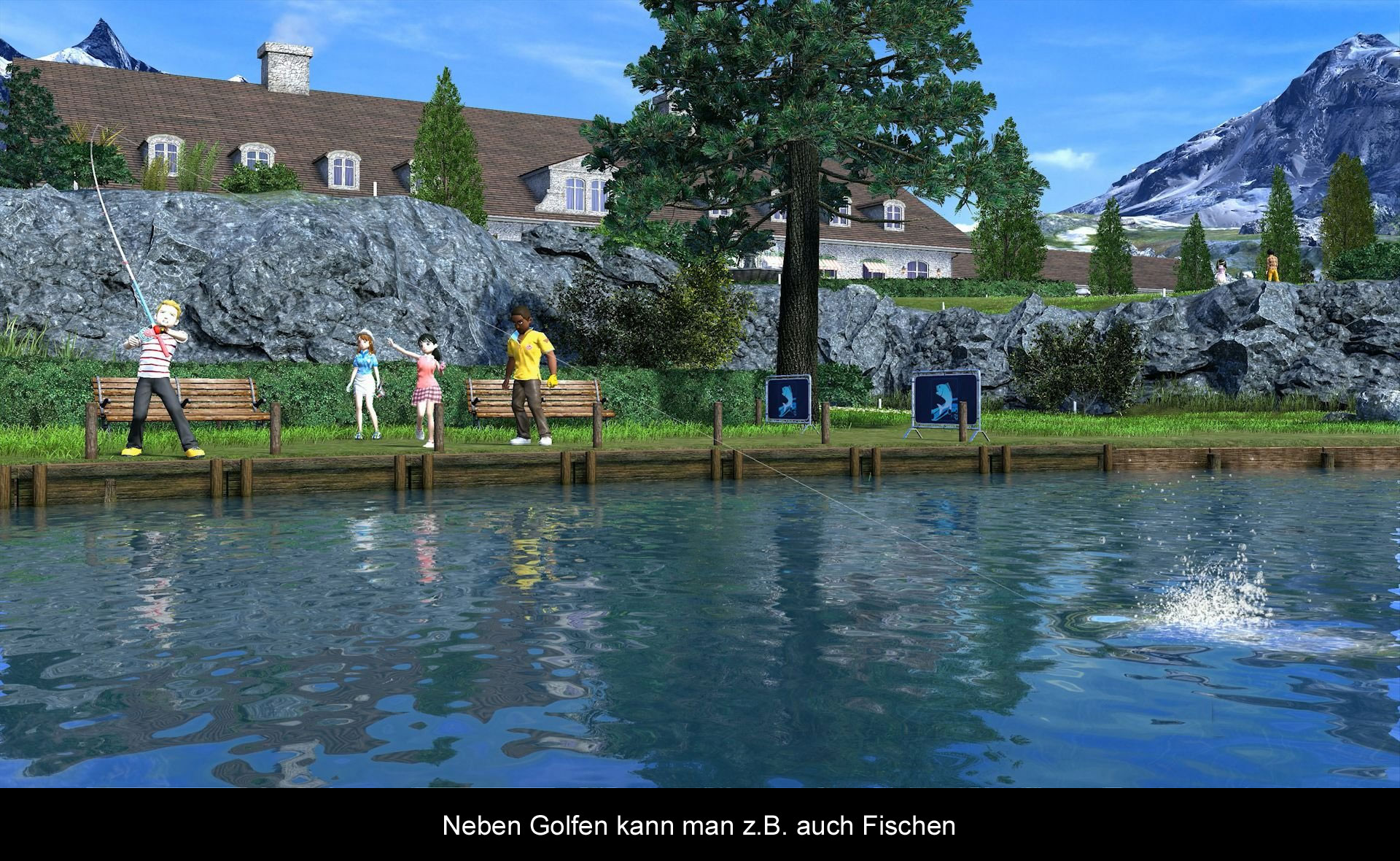 Okay, Everybody's Golf hat zwar den Schritt in Richtung Open World gewagt, aber dennoch ist es nicht ganz so vollgepackt mit Inhalten, wie zum Beispiel ein GTA. Dennoch gibt es in der Welt von Everybody's Golf sehr viel Neues zu erleben, dazu zählt unter anderem die Möglichkeit, an Bächen und Seen Fischen zu gehen. Laut den Entwicklern wurde man hierbei von Golfkursen aus dem echten Leben inspiriert, die eine ähnliche Erfahrung bieten. Der Umfang dieses Minispiels ist mit einem imposanten Inventar, einer Fisch-Enzyklopädie und sogar einem eigenen Level-System überraschend groß ausgefallen. Einzig und allein das Gameplay, welches Button-Mashing in den Vordergrund stellt, wird im Zuge der Zeit etwas eintönig. Wer jedoch eine kleine Alternative zum Golfsport sucht, wird hier definitiv gut unterhalten werden. Eine weitere Neuerung, die ebenfalls im Bezug zur offenen Welt steht, ist das neue Golfmobil mit dem ihr euch noch schneller durch die großen Karten bewegen könnt. All dies ist Teil der neuen offenen Gameplay-Welt, die ihr nur erkunden könnt, wenn ihr online seid. Zusätzlich zu den zuvor erwähnten Features, gibt es auch einige neue Modi, auf die man online zugreifen kann. So ist der Online-Modus in zwei Modi unterteilt: Zum einem gibt es da die offene Welt, wo man entweder alleine oder mit Freunden um Siege und Leaderboard-Platzierungen (für die man mit Preisen belohnt wird) spielen kann, und zum anderen gibt es da noch den neuen „Turf War“-Modus, wo zwei Gruppen darum spielen, innerhalb kurzer Zeit, die meisten Punkte zu erzielen. Zu guter Letzt bietet die offene Welt auch noch zahlreiche Geheimnisse und Preise, die man in den Level finden kann, was einem ebenfalls dazu anregt, die Welt zu erforschen. Und da man gleichzeitig auch die anderen Spieler sieht, die gerade online sind, herrscht stets ein munteres, aber keineswegs nerviges Treiben auf dem Grün. Alles in allem ist der neue Fokus auf die Online-Anbindung eine gelungene Addition, die die Serie nochmals auf eine ganz neue Stufe bringt.