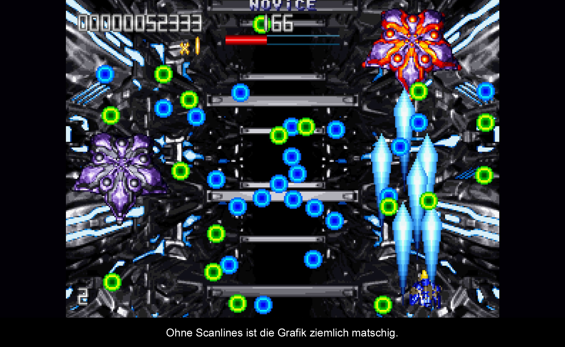 An sich klingt das alles doch gar nicht so schlecht, also warum die skeptische Einleitung? Ein Bullet Hell Shoot‘ em Up steht und fällt mit den Pattern genannten Schussformationen und der Hit Zone eures Schiffes. Letzteres ist dann das größte Manko, da die Hit Zone einem nicht angezeigt wird. So sind die Schiffe in solchen Shmups zwar ziemlich groß, doch nur ein Bruchteil davon kann auch von gegnerischen Bullets getroffen werden. Normal wird einem diese Hit Zone mittels eines Leuchten angezeigt, was hier jedoch nicht der Fall ist. Dadurch wird einem das Manövrieren durch die Pattern sehr erschwert. Hinzu kommt, dass die Grafik zwar detailliert daherkommt, jedoch auch sehr grobpixelig ist. Ein wenig polierter hätte die Auflösung schon sein können. Die Neo Geo Herkunft lässt sich also nicht verleugnen. Immerhin läuft “Last Striker” mit butterweichen 60 Bildern in der Sekunde und die gegnerischen Schiffe, sowie die Hintergründe der Level verfügen über ganz hübsche Animationen. Wobei in allen Level eine arg düstere Präsentation herrscht und alles recht dunkel daherkommt. Immerhin heben sich dadurch die Bullets sehr gut vom Hintergrund ab. Der Soundtrack besteht aus treibenden Elektrobeats, bleibt jedoch nach dem Spielen nicht weiter in den Ohren hängen. Die farbigen Pattern an sich sind OK, entsprechen jedoch größtenteils dem Genre Durchschnitt und stellen geübten Piloten wohl nur im höchsten Schwierigkeitsgrad vor Probleme. Die Farben der Bullets besitzen dabei natürlich die üblichen Fähigkeiten wie schnell, langsam, zielgerichtet und so weiter. Übrigens lassen sich die Schiffe nicht mittels Power Ups aufleveln und auch nicht einzeln auswählen, da jedes der vier marginal anderen Schiffe an einen Schwierigkeitsgrad gekoppelt ist. Immerhin gibt es zwei Schussmodi, je nachdem ob man den Button gedrückt hält, oder stetig triggert. Auch nicht optimal ist die Steuerung mit dem D-Pad und dem Analogstick, da beides eher schwammig und träge daherkommt. Da spielt sich ein “Ghost Blade HD” und natürlich ein “Ikaruga” weitaus direkter. Positiv dagegen sind die Einstellungsmöglichkeiten des Bildschirms, wo man das Bild beliebig stretchen und vergrößern kann. Selbst die Scanlines kann man beliebig stark einstellen, was man auch tun sollte, da ohne Scanlines das Bild arg breiig daherkommt und somit der Übersicht nicht zuträglich ist. Wer will kann auch die Seitenränder mit Wallpapern “verschönern”.