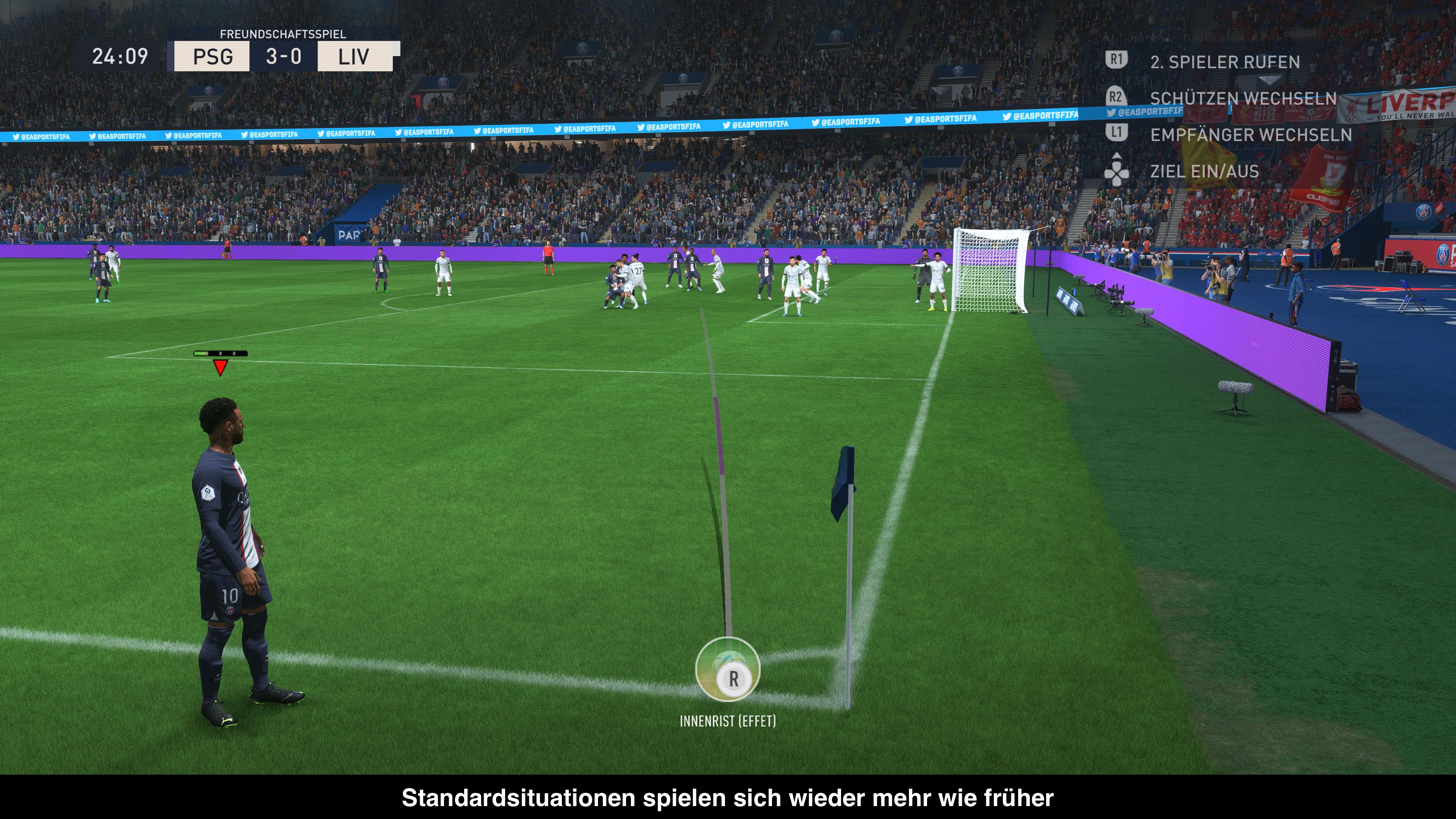 Eine weitere größere Neuerung betrifft die Standardsituationen. In den Vorgängern gab es ein System, was einiges an Können vorausgesetzt hat, weil viel mit Gefühl gearbeitet werden musste. Vielleicht war dies einigen zu schwer, denn das aktuelle System erinnert an das vorletzte. So sieht man bei Freistößen und Ecken wieder eine Linie, welche die Flugkurve andeutet und man kann genau bestimmen, wie der Ball getroffen wird. Die einzige Variable dabei ist dann die Schussstärke, welche man wie zuvor bestimmt. Bei Elfmetern gibt es stattdessen eine Art pulsierende Anzeige und man muss möglichst genau treffen und dann die Schussstärke mit der Richtung bestimmen. Insgesamt wurde das System also ordentlich vereinfacht, was nicht negativ sein muss, da man somit alle abholen kann.