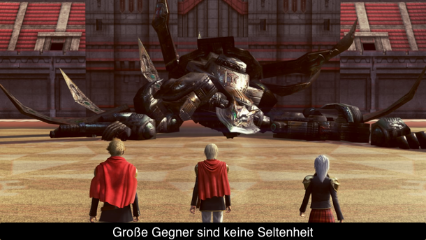 Auch das Gameplay hat nur noch wenig mit dem System der Final Fantasy XIII Spiele zu tun. Stattdessen erinnert es mehr an das deutlich rasantere Gameplay von Crisis Core Final Fantasy VII. Jeder eurer Kadetten hat maximal vier Attacken, die mittels der Facebuttons aktiviert werden. Während man zu Beginn des Spiels nur relativ schwache Angriffe zur Verfügung hat, kann man nach und nach neue Abilities und Zauber freischalten. Und selbst Espers und Comboangriffe gehören nach kurzer Zeit zum Standardrepertoire. Insgesamt kämpfen 3 Studenten auf einmal. Kontrolliert wird aber nur einer. Man kann aber jederzeit in Echtzeit zwischen Ihnen durchwechseln. Und stirbt mal einer, lässt sich ein weiteres Mitglied der „Klasse 0“ dazu holen. Trotz des simplen Gameplays sollte man jedoch kein einfaches Spiel erwarten. Insbesondere die Bosse können euch vor großen Problemen stellen. Kluges Ausweichen ist jedoch der erste Schritt zum Sieg. Obwohl das Kampfsystem nicht ganz so dynamisch wirkt, wie zum Beispiel bei einem Devil May Cry oder God of War ist es dennoch eine solide Abwechslung vom ansonsten so trägen Final Fantasy Alltag. Einzig die Kamera stellt euch hin und wieder vor einigen Problemen. Zum einem ist sie nämlich etwas ungenau beim Lock-On und zum anderen dauert es nicht lange bis man keine Lust mehr auf den nervigen Motion Blur-Effekt hat.