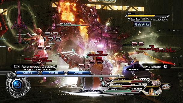 Auch in Hinblick auf das Gameplay, überrascht Final Fantasy XIII-2 mit einigen unerwarteten Veränderungen. Während man beim Vorgänger noch sämtliche Monster und Gegner jederzeit auf der Oberfläche sehen konnte, kehren mit dem neuesten Ableger der Serie die Zufallskämpfe wieder ein. Und obwohl man in der Praxis nicht wirklich dazu gezwungen ist jeden Kampf auch einzugehen (ein spezieller Radius hilft einem dabei von der Gefahr wegzulaufen) ist es schon verwunderlich, warum man in diesem Fall einen Schritt zurückgegangen ist. Was 1999 vielleicht noch Gang und Gebe war, ist in der heutigen Zeit nur noch eine überflüssige Unterbrechung des Spielflusses. Glücklicherweise hat man wenigstens das Kampfsystem größtenteils in Ruhe gelassen, was meiner Meinung nach zu den absoluten Stärken des Vorgängers gehörte. Im Kampfbildschirm angekommen, steht euch wieder mal die altbekannte ATB-Leiste zur Verfügung, die mit rollen-spezifischen Attacken gefüllt werden soll. Die Auswahl der verschiedenen Rollen (Heiler, Zerstörer etc.) gelingt dabei durch ein Betätigen der L1-Taste, welches das Paradigmen-Menü aufruft. Je nach Taktik lässt sich damit die Ausrichtung eures Teams verändern. Der Schwierigkeitsgrad bewegt sich dabei stets im fairen Rahmen. Und wer trotzdem noch Probleme hat, kann selbigen jederzeit von „Normal“ auf „Einfach“ stellen.