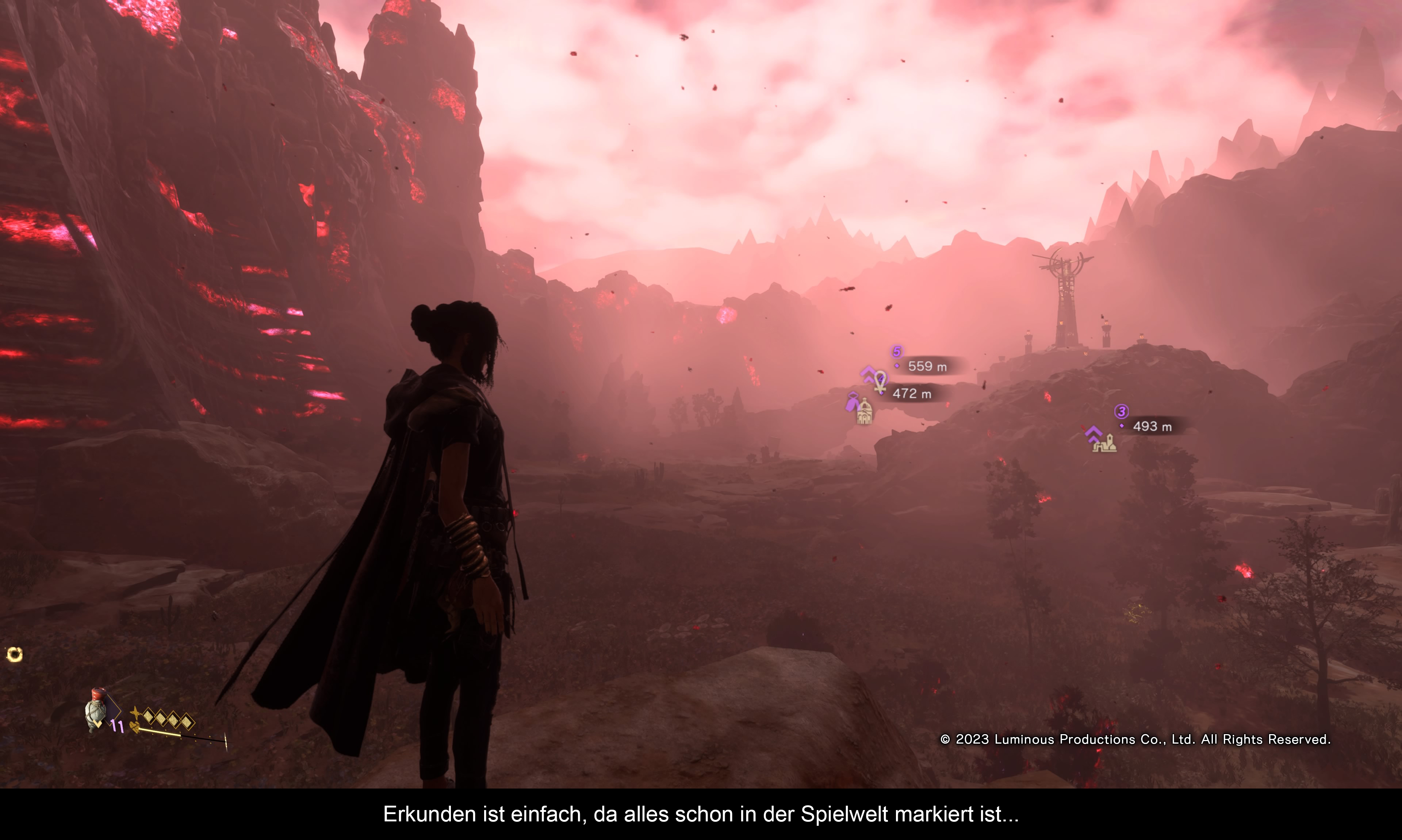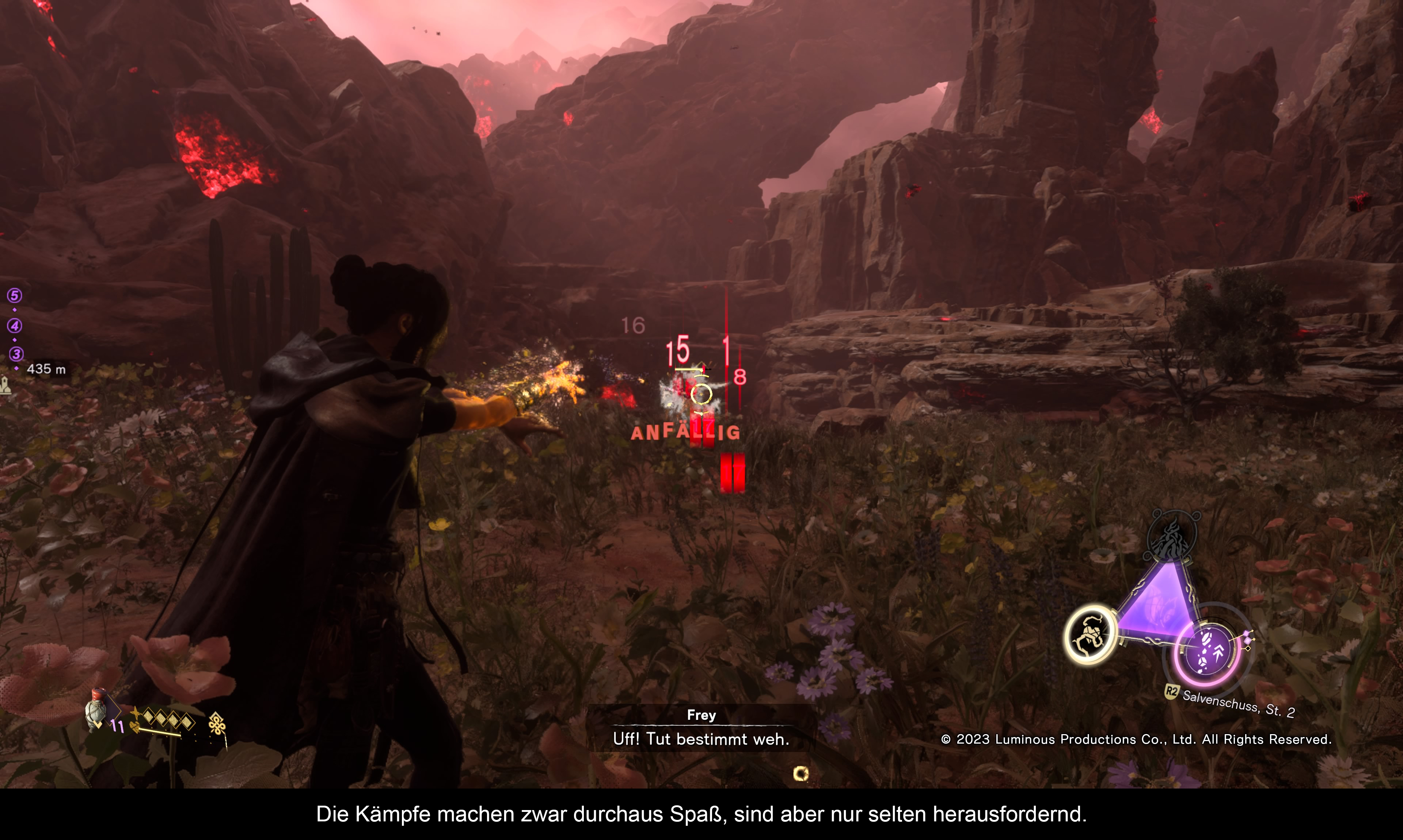 Mit einem typischen Tutorial wird der Einstieg ins Kampfsystem erklärt. In „Forspoken“ wird aber nicht mit Schwert und Schild oder Feuerwaffen gekämpft, sondern man hat hier ein Repertoire an mächtigen Zaubersprüchen zur Verfügung. So hat man die Wahl aus wirkungsvolle Elementangriffen wie Feuer oder Erde. Diese kann man im weiteren Verlauf aufwerten und dadurch noch mehr Schaden an Gegnern anrichten. Da sieht zum Teil auch fantastisch aus, wenn man mit Frey durch die Lüfte springt, einen Feuerball auf Gegner schleudert und dabei sich weiterbewegt, um sich auf die nächste Gruppe von Feinden vorzubereiten. An dieser Stelle muss ich auch deutlich sagen, dass es Vieles gibt, das man kritisieren kann. Doch das Kampfsystem funktioniert im Spiel noch am besten. Die große offene Spielwelt lädt dagegen nicht wirklich zum Erkunden ein, da nahezu alles vorgegeben ist. Im Klartext bedeutet das, alle Aktivitäten – egal welcher Art - sind auf der Karte markiert. Man reist dorthin oder hierhin und "entdeckt", was sich auch immer vor Ort befindet und hat es damit abgehakt. Oftmals besteht sowas aus Kämpfen, durch die man die Gegend säubert, oder man muss mehrere Kisten suchen und diese öffnen. Wenn man Glück hat, gibt es einen Dungeon mit einem Bosskampf am Ende. Aber wirklich aus den Socken hat das auch niemanden. Warum gibt es nicht spannende Nebengeschichten? Statt einem Dungeon, der aus einem geradlinigen Korridor besteht, hätten doch zufallsgenerierte Verließe (die zugegebenermaßen auch nicht immer glänzen können) dem Spiel eher geholfen. Während der ganzen Spielzeit überkam mich öfters das Gefühl, das hier Potential verschwendet wurde. Schaut man auf die lange Entwicklungszeit, ist es umso unverständlicher, warum hier nicht mehr rausgeholt wurde. In dem letzten nummerierten „Final Fantasy“ Spiel gab es hier und da auch Schwächen mit der offenen Spielwelt, aber es gab zumindest einige Nebenquests, toll inszenierte Kämpfe und neue Gegenstände, die einem auf der Reise immer geholfen haben.