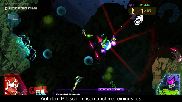 Die Geschichte von Galak-Z ist relativ nebensächlich und schnell erzählt. Ihr schlüpft in die Rolle von A-Tak und seid irgendwo in der Galaxie gestrandet. Also müsst ihr nun insgesamt 25 Missionen bestreiten, um in eure Heimat zurückkehren zu können und dafür diverse Missionen erledigen. Spielerisch stellt sich Galak-Z als eine 2D Space-Sim vor und nimmt den Sim-Aspekt durchaus ernst. Denn wenn ihr euer Schiff in eine Richtung mit eurem Boost schickt, dann bleibt es auch auf diesem Pfad, wie eben im Weltall üblich. Man muss also nicht ständig boosten, sondern nur für Richtungsänderungen. Das klingt zwar sehr simpel, benötigt aber einiges an Gewöhnungszeit. Boosten kann man sowohl vorwärts, als auch rückwärts und nach oben vom Schiff aus gesehen. Diese Fähigkeiten sollte man auch gut beherrschen, denn spätestens im Kampf mit feindlichen Raumschiffen oder Gegnern sind diese überlebenswichtig. Wie man selbst, können die meisten Gegner nämlich Raketen oder Laserwaffen abschießen und dann ist Koordination gefragt. Einerseits muss man den Laserwaffen ausweichen und auch selber dem Gegner Schaden zufügen. Zum Teil kommt es hierbei zu recht unfairen Situationen, wenn mehrere Gegner gleichzeitig gegen einen kämpfen und man lieber schnell das Weite suchen sollte. Das Unfaire wird noch durch den Rogue-Anteil im Spiel verstärkt. Denn die 25 Missionen des Spiels sind in fünf Staffeln mit je fünf Missionen aufgeteilt und sobald man einmal in einer Mission das zeitliche gesegnet hat, muss man die komplette Staffel von vorne beginnen. Und als wäre das schon nicht schlimm genug, nimmt man euch jegliche Schiffsupgrades wieder weg, die ihr seit dem Staffelbeginn eingesammelt hat. Gewöhnt euch also nicht zu lange an eure Superlaser und Geschwindigkeitsupgrades. Ihr dürft also nicht nur von vorne beginnen, sondern steckt wieder in dem jungfräulichen und unterlegenen Schiff, wie vor einer Stunde. Es ist aber nicht mal möglich sich an die Level zu gewöhnen, da die Level und Missionen relativ zufällig gewählt werden. In einem Durchgang könnt ihr dann also relativ problemlos bis Mission 5 einer Staffel kommen, um dann einen schweren Gegner vor euch gesetzt zu bekommen und im zweiten Durchlauf ist direkt in Mission 1 Schluss. Im Kern wird man also an jeder Ecke doppelt und dreifach bestraft.