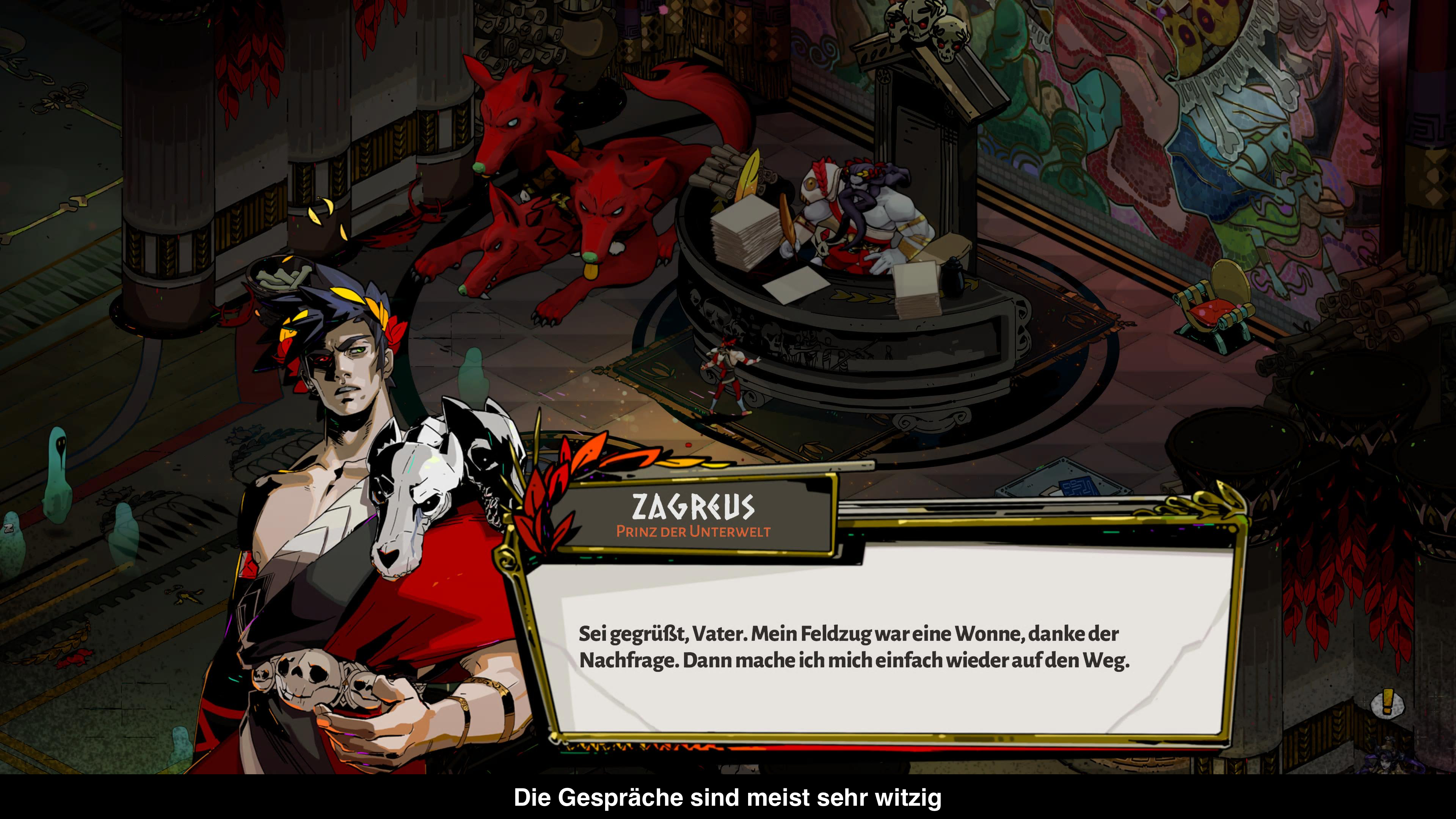 In Hades übernehmt ihr die Rolle von Zagreus, dem Sohn von Hades. Hades ist hierbei der griechische Gott der Unterwelt und Zagreus möchte endlich aus der Hölle fliehen und an die Oberfläche gelangen. Hades gefällt diese Idee aber gar nicht und so macht er Zagreus die Flucht so schwer wie möglich. Während eurer Fluchtversuche trefft ihr auf allerhand Figuren aus der griechischen Mythologie und dabei bestechen die Dialoge durch Wortwitz und eine generelle Lockerheit. Das Spiel und insbesondere Zagreus nehmen sich nicht zu sehr ernst, was es leicht macht der Geschichte zu folgen. Mit jedem Fluchtversuch lernt man mehr über die Beziehungen der Figuren und Zagreus eigenes Schicksal kennen und so offenbart sich eine doch durchaus interessante Geschichte.