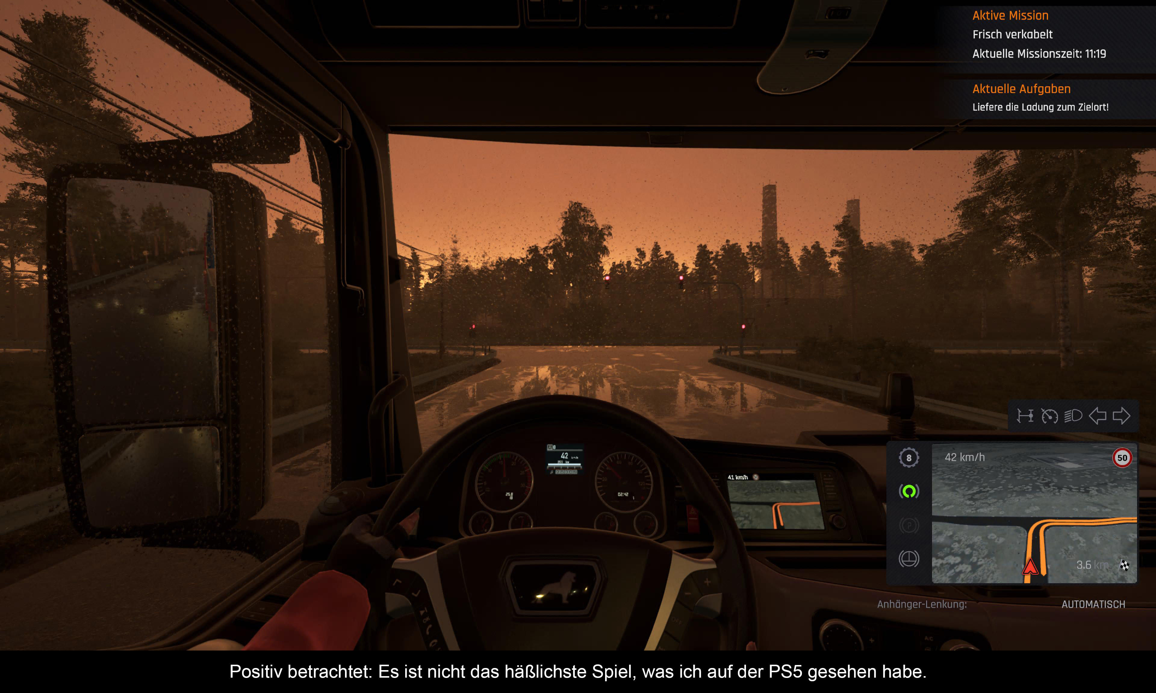 Was die Grafik betrifft, sollte man keine zu großen Erwartungen an das Spiel haben. Heavy Cargo, welches mit Hilfe der Unity Engine entwickelt wurde, bietet eine recht durchschnittliche Optik, die nur gelegentlich mit recht einigen wenigen netten Licht- und Wettereffekten überrascht. Immerhin sind wenigstens die Fahrzeugmodelle recht hübsch und detailliert. Allerdings wirken die Landschaften in Heavy Cargo an vielen Stellen eher unspektakulär und eintönig. Zwar überzeugen einige detailreiche Umgebungen, wie die Innenstädte, doch viele Bereiche der offenen Welt – zum Beispiel die endlosen grauen Autobahnen, die kahlen Industrieareale oder die monotonen, sich wiederholenden Gebäude – wirken leider eintönig und lassen Abwechslung vermissen. Texturen können in diesen Bereichen veraltet oder weniger lebendig wirken, was die visuelle Vielfalt und den Reiz der Erkundung schmälert. Zusammenfassend kann man sagen, dass die Optik das Mindestmaß an Erwartungen gerade noch so erfüllt. Dies liegt unter anderem auch an den kurzen Ladezeiten und der stabilen Framerate, was ja bei den Simulatoren-Spielen ja auch nicht immer der Fall ist. Und was den Sound angeht, fallen hier vor allem die authentischen Motorengeräusche auf. Allerdings wiederholen sich die Umgebungsgeräusche wie Vogelzwitschern oder Verkehrslärm oft und wirken stellenweise monoton. Die Hintergrundmusik ist dezent, wird aber schnell unauffällig, was für lange Fahrten etwas mehr Dynamik vermissen lässt. Hier lobe ich mir die Spotify-Funktionalität der PS5, die etwas Abwechslung in den Spiel-Alltag bringt. Insgesamt lassen sich Grafik und Sound als funktional, aber ohne große Highlights beschreiben.