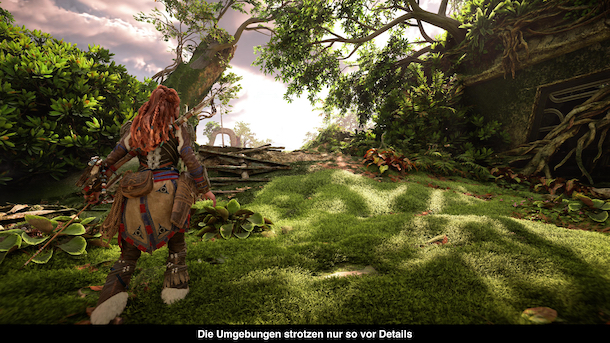 Technisch macht Horizon: Forbidden West einen sichtbaren Sprung, vor allem auf der PlayStation 5. Das fängt schon bei den Charakteren an, die nun noch deutlich mehr Details besitzen. Bei Aloy erkennt man sogar die Gesichtshärchen und Skin-Shader sind durch die Bank weg verbessert worden. Überhaupt wurden wirklich alle Charaktere mit viel Liebe zum Detail gestaltet, das gilt auch für so ziemlich jeden noch so unwichtigen Charakter dem man in der Welt begegnet. Dazu trägt auch das hervorragende Motion Capturing für alle Szenen bei, was die Gespräche deutlich lebhafter wirken lässt als noch im Vorgänger. Aber auch die Umwelt strotzt nur so vor Details. Die ganze Welt ist überwuchert von Pflanzen, die Schatten spielen realistisch im Licht und sogar das Wasser sieht endlich realistisch aus. Leider gibt es hin und wieder doch etwas Pop-In, was öfters in den Zwischensequenzen nach einem Kamerawechsel passiert und doch stört. In diesen Szenenwechseln drehen oft auch Aloys Haare völlig ab und wackeln wild umher. Überhaupt sind Aloys Haare vielleicht etwas zu lebendig und wackeln quasi konstant umher und erzeugen dabei sogar einiges an Clipping in vielen Szenen. Clipping ist generell ein Problem, insbesondere beim Klettern. Regelmäßig verschwindet etwas von Aloy in der Wand oder beim Sprung an Leitern schwingt sie einfach hindurch. An sich nichts dramatisches, aber man ist mittlerweile besseres gewohnt. Ansonsten sei gesagt dass das Spiel über zwei Grafikmodi verfügt. Im Auflösungsmodus läuft das Spiel in 4k mit 30 Bildern pro Sekunde was zu einem wirklich scharfen Bild führt und im Framerate-Modus läuft das Spiel mit hochgerechneten 1800p und 60 Bildern pro Sekunde. Die höhere Bildrate macht sich beim Spielen positiv bemerkbar, leider wirkt das Bild nicht mehr ganz so scharf und auch insgesamt viel unruhiger.