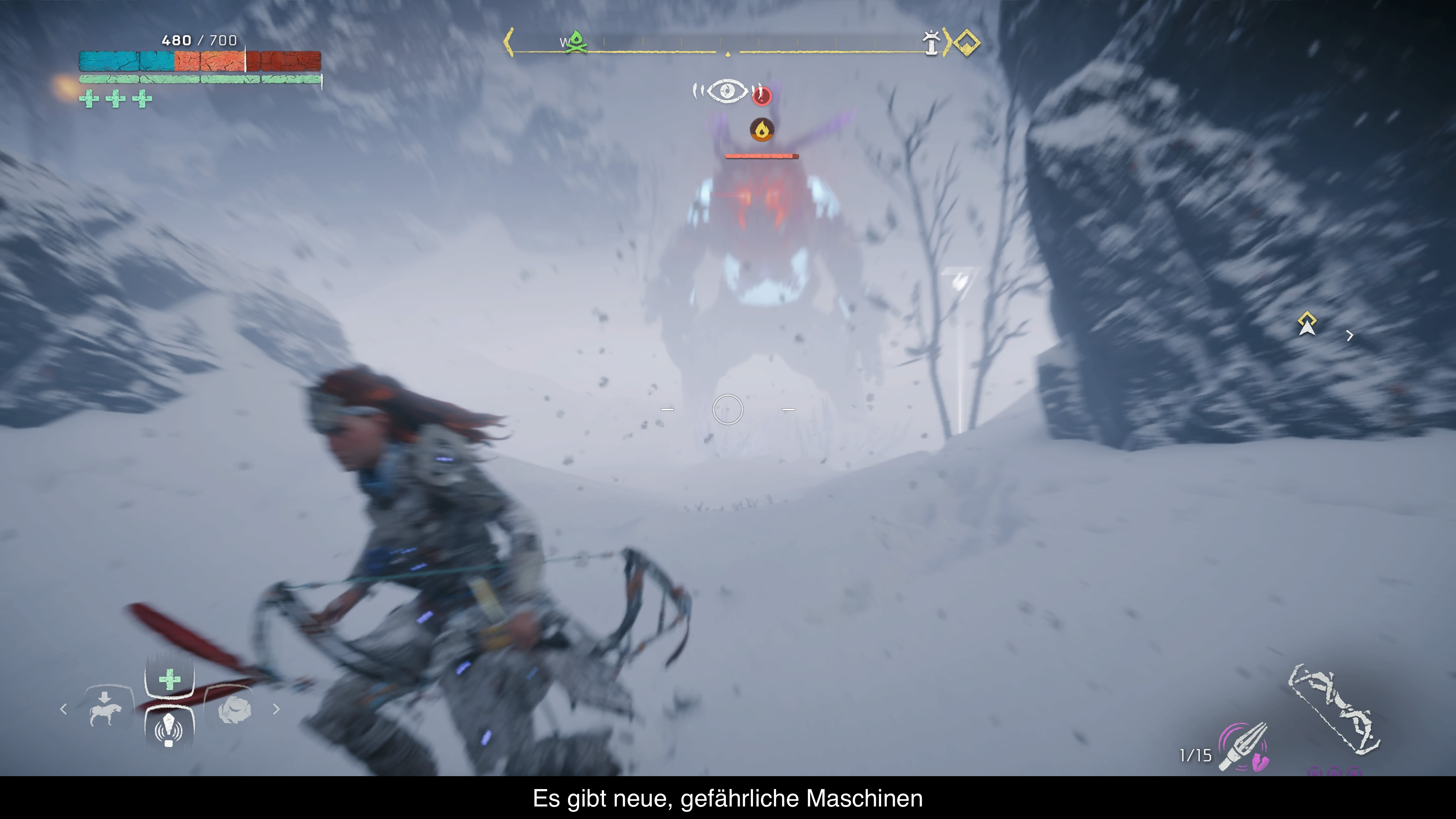 Spielerisch sollte man von der Erweiterung keine Überraschung erwarten. Aloy kann weiterhin auf ihre Geräte und Fähigkeiten aus dem Hauptspiel zurückgreifen, erhält aber auch die Möglichkeit ihr Repertoire zu erweitern. Beispielsweise gibt es drei neue Waffen, der Stab kann mit Modifikationen verstärkt werden und neue Fähigkeiten, sowie ein neues Level-Cap von 60 gibt es auch. Wer sich nach mehr Maschinenarten gesehnt hat, wird in Frozen Wilds auf seine Kosten kommen. Insgesamt gibt es drei neue Maschinen, wovon zwei aber nur je ein anderes Element nutzen. Trotzdem sind die Maschinen gelungen und bieten eine echte Herausforderung für Veteranen. Etwas uninspiriert ist jedoch, dass es nun statt “verdorbenen” Maschinen, “dämonisierte” gibt. Am Ende des Tages hat dies den gleichen Effekt.