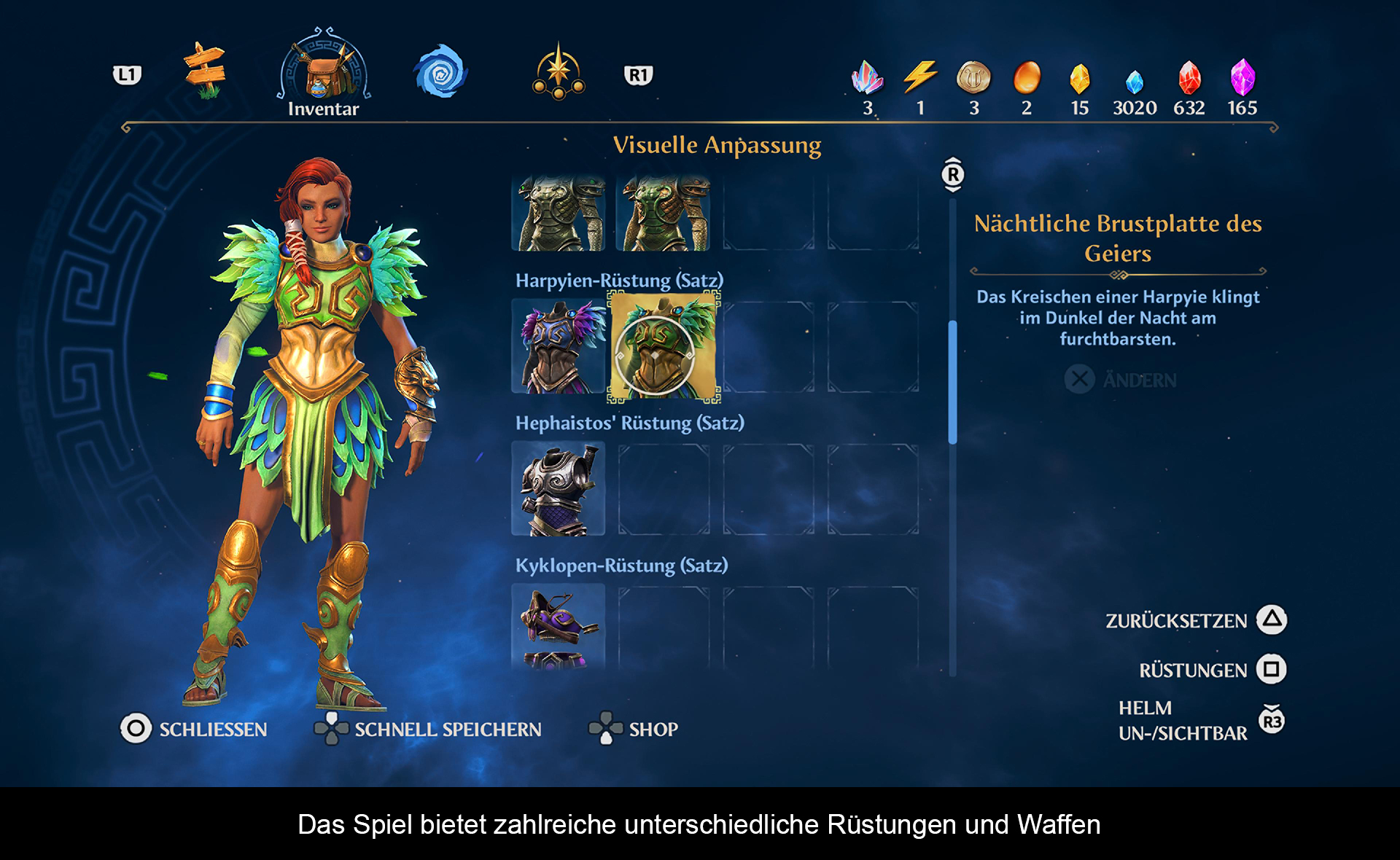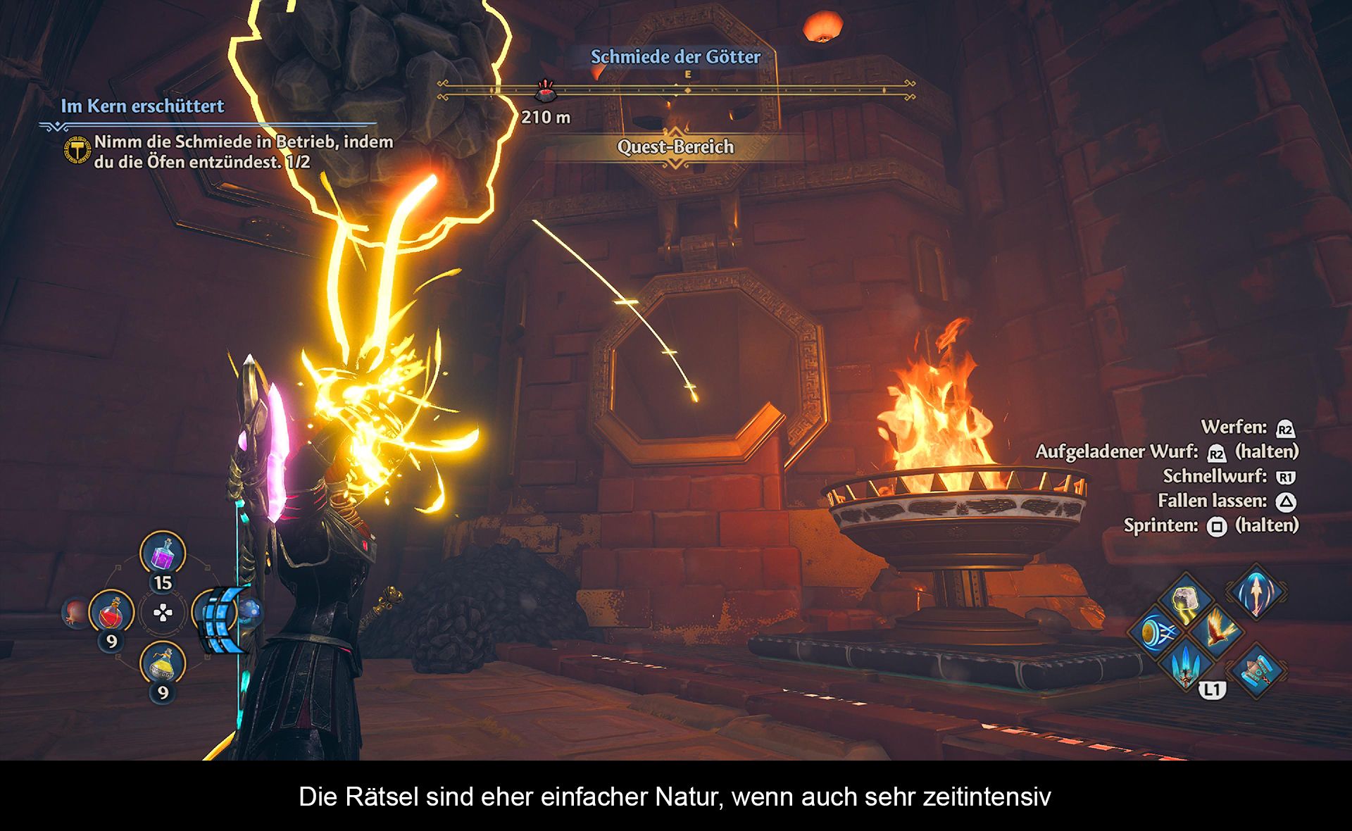 Das Kampfsystem basiert auf leichten und schweren Attacken. Schwere Angriffe mit der Axt füllen eine Betäubungsleiste beim Gegner. Ist diese voll, geht der Schurke zu Boden und wird ein leichtes Ziel. Die Ausdauerleiste ist zudem mit den göttlichen Kräften verbunden. Fenyx kann so den mächtigen Hammer Hephaistos oder die Speere von Ares beschwören. Ihre Waffen verfügen zudem über eine unbegrenzte Haltbarkeit. Interessant ist die gewählte Steuerung. Standardmäßig befinden sich leichte und schwere Angriffe auf den R1/R2 Tasten. Anfangs etwas ungewöhnlich, aber mit der Kombination der unterschiedlichen Götterkräfte entsteht ein sehr flüssiges und eingängiges Kampfsystem, dass selbst nach zahlreichen Kämpfen nicht langweilig wird. Übrigens signalisieren die Gegner deutlich ihre Angriffe und mit etwas Feingefühl kann man denen auch problemlos ausweichen oder sie parieren. Sollte man doch einmal in Bedrängnis geraten, gibt es vier unterschiedliche Tränke, welche die Lebensenergie wieder auffüllen oder Boni auf Angriff und Verteidigung geben. Jeder erfolgreich bestrittene Kampf und jede erbeutete Kiste belohnen den Spieler mit Kristallfragmenten, die in Waffenupgrades gesteckt werden können. Im Lauf des Spieles findet man zahlreiche Waffen- und Rüstungsteile, welche unterschiedliche Boni besitzen. Daneben gibt es noch einen Fähigkeitsbaum für die göttlichen Kräfte und verschiedenen Angriffsarten. Diese notwendigen Punkte in Form von Münzen findet man überall, sofern man besondere Aufgaben erfüllt.