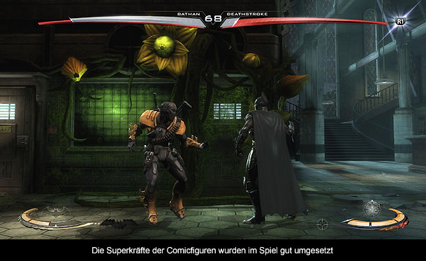 Bei einem Spiel wo es um übermächtige Helden und Schurken geht, darf eine geplante Zerstörungsorgie nicht fehlen. Für die verschiedenen Arenen hat man sehr viel Zeit investiert und diese weisen unterschiedliche Zerstörungsgrade auf. Je weiter der Kampf voranschreitet, desto mehr gehen im Hintergrund Objekte und Gebäude zu Bruch. Auch die Levelübergänge sind nicht minder beeindruckend. Hier wird der Gegner quer durch Arkham Asylum geschleudert oder mal quer durch die Festung der Einsamkeit. Man kann sich immer sicher sein, dass im Hintergrund etwas geschieht. DC Fans werden bei diesen Arenen ihre wahre Freude haben, denn diese sind ohne Ende mit Easter Eggs geschmückt. Doomsday in der Festung der Einsamkeit, Mr. Terrific im Wachturm, Darkseid bei einem Levelübergang und noch viele mehr. Über das Design der Helden und Schurken lässt sich streiten. Supermans neue Speedo ist etwas sehr gewöhnungsbedürftig, dafür glänzt Deathstroke mit einer beeindruckenden Rüstung. Dem einen Spieler wird es gefallen, dem anderen nicht. Einzig bei den Damen dürfte sich jeder einig sein. NetherRealm Studios scheint nicht in der Lage zu sein die weiblichen Geschöpfe richtig zu formen. Wonder Woman gleicht mehr einen Mann als einer Frau. Abseits derDesignschwächen bei den Charakteren gibt es technisch nicht viel zu bemängeln. Trotz der Gewaltorgie im Hintergrund und einer Vielzahl von Objekten auf dem Schirm, stemmt das Spiel ohne Problem 60 Bilder pro Sekunde und 1080p. Natürlich darf man hier nicht außer Acht lassen, dass es sich nur um eine grafisch aufgearbeitet PS3 Version handelt, welche auch schon 60 Bilder pro Sekunde schaffte.