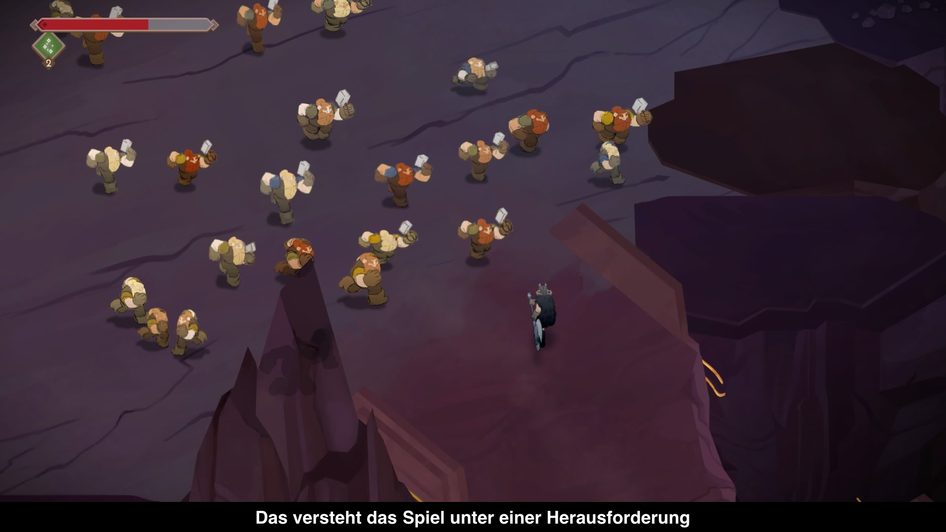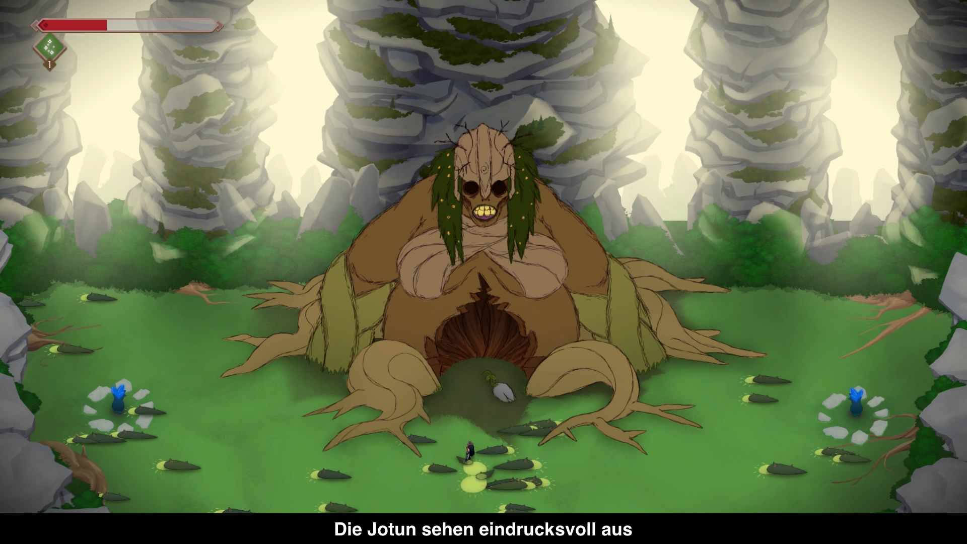 Grafisch bekommt man mit Jotun einen wirklich schön anzusehenden Grafikstil geboten, der aus handgezeichneten Sprites besteht. Die Welt und die Gegner sind liebevoll gestaltet und vor allem die Jotun sind beeindruckend. Allgemein ist die ganze Atmosphäre interessant mit der bedächtigen Musik im Hintergrund, den vielen Infos zu der nordischen Mythologie und einer nordischen Sprache.