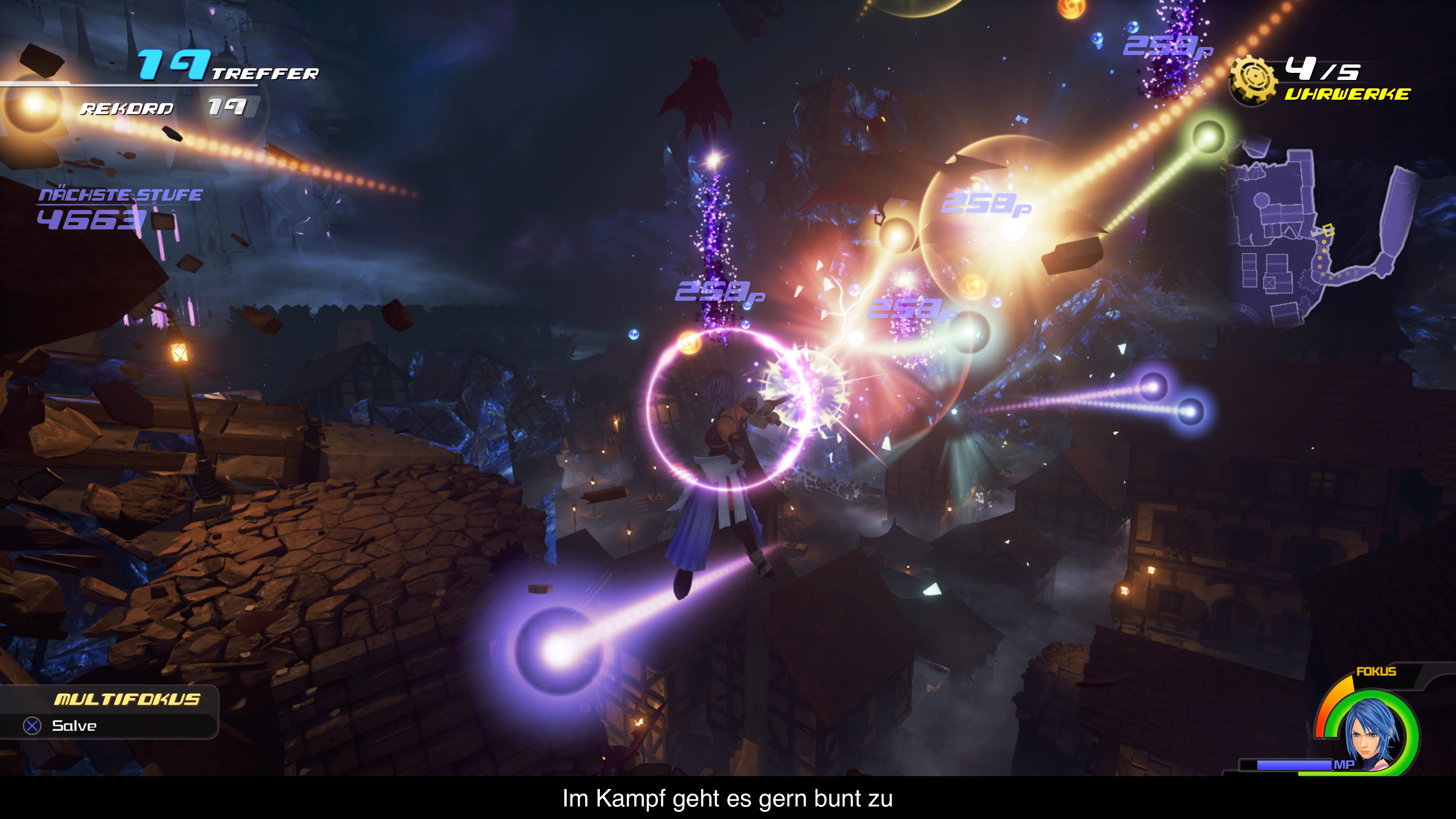Auch hier gibt es spielerisch wenig überraschendes. Jedoch stellt sich Kingdom Hearts 0.2 Birth by Sleep - A Fragmentary Passte deutlich linearer dar, als andere Spiele der Serie. Es gibt keine unterschiedlichen Welten oder überhaupt größere Interaktionen mit anderen Charakteren und so ist Aqua auf sich allein gestellt, um das Geheimnis der Schattenwelt zu lüften. Dazu beginnt man mit ihr bereits auf Level 50 und hat Zauber, wie Blitzga oder Vigra zur Verfügung, was die Sache etwas einfacher macht. Hier merkt man auch die Neuentwicklung, da sich das Spiel bzw. Gameplay deutlich flüssiger im Kampfablauf anfühlt, als z.B. noch bei Dream Drop Distance. Eine neue Fähigkeit ist der Fokus-Angriff, womit man mehrere Gegner anvisieren kann, um anschließend einen mächtigen Angriff gegen alle auszuführen. Zudem füllt sich beim Kämpfen eine Kombo-Leiste, die je nach Kontext dann eine Spezialfähigkeit freischaltet. So ändert sich dann euer Kampfstil etwas oder aber ihr könnt noch mächtigere Zauber ausführen. Zudem gibt es im Spiel Aufgaben, wie „Besiege 50 Herzlose“, die allesamt Kleidungsstücke für Aqua freischalten, womit ihr ihr Aussehen an eure Wünsche anpassen könnt.