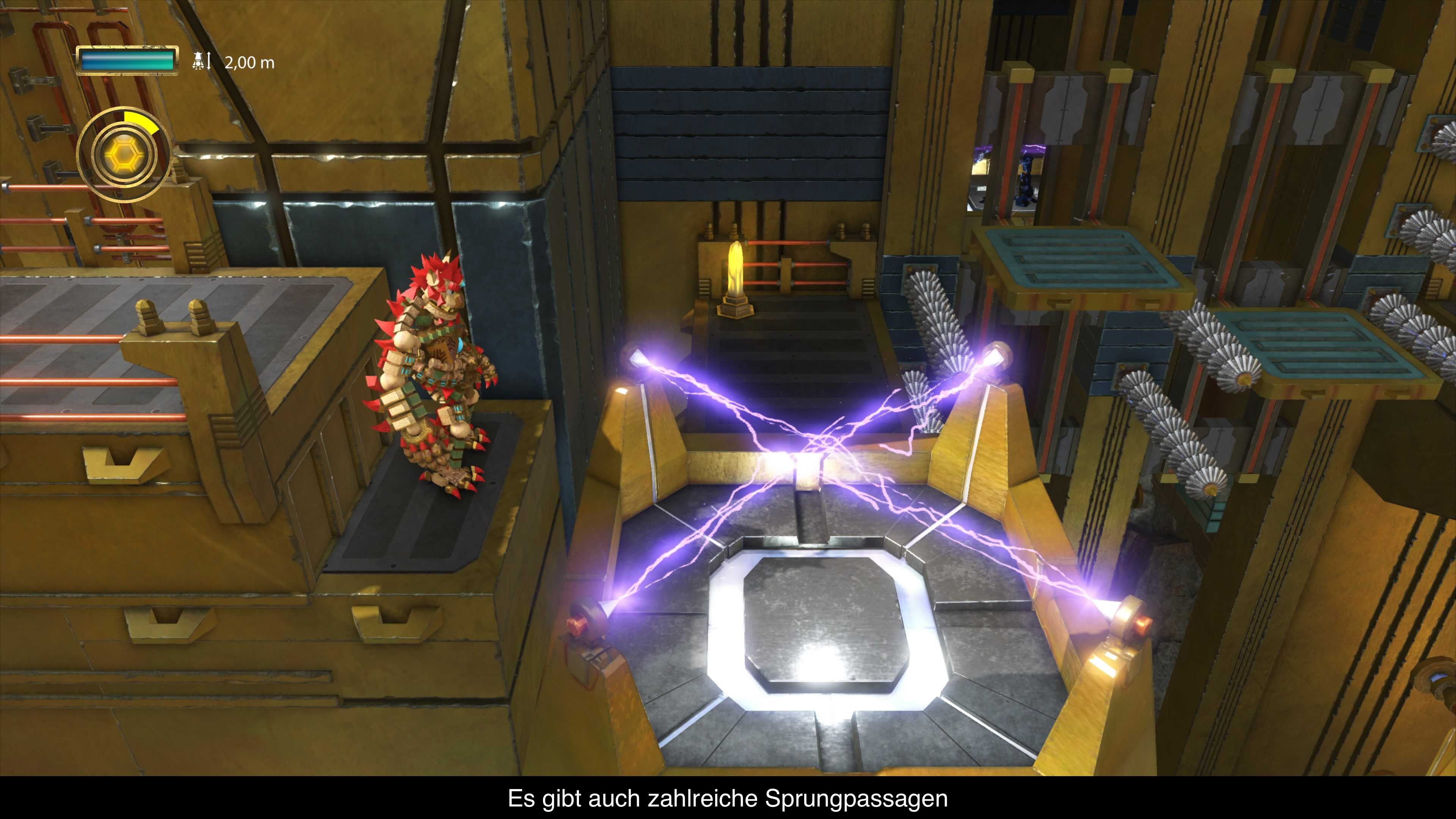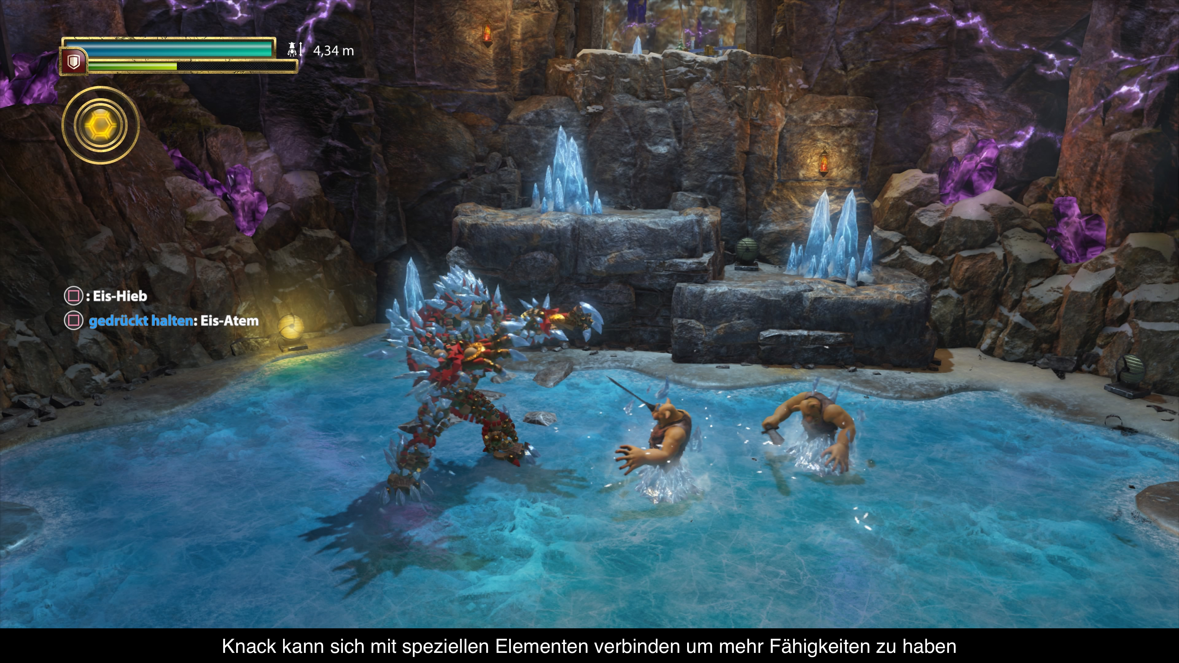 Übrigens verändert Knack im Spiel wieder seine Größe. Immer wieder findet man Relikte, welche Knack wachsen lassen, was ihn wiederum auch stärker macht. Wird man getroffen, verliert man Relikte, erhält sie nach einer kurzen Pause aber wieder zurück. Wer möchte kann Knack durch einen Tastendruck auch ganz klein werden lassen, was gerne bei den zahlreichen Sprungpassagen genutzt wird. Mal braucht man den kleinen Knack, um durch Luftschächte zu laufen und mal den großen, um Steine zu verschieben. Leider ist der Weg immer recht offensichtlich und lädt auch selten zum Erkunden ein. Die Kletterpassagen sind auch wenig anspruchsvoll, wie auch die Puzzles. Hier merkt man, dass das Spiel sich an ein jüngeres Publikum richtet. Dabei wäre etwas mehr Freiheit mit dem Spielprinzip sicherlich nicht zu viel. Wer möchte kann das Spiel auch wieder komplett im Coop spielen. Dann erscheint einfach ein zweiter, silberner Knack auf dem Bildschirm und der Rest bleibt gleich.