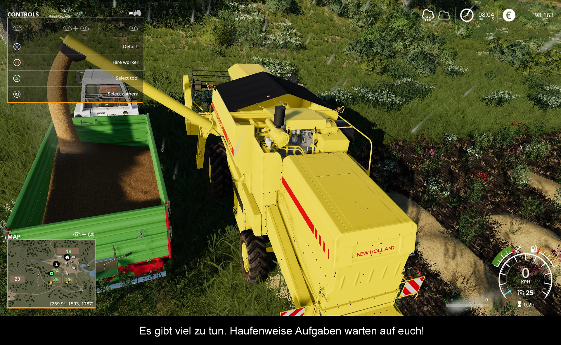 Das Spiel begrüßt einem zunächst erstmal mit einem action-geladenen CGI-Intro, wo die Landwirtschaft als atemberaubendes Abenteuer präsentiert wird, inklusive wilder Traktor-Wettrennen. Doch wie man schon im Hauptmenü feststellen wird, ist der tatsächliche Ablauf viel - vieeeeeel – gemächlicher. Zunächst bietet einem Landwirtschafts-Simulator 19 drei verschiedene Spiel-Varianten an, die jeweils für verschiedene Schwierigkeitsgrade stehen. Während man als motivierter Bauer entweder von null anfangen kann – also ohne Land und ohne Maschinen, aber dafür mit reichlich Geld – empfehle ich Neueinsteigern wie meine Wenigkeit, den vorangeschrittenen Modus auszuwählen. Hier bekommt man von Beginn an nicht nur seine eigene Farm vorgesetzt, sondern auch kleines aber feines Tutorial. Landwirtschafts-Simulator 19 ist bekannt dafür, unzählige Einstellungsmöglichkeiten und Optionen zu bieten. Aus diesem Grund ist es empfehlenswert, sich zunächst einmal mit den Grundlagen des Spiels zu beschäftigen. Dies umfasst das Ernten von Produkten, das Sähen von Samen, das Bearbeiten der Felder als auch den Transport eurer Waren. All dies und mehr erlernt man zu Beginn des Spiels. Obwohl das Anfangs-Tutorial einen recht gut Job macht, muss ich jedoch zugeben, dass ich mich kurz danach etwas alleingelassen gefühlt habe. Während andere Games mit viel zu langen Tutorials nerven, hätte ich nichts dagegen, wenn dieser Bereich hier etwas umfangreicher wäre. Landwirtschafts-Simulator 19 besitzt haufenweise Features, die man jedoch größtenteils selber herausfinden und anwenden muss. Und das ist sicherlich nicht jedermanns Sache.