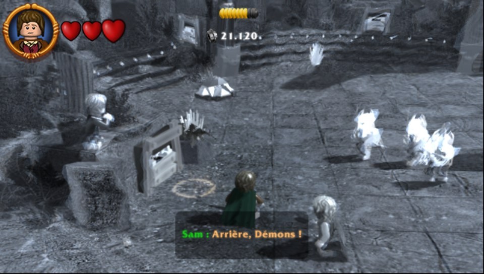 Während man auf den Heimkonsolen mit neuen Gameplayelementen experimentiert, bleiben die Handheld Spiele der bekannten Formel treu. Immer noch stehen euch im Spiel zwei aktive Figuren zur Auswahl, welche über bestimmte Fähigkeiten verfügen. Legolas z.B. kann entfernte Ziele mit seinem Bogen treffen, während Gandalf mit Magie Objekte repariert. Wer die anderen Recken benötigt, kann mit der Schultertaste eine neue Figur auswählen. Im Team arbeitet man sich so durch die Levels und löst kleinere Aufgaben und schaltet neue Figuren frei. Neu hingegen ist das finden von Schätzen, welche die Einwohner von Mittelerde suchen und euch fürstlich mit roten Steinen belohnen, die ihr für Extras benötigt. Hier wären wir bei einer der wenigen Neuerungen. Erstmalig gibt es nicht nur eine Hubwelt, sondern gleich mehrere. Die Reise führt so nach Bruchtal, Helms Klamm und Minas Tirith. Diese Level sind Bestandteil der Geschichte und dienen nach dem Durchspielen als die eigentliche Levelauswahl. Neben den Bewohnern für die Rückgabe der Schätze findet man dort aber auch vier kurzweilige Minispiele, wie z.B. das Reiten auf einem einem Pferd. Mit all diesen Änderung scheint es, als wäre man auf dem richtigen Weg zu einem ordentlichen Handheld Titel, doch dies ist definitiv nicht der Fall. Das liegt unter anderem daran, dass man immer nur mit den neun bekannten Hauptcharakteren aus den Filmen unterwegs ist, worunter die Abwechslung in den Aufgaben stark zu leiden hat. Schnell stellt sich ein Rhythmus ein und man ist in der ewig gleichen Abfolge von "Gegner besiegen, Hebel holen, Hebel umlegen und weitergehen" gefangen. Selbst das experimentieren mit andern Charakteren schafft keine Abwechslung, da sich diese kaum von den Helden der Ringgemeinschaft unterscheiden. Ein weiterer Reinfall sind die Endgegner, selten wird dem Spieler erklärt wie diese zu besiegen sind. Selbst wer die richtige Taktik gefunden hat, muss danach mehr mit dem mieserablen Gameplay, als mit dem Endgegner kämpfen.