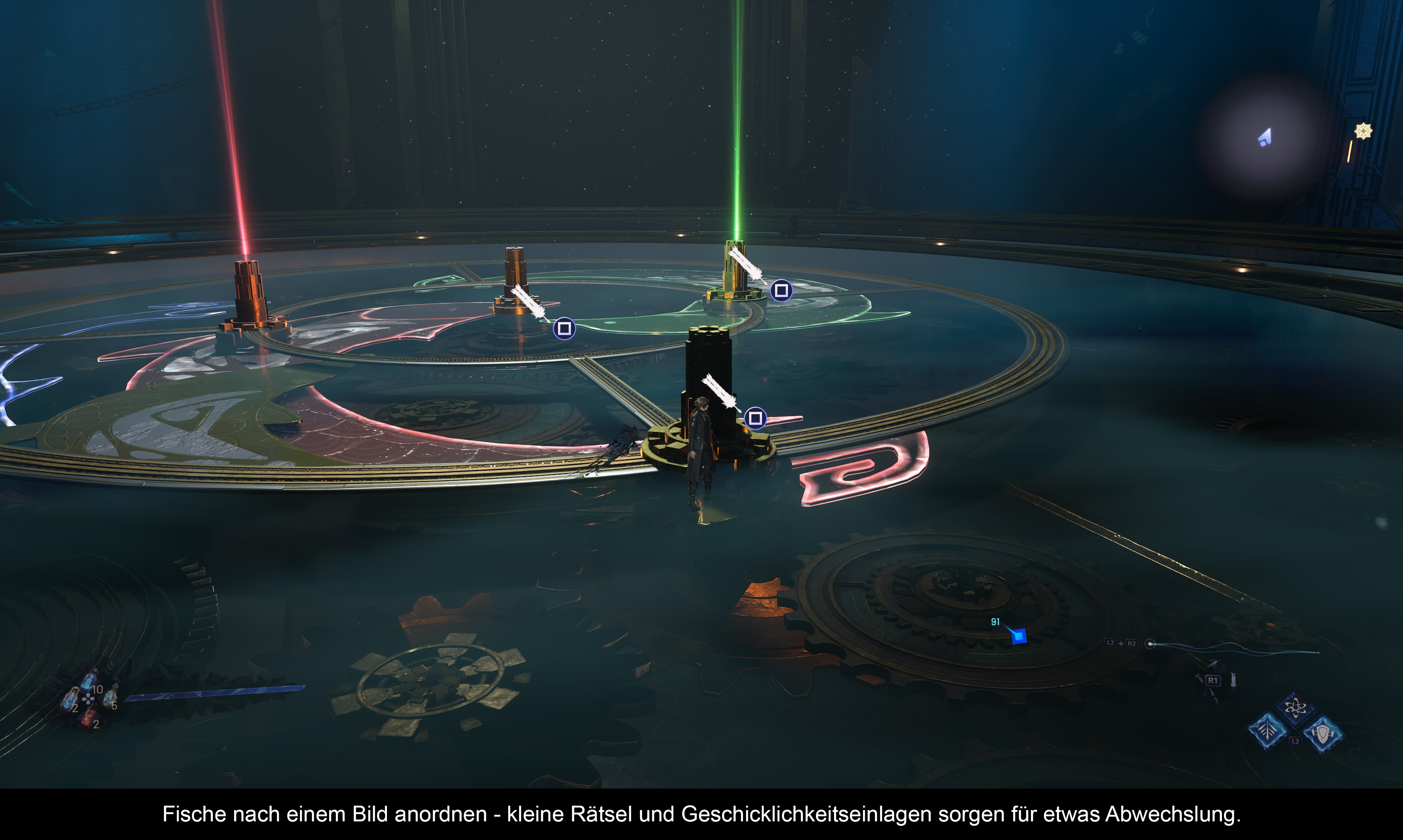 Der Titel läuft auf Basis der Unreal Engine und sieht zumindest im Profi-Performance-Modus der PS5 Pro ziemlich fabelhaft aus. Vor allem der IQ ist bei 60 fps ausgesprochen gut. Weniger schön sind hingegen fragwürdige Designentscheidungen wie das Ruckeln der Kamera beim Rennen, die harten Cuts zwischen Spiel- und Videosequenz, kurze Aussetzer beim Nachladen neuer Abschnitte, die lausigen Gesichtsanimationen, die vielen fehlenden Soundeffekte und die oftmals schlichtweg unpassende und austauschbare Musik. Dabei sind einige Bosse wirklich abwechslungsreich in Szene gesetzt, die Landschaften sind durchaus eine Augenweide und der phantasievolle Stil mit seinen Sci-Fi-Elementen weiß allgemein zu gefallen. Auch wenn der Spieler dabei in vielerlei Hinsicht an „Final Fantasy XV” erinnert wird. Die englische Sprachausgabe ist richtig schlecht und dilettantisch. Die Sprecher geben sich nicht einmal ein bisschen Mühe! Wem das stört, kann zumindest noch mit chinesischem Ton spielen. Die Soundabmischung selbst lässt ebenfalls zu wünschen übrig, denn die vielen Kämpfe kommen alles andere als wuchtig rüber.