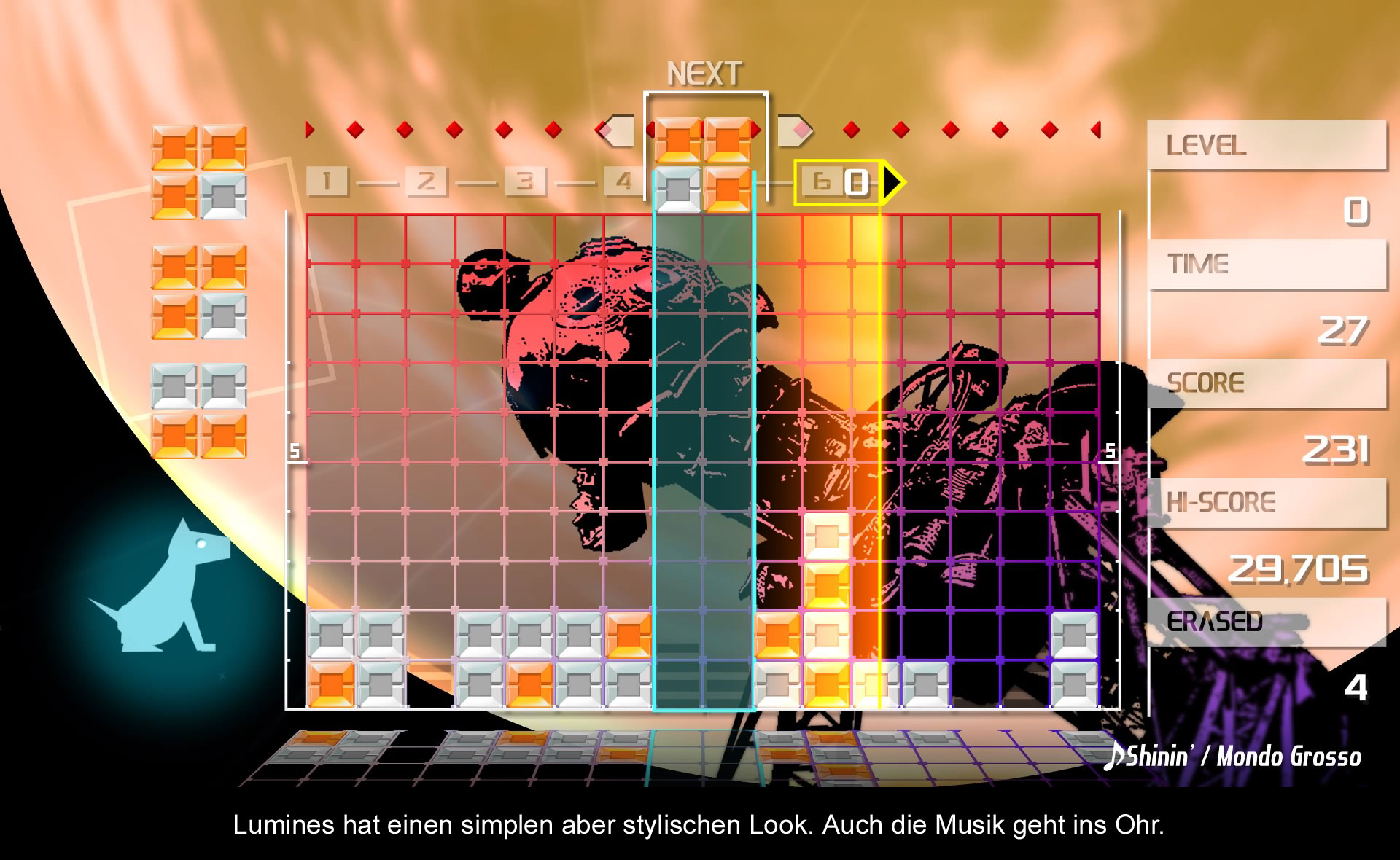 Das Besondere an Lumines ist jedoch die Musik, die den Rhythmus des Spielgeschehens vorgibt. Es ist schwer in Worte zu fassen, aber sowohl die von oben herabstürzenden Tiles als auch der Faden, der sich von links nach rechts über den Bildschirm bewegt, arbeiten im Wechselspiel mit der grandiosen elektronischen Musik (und auch der Rumble-Effekt des Dual Shocks vibriert gemeinsam mit der Musik). Und sobald man dieses Momentum verinnerlicht hat, dauert es auch nicht lange, bis man seine Kombinationen selber im Rhythmus des Spiels zusammenbastelt. Und so wird auch die Jagd nach neuen Punkterekorden nie langweilig. Dies liegt nämlich daran, dass man mit jeder angefangenen Minute ein wenig mehr über die Welt von Lumines kennenlernt.
