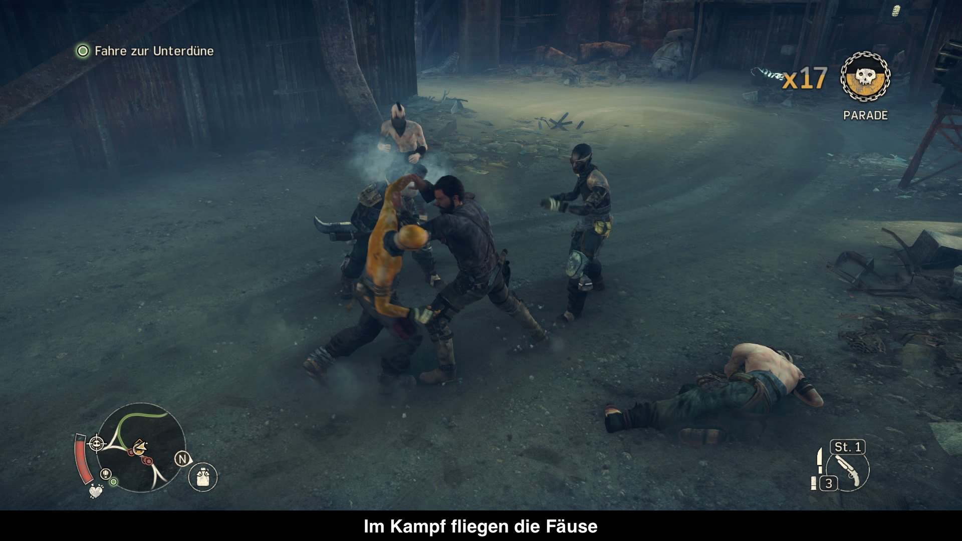 Spielerisch bekommt man mit Mad Max mal wieder ein Open World Spiel serviert. Ihr fahrt durch die post-apokalyptische Wüste mit Chumbucket und müsst für diverse Leute Gefallen tun, damit ihr selber eurem Ziel näher kommt. Dabei trifft man regelmäßig auf Scrotus Schergen, die euch ans Leder wollen. Kommt es zum Kampf könnt ihr euch auf eure Fäuste verlassen. Dabei erinnert das Kampfsystem erschreckend stark an Rocksteadys Batman Serie oder Mittelerde: Mordors Schatten. Mit Quadrat greift ihr also an und mit Dreieck werden Angriffe gekontert. Was einfach klingt, ist gar nicht so einfach, denn man muss den richtigen „Rhythmus“ im Kampf finden, um erfolgreich zu bleiben. Glücklicherweise könnt ihr auf Äxte oder eure Schrotflinte zurückgreifen, wenn es brenzlig werden sollte, jedoch ist Munition selten und ihr solltet euch gut überlegen, wann ihr sie einsetzen wollt. Wirklich nervig hierbei ist die Kamera, die vor allem in engeren Räumen eher hinderlich ist. Denn gerne werden angreifende Gegner aus dem Sichtfeld genommen und so hat man keine Chance zum Kontern. Übrigens trefft ihr auf Gegner nicht nur zu Fuß, sondern auch im Fahrzeug. Denn immer wieder trefft ihr auf Konvois auf den Straßen, die euch direkt angreifen werden. Dann könnt ihr euch zur Wehr setzen und während der Fahrt gegen sie kämpfen. Mit einer Harpune könnt ihr beispielsweise Türen herausreißen oder explodierende Stäbe auf sie werfen. Es ist aber auch möglich euer Fahrzeug zu tunen, damit es mit fiesen Stacheln oder anderen fiesen Gimmicks ausgestattet wird, die euch im Kampf helfen. Bis ihr aber wirklich stark seid, vergeht einiges an Zeit, denn für jedes Power-Up fürs Auto oder Max braucht ihr Schrott, der überall in der Welt verstreut ist. Leider ist er aber trotzdem noch so selten, dass es sehr lange dauert bis man einmal stark genug ist, um es mit mehreren Gegnern aufzunehmen oder das Fahrzeug vernünftig auf der Straße zu halten. Denn das Handling der Fahrzeuge ist insbesondere zu Beginn der Geschichte sehr schwammig und man bleibt gerne mal an diversen Gegenständen hängen. Ansonsten gibt es in der Welt einiges zu tun, denn neben den Haupt- und Nebenmissionen gibt es auch zahlreiche Collectibles, wie Türme die ihr zerstören müsst, Lager zum Ausräumen oder Ruinen zum Durchsuchen. Leider bieten die alle wenig Abwechslung und werden irgendwann etwas langweilig.