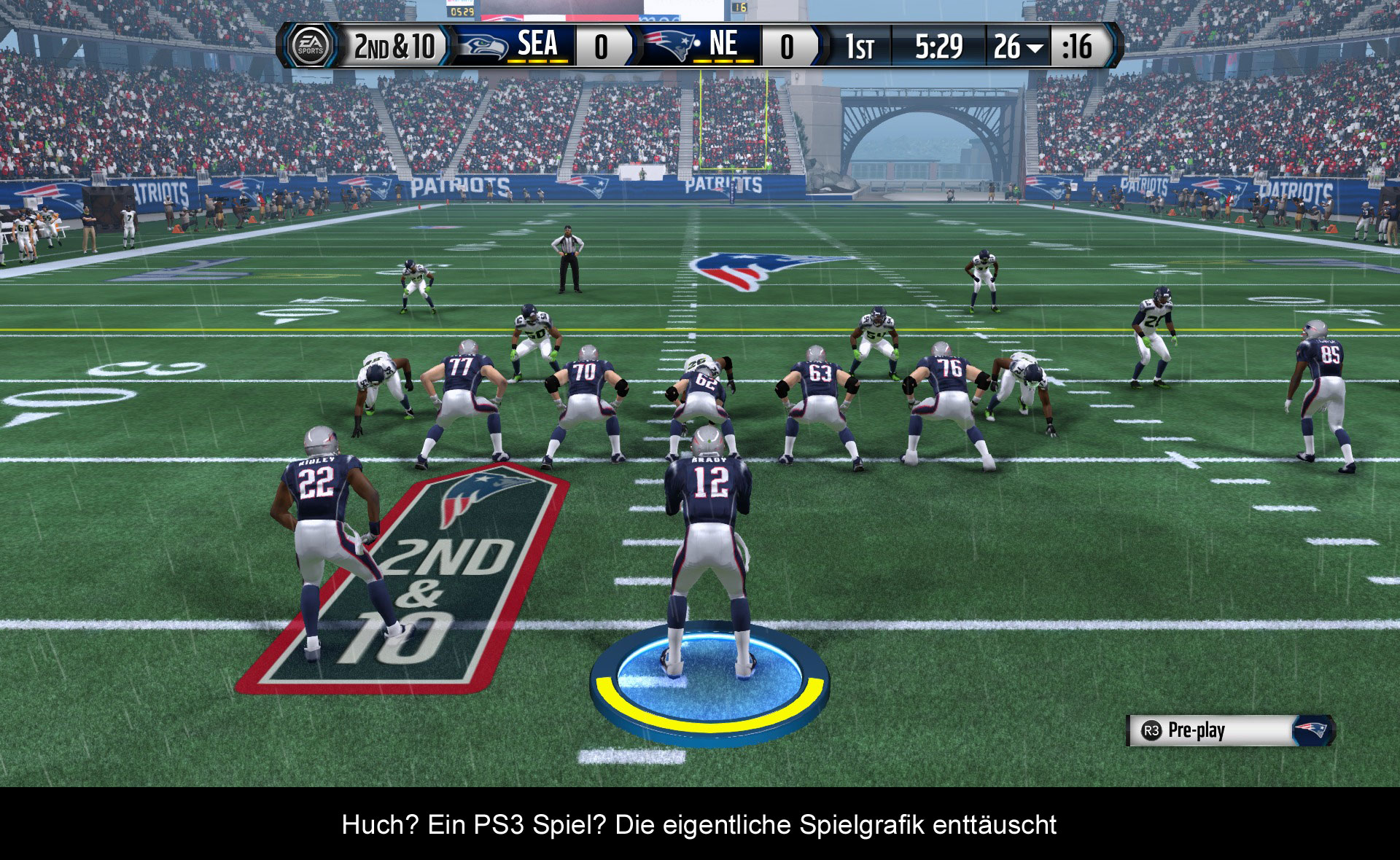 Die Kombination aus Madden und Next Gen erinnert Football Enthusiasten oftmals an das legendäre Madden-Teaser Video, welches EA damals vor dem Release der PS3 veröffentlicht hat. Und es spricht nicht gerade für EA, dass das damalige Video immer noch besser aussieht, als das was wir inzwischen auf der PS4 vorgesetzt bekommen. Gegenüber dem letztjährigen „Madden NFL 25“ überzeugt das Spiel jetzt durch eine saubere und flüssige Präsentation. Auch die Spieler wirken teilweise gut modelliert. Nichtdestotrotz kommt man einfach nicht von dem Gedanken los, dass der finale Schritt Richtung Next Gen immer noch nicht getätigt wurden. Obwohl die Stadien gut animiert sind, sehen die Fans immer noch sehr hässlich und teilweise sogar pixelig aus. Und auch die einzelnen Animationen sind meist noch sehr hakelig und alles andere als flüssig. Ein großes Lob hingegen verdienen die Wetter-Effekte. Vor allem die Spiele im Schnee sind ein echter Hingucker. Dies liegt insbesondere daran, dass sich der hektische Spielverlauf auch auf das Spielfeld auswirkt (zum Beispiel durch die Anhäufung von Fußabdrücken). Schaut man jedoch auch hier etwas genauer hin, lässt sich feststellen, dass selbst die Wölbungen im Schnee bei genauer Betrachtung etwas pixelig und unsauber sind. Obwohl Madden keinesfalls hässlich ist, ist es mit Sicherheit noch nicht das, was man sich zu Beginn dieser Generation erwartet hat. Insbesondere wenn man sich an das Ingnite Engine Teaser-Video erinnert, welcher ähnlich wie der zu Beginn angesprochene PS3 Trailer, eine nicht ganz realistische Vorschau auf die Zukunft der Serie präsentierte. Immerhin überzeugen wenigstens die Kommentatoren durch ein gelungenes Zusammenspiel, wodurch man ein einwandfreies TV-Feeling serviert bekommt. Hinzu kommen interessante Einspieler und wilde Kamerafahrten. EA weiß halt, wie man eine Lizenz voll ausnutzt.