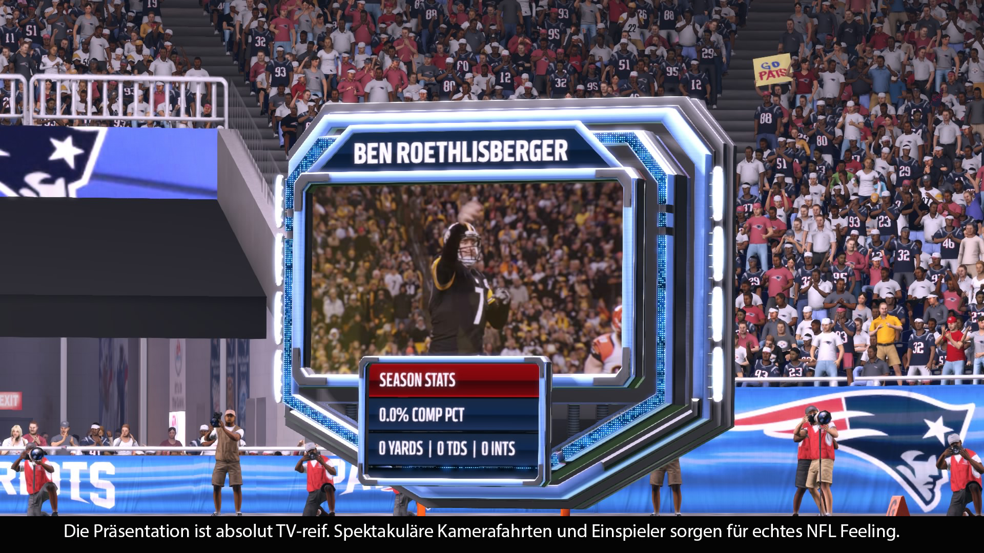 Was die Präsentation von Madden NFL 16 angeht, befindet sich EA ganz klar auf Referenz-Niveau. Angefangen mit den fantastischen und farbenfrohen Menüs bis hin zu den überragenden Einspielern vor und während der Spiele. Was EA bietet ist TV-reif und beeindruckend. Die EA Lizenz wird tatsächlich in ihrer ganzen Bandbreite ausgenutzt. Hinzu kommen authentische Stadien und superbe Wettereffekte. Die Matches selber laufen mit sauberen 60fps. Auch die Animationen wirken sehr rund und nicht mehr so hakelig, wie noch zu PS3 Zeiten. Abgerundet wird das Paket durch die englischen Kommentatoren, die sehr authentisch und motiviert wirken. Einzig die langen Ladezeiten sorgen für einige Abstriche in der B-Note.
