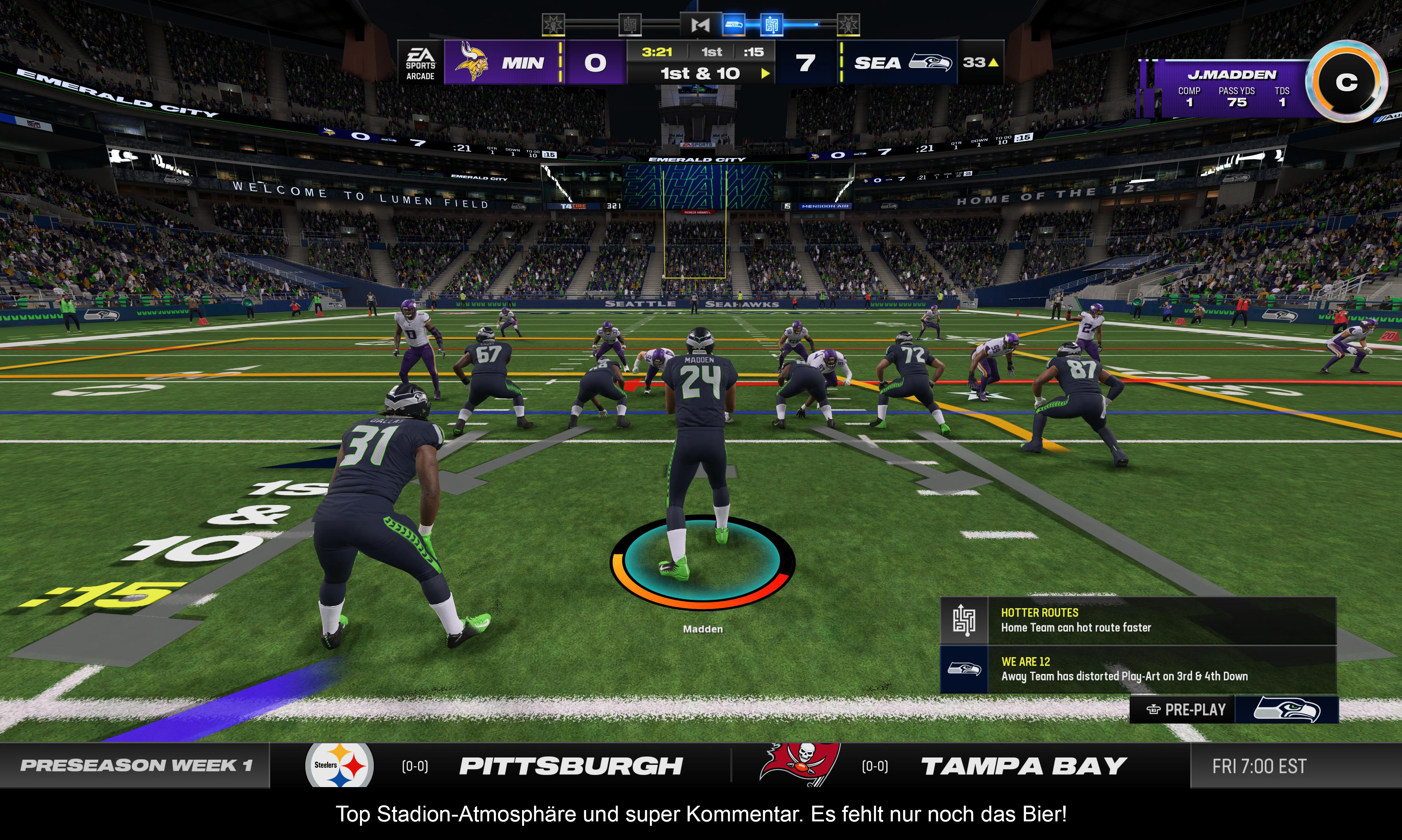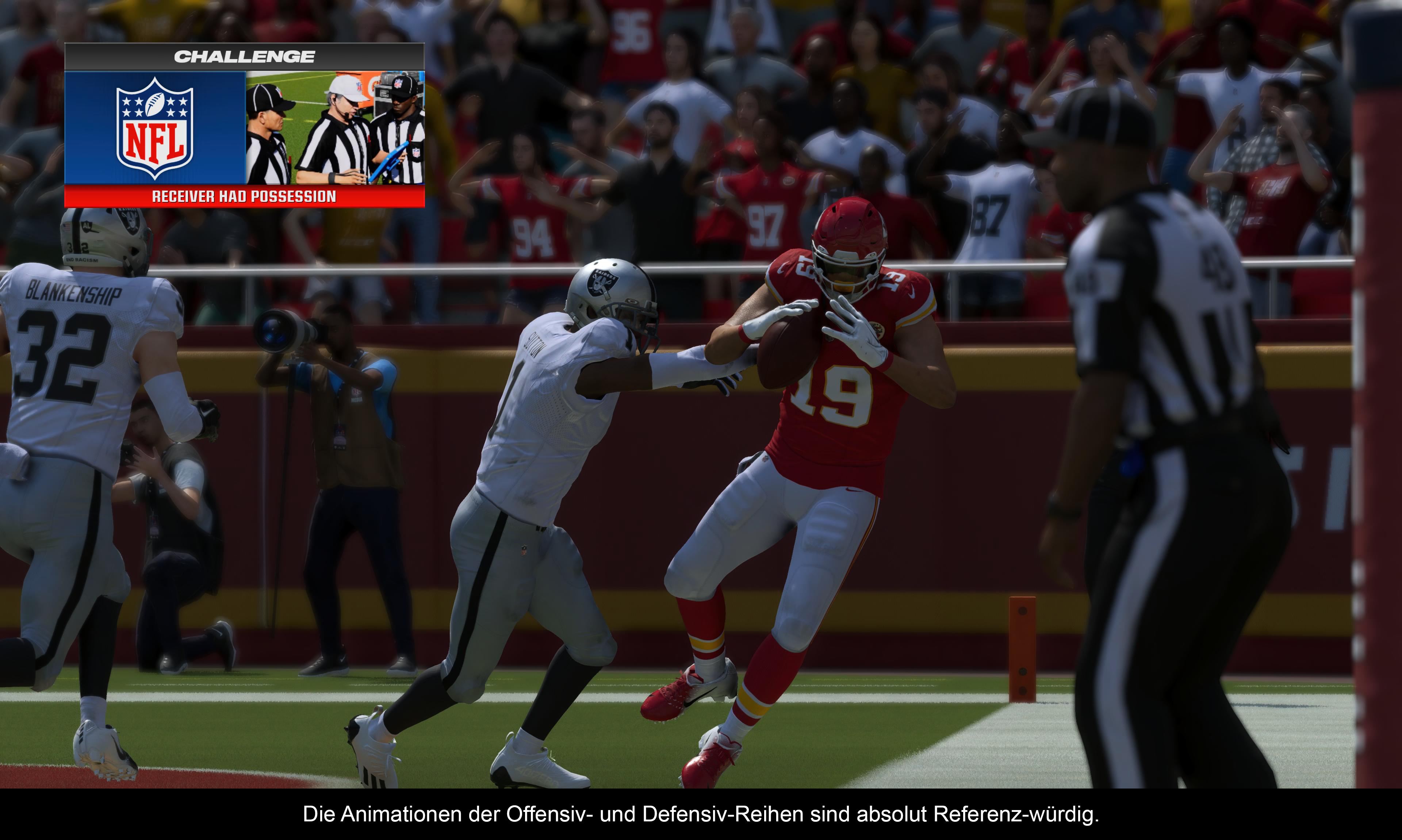 Und was das Gameplay angeht, lauten die diesjährigen Schlagwörter fieldSENSE & Character Technology. Im Grunde handelt es sich dabei um EAs eigene Animations-Engine, die jedem Spieler dabei hilft, anatomisch korrekte und realistische Bewegungen auszuführen. EA verspricht verbesserte Animationen in jederlei Hinsicht - egal ob für die Offensive oder für die Defensive. Und zugegebenermaßen wirken die Spieler enorm agil und lassen sich je nach individuellen Eigenschaften extrem gut und schnell über das Feld bewegen, während man mächtigen Tackles und sonstigen Angriffen aus dem Weg geht. Und obwohl ich kein Mitarbeiter von Digital Foundry bin, die technische Aspekte weitaus besser beschreiben können als ich - muss ich zugeben, dass Madden auf jeden Fall sehr rund und flüssig aussieht. Ab und zu treten zwar einige ClippingFfehler auf, aber angesichts der riesigen Menge an authentischen Animationen, lassen sich diese kleinen Mankos definitiv ertragen. Ein weiteres Feature, was mir sehr gefällt, sind die zahlreichen Einstellungsmöglichkeiten beim Gameplay. Da sicherlich nicht jeder alle Features von Madden auf Anhieb an verstehen wird, ist es umso erfreulicher zu sehen, dass man beispielsweise vorab auch einen simpleren Kontroll-Typ auswählen kann, der dem Spieler eine etwas einfachere und mehr Arcade-ähnliche Bedienung anbietet. Somit ist das Spiel nicht nur etwas für routinierte Profis, sondern auch frische Newcomer.