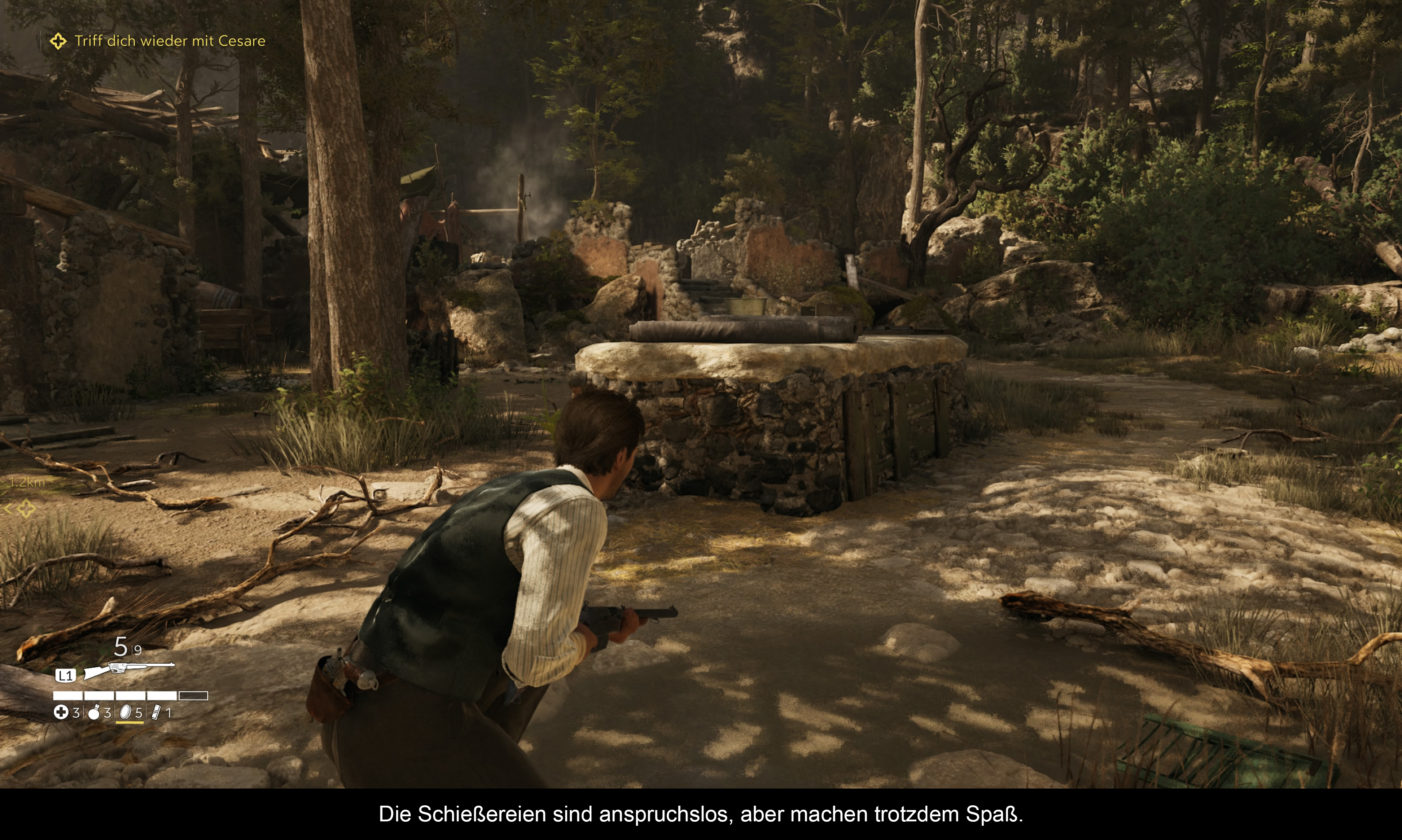 Alles in allem funktioniert es recht gut, auch wenn vereinzelte Schleichmissionen eher nerven als Spaß machen. Die Checkpoints sind fair gesetzt, sodass man auf mittlerem Schwierigkeitsgrad gut durchkommt. Die Messer-Duelle treten etwas zu oft auf, denn diese Mechanik ist nicht besonders komplex. Dafür sind Reiten und Autofahren gut umgesetzt. Rätsel gibt es keine, ebenso wenig rollenspielartige Dialoge oder Entscheidungen, die die Missionen oder das Spielende beeinflussen würden.