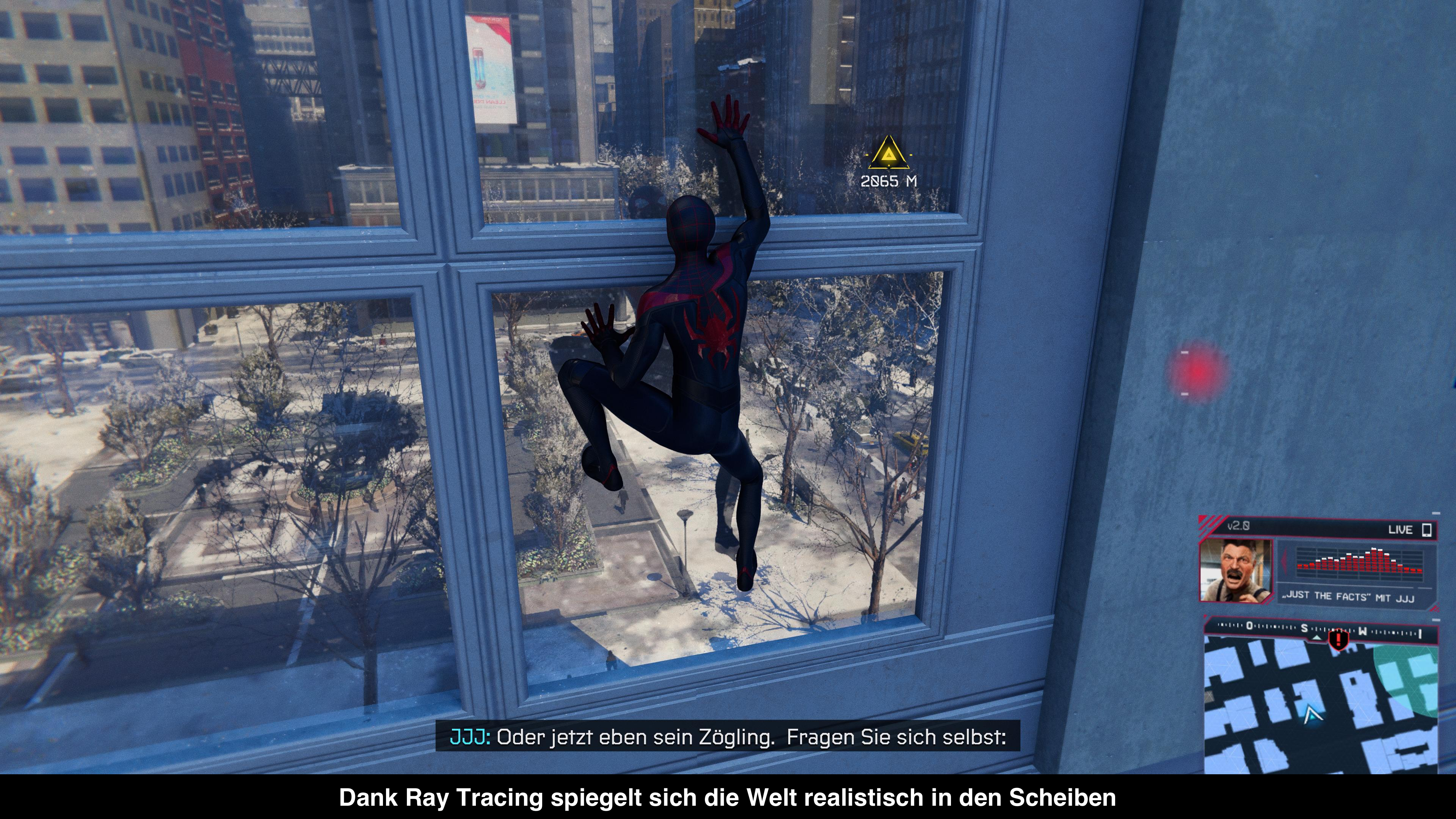 Auf der PlayStation 5 bietet Marvel`s Spider-Man: Miles Morales zwei Grafikmodi an. Der Performance-Modus stellt das Spiel mit 4k Auflösung und 60 Bildern pro Sekunde dar. Diese werden auch konstant gehalten und das Spiel büßt quasi nichts an seiner grafischen Pracht ein. Dafür gewinnt man an Präzision in Kämpfen und insgesamt fühlt sich das Spielgeschehen inkl. Schwingen einfach flüssiger an. Wer möchte, kann aber auch auf einen anderen Grafikmodus zurückgreifen. Hier läuft das Spiel ebenfalls in 4k, aber nur mit 30 Bildern pro Sekunde. Dafür sieht man erstmals auf einer Konsole Ray Tracing Effekte. Ray Tracing bezeichnet dabei eine Technik mit der realistische Spiegelungen, Lichteffekte, Schatten und vieles mehr dargestellt werden können, aber dafür auch sehr teuer und aufwendig ist. Hier merkt man dies in erster Linie an den Spiegelungen der Häuserwände, die nun realistisch den Verkehr, Passanten und auch andere Gebäude spiegeln. In einer Stadt wie New York macht sich das natürlich super. Zudem spielt das Spiel ja auch im Winter, wodurch viele Straßen mit einer leichten Eisschicht überzogen sind und spiegeln. Insbesondere nachts zeigt sich das Spiel von der eindrucksvollen Seite, wenn die vielen Lichtquellen mit den spiegelnden Oberflächen zusammenspielen und dann ein wahres grafisches Next-Gen Erlebnis auf den Bildschirm zaubern.