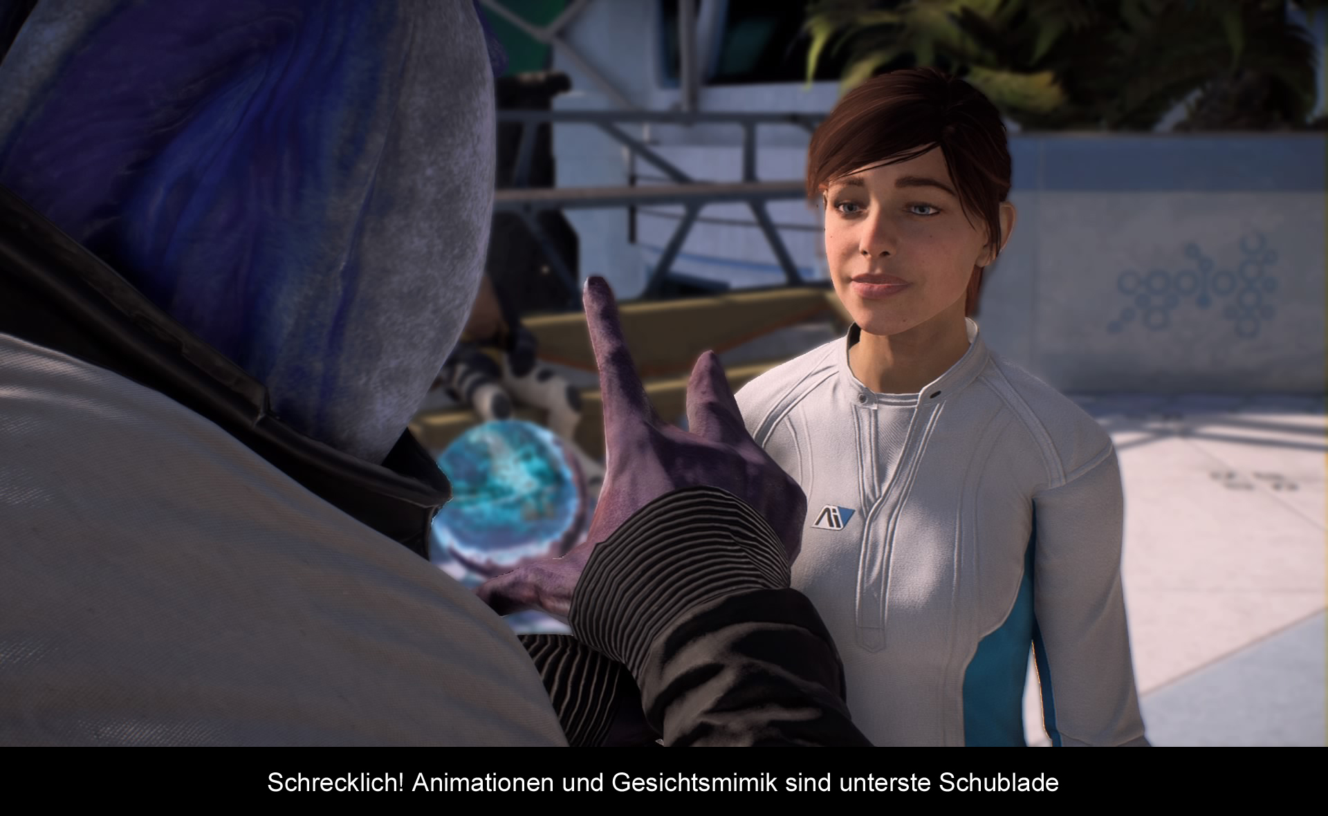 Kommen wir gleich zu dem Aspekt der Grafik, der am Meisten negativ auffällt: Den Animationen. Die sind nämlich durch die Bank weg unterirdisch. Selbst nach all den Patches wirkt die Mimik in den Gesprächen hölzern, es gibt keine Animationen bei den Haltungen und die Blicke wirken leer und starr. Wenn das Ms. Ryder (oder Mr. Ryder) durch die Gänge der Raumstation rennt, sieht das so aus, als ob die Spielfigur ganz, ganz dringend aufs Klo muss. Hilfe nochmal: „Mass Effekt“ war noch nie für Animationen berühmt, aber das, was hier geboten wird, ist einfach nur schlecht. Den Rest des grafischen Designs kann man getrost als langweilig und uninteressant verbuchen. Weder die Welten, noch Raumschiffe oder Gegner (Kett) und neue Freunde (Angara) wirken spannend. Wenn man zurückdenkt, wie durchdacht und einzigartig das originale „Mass Effect“ war, dann muss man wegen der Lieblosigkeit die hier vorherrscht, einfach nur den Kopf schütteln. Kett-Anlagen sind beispielsweise nur grün, erinnern an die Alienfilme und sind …ja, austauschbar. Die Framerate ist übrigens auch kein Gewinn. Zwar läuft das Spiel größtenteils flüssig, aber Drops gibt es vor allem in Gebieten mit vielen NPCs und wenn die Action abgeht. Düst man mit dem Fahrzeug über die Planeten, wird man dann und wann mit einem kurzen Ruckler begrüßt. Auf der PS4 Pro sind die Probleme übrigens auch vorhanden, aber treten seltener auf. Zudem ist die Auflösung leicht höher, was der Optik dann doch ein wenig zu Gute kommt. Die Musik hält sich übrigens ziemlich zurück und man merkt die meiste Zeit eigentlich nicht, dass sie überhaupt da ist. Die dt. Sprachausgabe ist dagegen ganz okay.