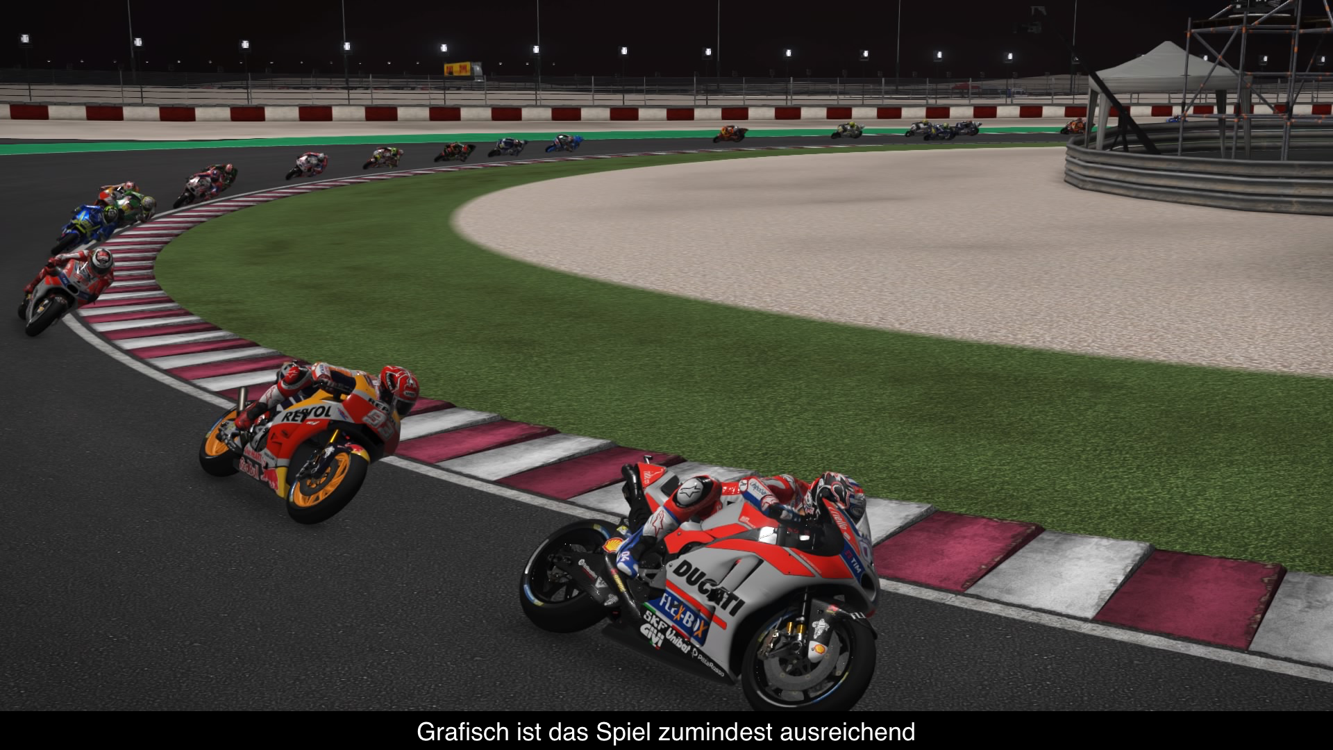 Wer hätte das noch gedacht bei Milestone? Nachdem sie Jahr für Jahr mehr oder weniger immer das gleiche Spiel abgeliefert haben, gibt es in technischer Hinsicht durchaus positives zu berichten. So laufen die Rennen nun endlich in 60fps bei einer Auflösung von 1080p. Es gibt auch 30fps Rennspiele, aber wirklich Spaß macht es nicht und wenn wir ehrlich sind die wollen wir doch alle nicht spielen. Auf der anderen Seite sieht MotoGP 17 nach wie vor etwas altbacken aus. Während die Motoräder allein für sich stehend, durchaus passabel ausschauen ist die Hintergrundkulisse umso detailärmer. Das Leben abseits der Strecke ist praktisch nicht vorhanden, so kommt auch keine wirkliche Stimmung auf. Noch dazu schauen die Boxencrew inklusive Fahrer merkwürdig. Wenn ich es beschreiben wollen würde: es ist ähnlich katastrophal wie die Animationen in Mass Effect Andromeda, nur hier sieht es kaum jemand daher müssen die Entwickler keinen Shitstorm hinnehmen.