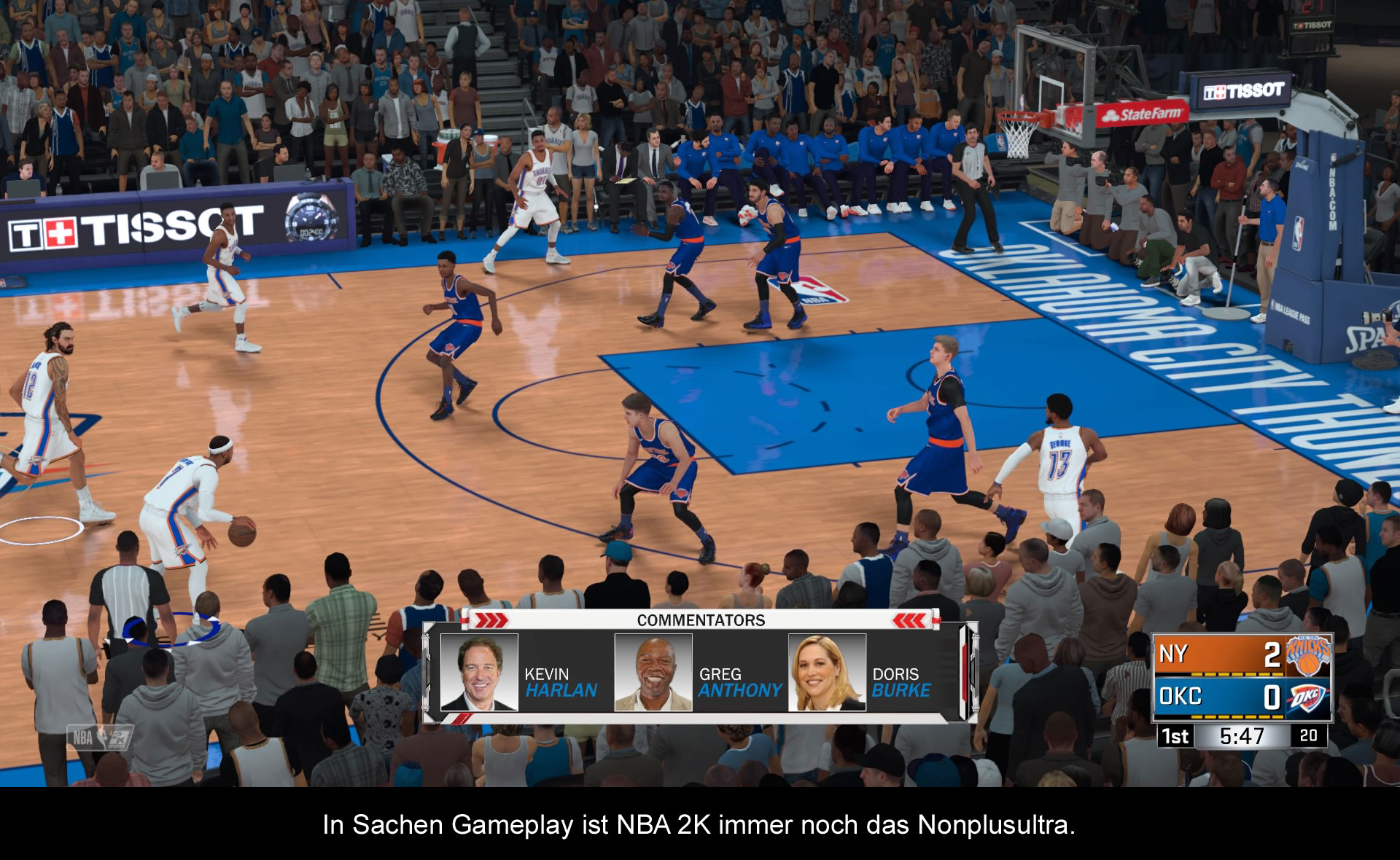 Was die Grafik und Präsentation angeht, ist NBA 2K18 immer noch auf Referenz-Niveau. So kann die Darstellung der Spiele mit seinen gelungenen Kamerafahrten und Einspielern absolut mit seinem Fernseh-Pendant mithalten. Neue Animationen bei den Fans und im Stadion lassen das Geschehen noch spektakulärer wirken als je zuvor. Hinzukommen überarbeite Spielermodelle, die immer noch fantastisch aussehen (Minuspunkte gibt es jedoch erneut für die Modelle von weniger bekannten Spielern, die im Vergleich zu den Westbrooks und Currys der Liga deutlich schwächer aussehen) Was jedoch enttäuscht ist die eingangs erwähnte trostlose Umgebung der Open World im MyCareer-Modus und die nervigen Ladezeiten, die schlicht und einfach viel zu lang sind. Was den Sound angeht, umfasst NBA 2K18 mal wieder einen gelungenen Soundtrack (mit einem Mix aus Rap, Pop und Rock) sowie ein Kommentatoren-Team, welches man jedoch langsam sein Alter anmerkt. Viele Kommentare kennt man bereits aus vorherigen Spielen, und es kommt einfach nicht mehr die gleiche Atmosphäre rüber, wie noch zu Beginn der Generation. Dennoch ist das Kommentatoren-Team immer noch deutlich besser als die Kollegen von FIFA oder PES, die in unseren Gefilden wohl am bekanntesten sind.