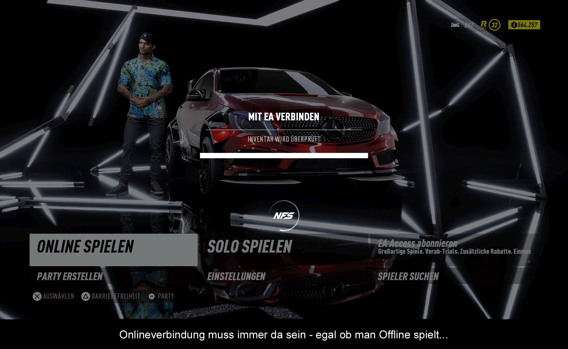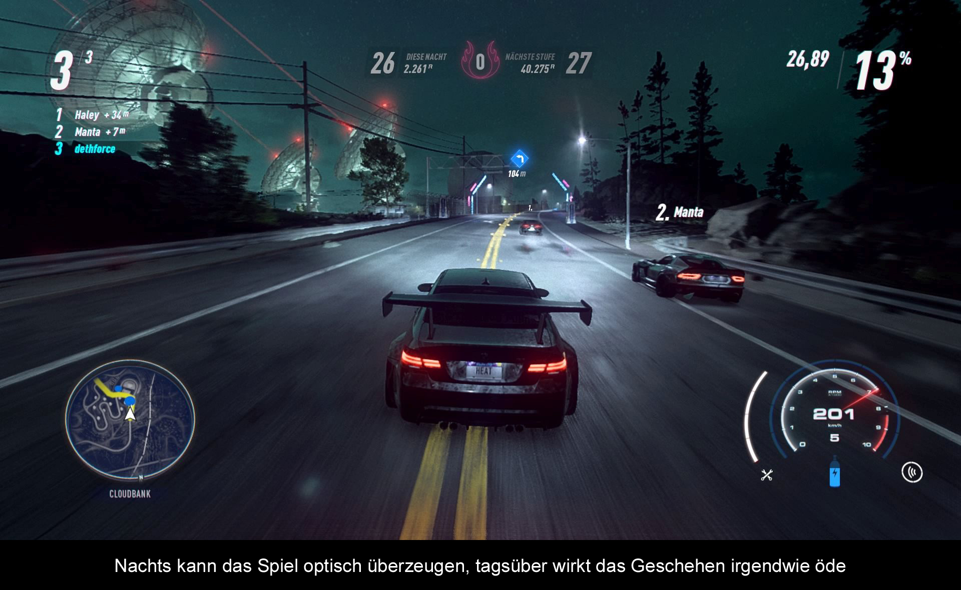 Noch ein paar Sachen, die man zum Spiel anmerken sollte. Der Titel lässt sich gleich im Multiplayer-Modus oder im Singleplayer-Modus starten. In ersterem kann man einer Crew beitreten und mit diesen Rennen bestreiten und diverse Boni wie verbesserte Heat-Multiplikatoren abgreifen. Bei Zweitem, also dem Einzelspieler-Modus, ist man dennoch auf die Server von EA angewiesen. Denn wenn diese Offline sind, kann man keine Teile oder Fahrzeuge kaufen. Auch komisch sind die Fahrzeugstufen-Anforderungen bei den Rennen. Vor allem bei den Offroad und Drift-Events. Denn hier gibt es nicht so viele Rennen, als das man genügend Geld für das Tuning gewinnen könnte. Und was ebenfalls verwunderlich ist: In der Nacht schaltet man spezielle Herausforderungen ab Heat-Stufe 3 frei. Hier winken bei höherem Risiko spezielle Teile – die aber nicht immer besser sind, als das, was man im Wagen verbaut hat. Zudem nervt es, dass man jedes Mal erst zu dem jeweiligen Rennen (egal welches und welche Tageszeit) fahren muss und es keine Option zur Schnellreise gibt. Dafür kann man durch fast alle kleineren Objekte hindurchrasen. Glaubt mir, würde man sonst an jedem kleinen Aufsteller oder Straßenbegrenzung hängen bleiben, wäre das ein herber Schlag für den Spielspaß. So aber haben die Entwickler eine gute Balance gefunden (große Bäume sind nach wie vor ein Hindernis), was wiederum dem gewöhnungsbedürftigen Handling zugutekommt.