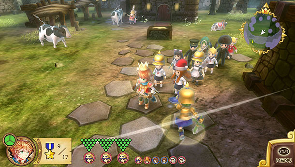 Das Gameplay von „New Little King’s Story“ setzt sich aus zwei Kernelementen zusammen: Aufbau des Königreiches und Bosskämpfe. Der vertriebene König findet sich in einer Holzhütte wieder, nur umgeben von seinen treuen Beratern und einer Handvoll Untertanen. Seine erste Aufgabe ist es die Umgebung zu erkunden und sein Reich wieder aufzubauen. Diese Schwierige Aufgabe muss er glücklicherweise nicht alleine erledigen da ihm eine Handvoll von Untertanen zur Verfügung steht. Zusammen mit seiner „Armee“ marschiert man in der frühen Morgenstunde in nahegelegene Gebiete und besiegt herumstreunende Monster und hebt Schätze aus. Die Kämpfe erledigt dabei das Volk. Auf Knopfdruck stürmen diese auf den Gegner zu und übermannen ihn. Sollte dies nicht ausreichen, kann der König noch mit seinem Schwert nachhelfen. Doch Vorsicht! Gefallene Untertanen findet man im Spital wieder, aber wenn der König den Feinden unterliegt, muss man den Tag von vorne beginnen. Nach einem siegreichen Beutezug kehrt man spät heim und rechnet mit dem Finanzminister ab. Billiger Kram wird verkauft und wertvolle Gegenstände kommen in die königliche Schatzkammer. Mit der Zeit häuft sich ein stolzes Vermögen an, welches den Bau von neuen Häusern, einem Bauernhof und einer Kaserne ermöglicht. Diese Gebäude werden dringend benötigt, denn um weiter Vorzudringen, braucht man für verschiedene Aufgaben, Spezialisten. Im Bauernhof bildet man Bauern aus, welche Löcher graben können, während in der Kaserne Soldaten rekrutiert werden. Mit der Zeit steht euch eine Palette von verschiedenen Berufen zur Verfügung, die es geschickt einzusetzen gilt. Für einen Erkundungsausflug reicht eine spezialisierte Truppe mit Handwerkern, Bergleuten, Holzfällern usw. aus. Diese hochspezialisierte Truppe ermöglicht es euch immer weiter in das Feindgebiet vorzudringen, doch je weiter man in das Feindesland eindringt, desto stärker werden die Gegner. Es ist unverzichtbar, dass man immer ein paar Soldaten und Bogenschützen in der der Gruppe hat. Mit wenigen Tastendrücken wechselt man die Formation und diese Kämpfer stehen statt Bauern oder Holzfällern in der ersten Reihe und greifen den Gegner an. Um verschiedene Quests oder Bosskämpfe zu erfüllen empfiehlt es sich eine eigene schlagkräftige Kämpfertruppe zusammen zustellen, wo wir schon bei der nächsten Lektion wären!
