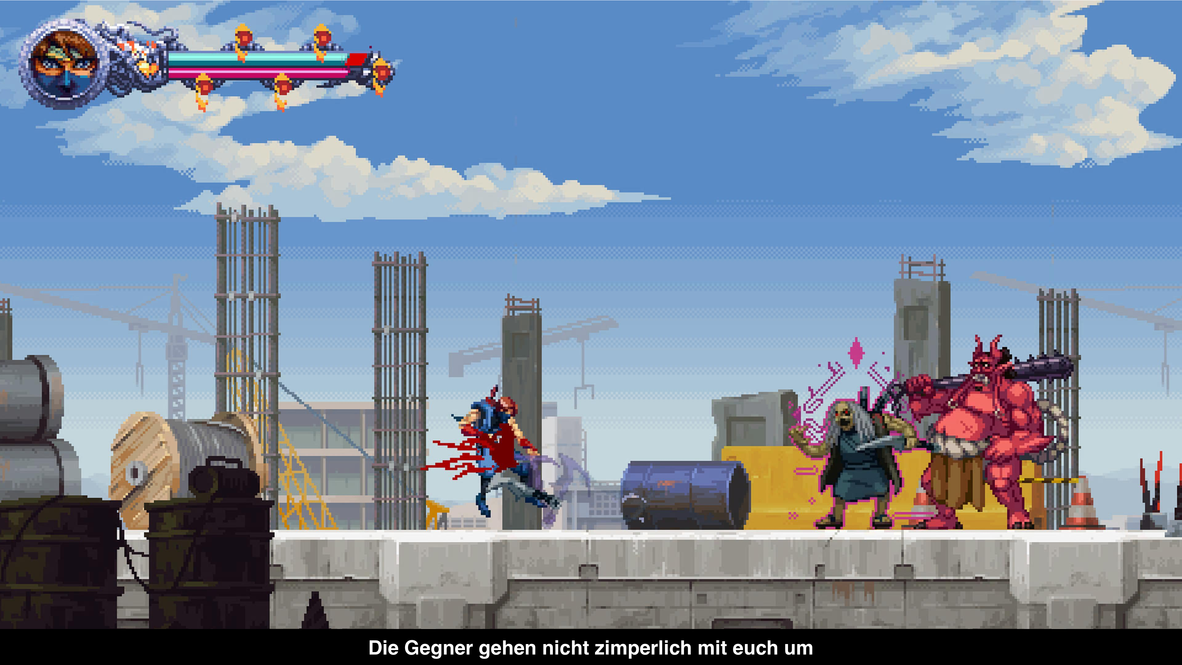 Ähnlich wie Blasphemous besticht Ninja Gaiden Ragebound durch einen pixeligen 2D-Stil. Obwohl die Charaktere an sich eher gering aufgelöst sind, ist alles gut erkennbar und vor allem die Umgebungen sind abwechslungsreich gestaltet und bieten genug Details. Es mangelt auch nicht an Gegnertypen und fast jedes Level bietet was Neues. Natürlich läuft das alles problemlos mit 60 Bildern pro Sekunde und angetrieben wird man von einem tollen Soundtrack. Der bietet Musik im Stile von SNES-Spielen, aber mit viel mehr Facetten. Es gibt schnelle Gitarrensongs, klassisch angehauchte Melodien und mehr. Jede Situation wird gekonnt unterstützt.