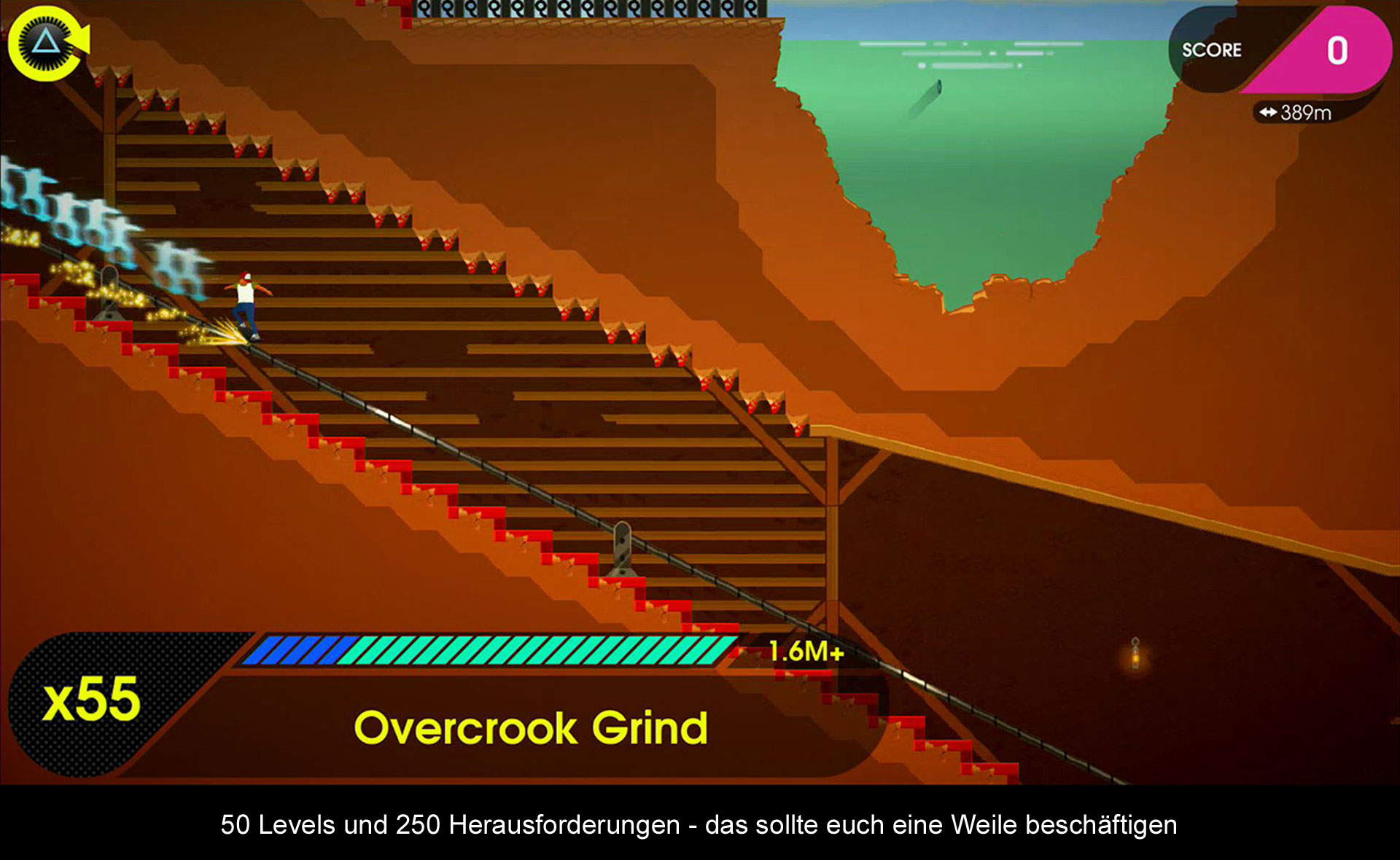 Im Vorgänger gab es eigentlich nur zwei Arten an Tricks. Die normalen Skateboard-Tricks, wie ein Olli oder der Heelflip und die vielen Grindarten, um geschmeidig über Stangen, Fahrzeuge und Häuserdächer zu rutschen. Ausgeführt werden die Tricks mit dem linken Analogstick, indem man z.B. eine Halbkreis-Bewegung ausführt und ihn dann loslässt. Besonders wichtig hierbei ist das Timing beim Landen bzw. Grinden und diesen Grundsatz führt OlliOlli2 konsequent weiter. Jedoch wurde das Repertoire an Tricks noch ein wenig ausgebaut. So gibt es nun einige schwierigere Tricks, aber auch völlig neue Arten, um die Tricks zu langen Combos zu kombinieren. Die einfachste Möglichkeit ist bei der Landung einen Manual zu landen, welcher die Combokette nicht unterbricht. Hier kann man sogar bei der Landung erst einen Reverse machen, sich also bei der Landung mit dem Bord drehen und dann in einen Manual übergehen. Ähnliches kann man auch beim Grinden ausführen, wo man nun zwischen unterschiedlichen Grinds wechseln kann, wenn der eigentliche Grind perfekt ausgeführt wird. All das sorgt dafür, dass der Combocounter in die Höhe schießt und man ein Level in einer einzigen langen Combo abschließen kann. Anfangs mögen die neuen Möglichkeiten etwas viel auf einmal sein, jedoch gewöhnt man sich schnell an die einzelnen Tricks und dann sind Reverse Manuals, Grinds & Co. kein Problem mehr und hier liegt auch die Stärke von OlliOlli2. Die unzähligen Möglichkeiten an Tricks laden zum Ausprobieren ein und obwohl die Steuerung anfangs wenig intuitiv rüberkommt, entsteht starkes Suchtpotential, weil Stürze nur die eigene Schuld sind. In Sachen Umfang bekommt man es wie im Vorgänger mit fünf Welten und insgesamt 50 Levels und dazugehörigen Spots zu tun, die jeweils fünf Aufgaben für einen bereithalten. Beispielsweise muss man einen Highscore knacken oder aber im Level verteilte Embleme einsammeln. Manche der Aufgaben sind dabei relativ einfach zu lösen und andere wiederum benötigen etwas Training, weil man z.B. bestimmte Tricks in die Combo einbauen muss. Aber letztlich lernt man auch so die einzelnen Spielmechanismen perfekt kennen. Des Weiteren gibt es nun Alltagsaufgaben, in denen ihr euch täglich in einem Level mit der ganzen Welt messen dürft. Hier dürft ihr zuerst einige Runden zum Training drehen und habt dann genau einen Versuch, um euch in die Leaderboards einzutragen. Insgesamt gibt es also genug zu tun in „OlliOlli 2“.
