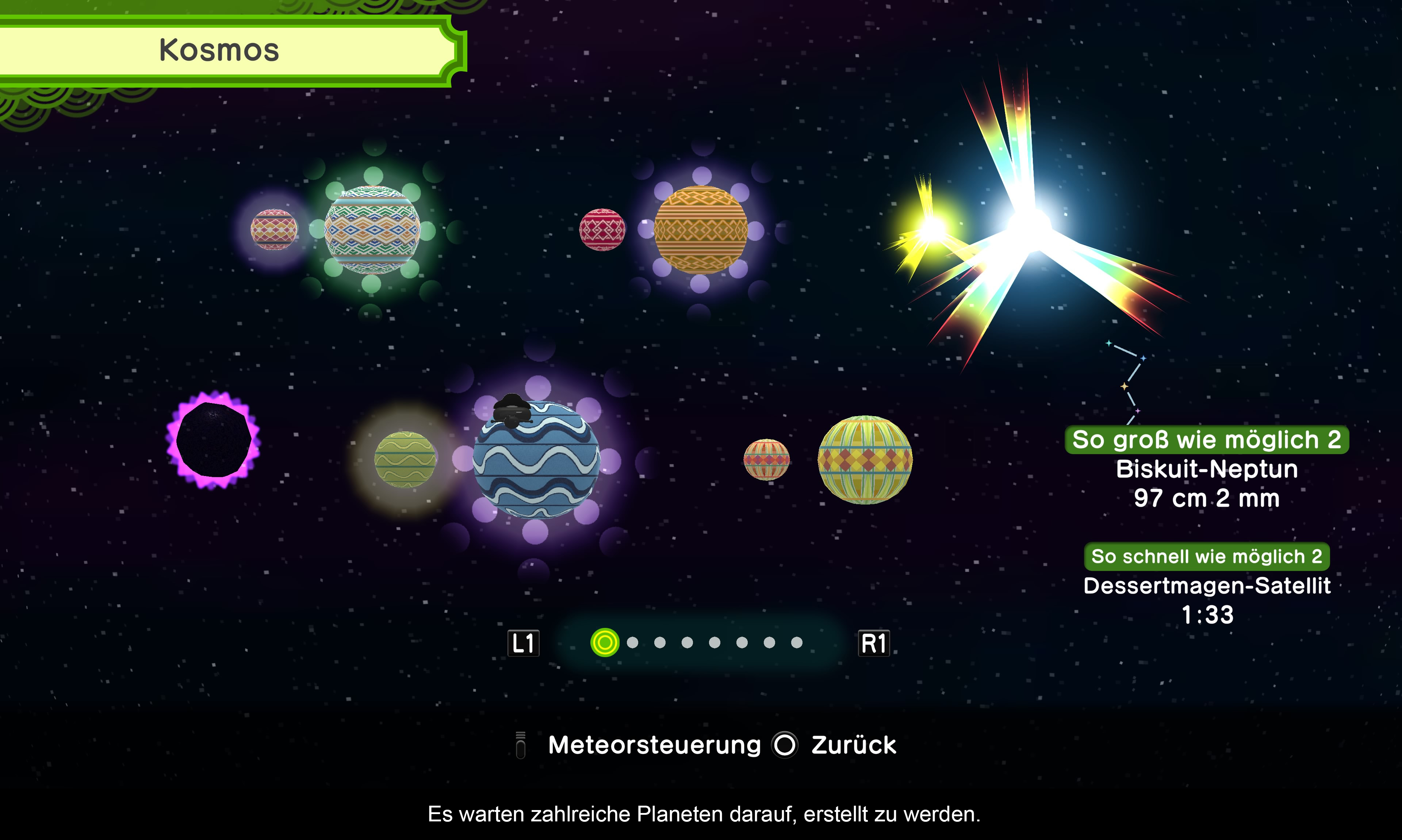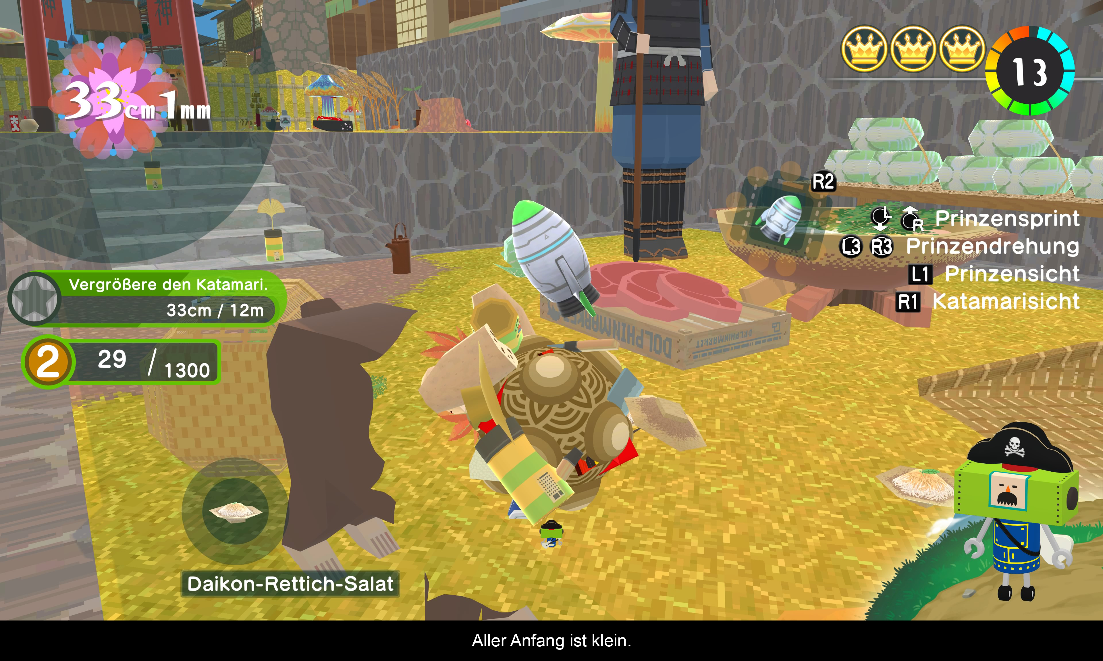 Das Spielprinzip scheint simpel: Rolle deinen Ball und sammle alle Objekte auf, bis du eine gewisse Größe erreicht hast. Das hört sich überschaubar und leicht an. Doch den Ball das machen zu lassen, ist die große Kunst! Die klassische Steuerung stammt noch aus der Zeit der „Tank“-Steuerung. Um den Ball zu rollen oder bestimmte Manöver (schnelle Wende, Turboschub etc.) durchzuführen, werden beide Analogsticks gebraucht. Wer nicht in Nostalgie schwelgen möchte, kann auf die neue Steuerung umstellen, bei der ein Stick den Ball und einer die Kamera steuert. Hat man sich mit der Steuerung arrangiert, beginnt der wahre Spaß. Für jedes Level gibt es eine Zielvorgabe, beispielsweise hinsichtlich der Größe oder der benötigten Zeit. Eure Aufgabe ist es, den besten Weg zu finden und Objekte möglichst geschickt aufzurollen. Wie weit ihr diese aufrollen könnt, hängt auch von der Größe des Balles ab. Dadurch kann man bei größeren Gegenständen schon mal abprallen und verliert ein paar Objekte. Doch mit der Zeit wird ein Hindernis zum weiteren Teil des Balls. So wechselt ihr innerhalb der Levels in unterschiedliche Areale. Eine kurze Ladepause zum Erstellen der neuen Objekte wird durch einen lustigen Satz des Königs überbrückt. Ist die Zeit abgelaufen oder die Zielgröße erreicht, folgt die Bewertung. Eine D-Bewertung reicht aus, um das Level zu bestehen, aber am Ende möchte man natürlich die beste Bewertung, ein S, erreichen. Egal, wie das Ergebnis ausfällt, es wird zu einem neuen Stern im Kosmos oder zu Sternenstaub.