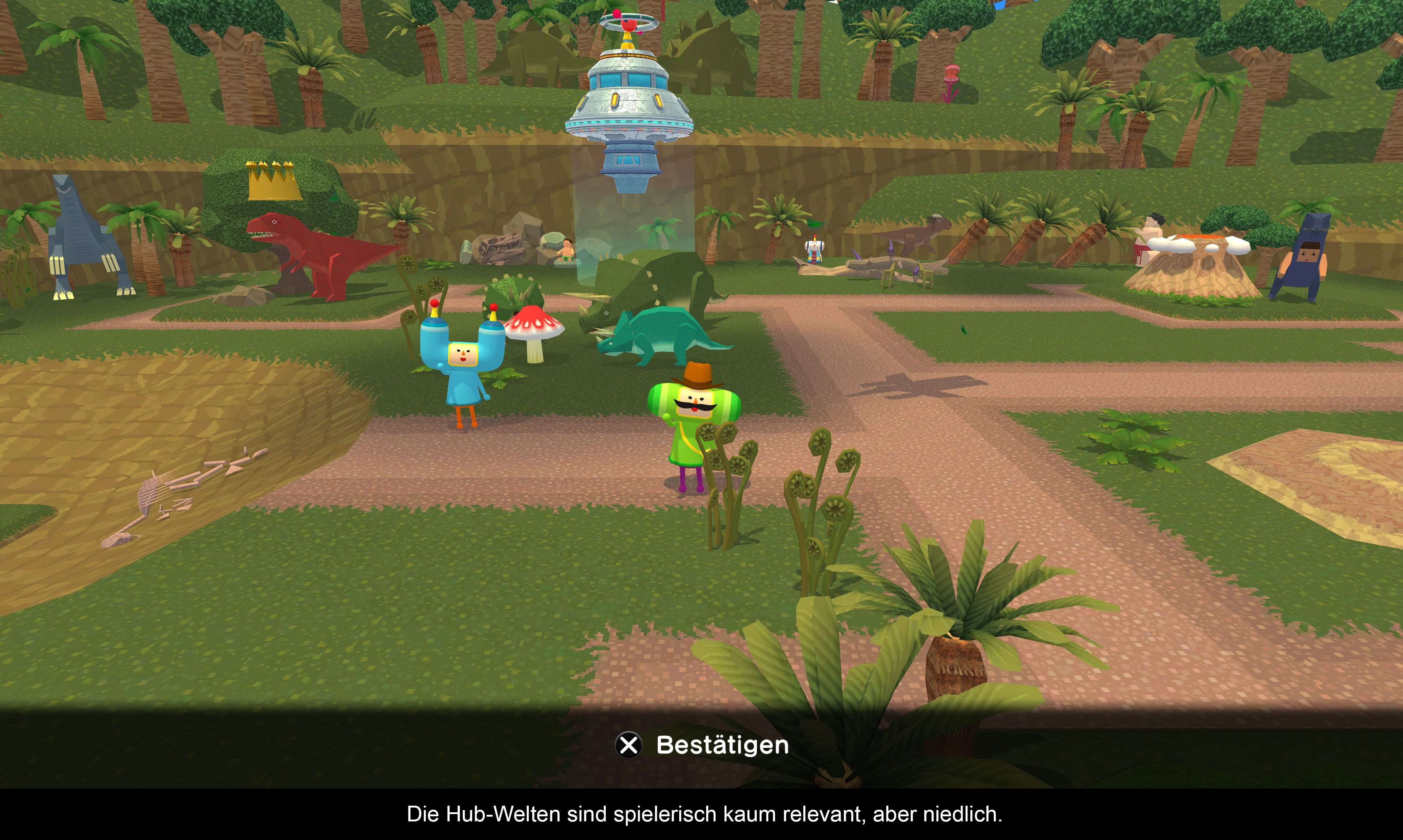 Zumindest die begehbare Spielwelt ist neu. Je nach Epoche sieht diese etwas anders aus, ihr Zweck bleibt jedoch gleich: Sie dient als visueller Level-Hub. Puristen können die Levels weiterhin aus dem Menü auswählen, doch dieser Hub hat seinen eigenen Charme und unterstreicht den quirligen Charakter des Spiels. Der Prinz und alle gefundenen Cousins tummeln sich hier herum und verfügen über eigene Animationen. Noch knuffiger wird es, wenn man das Spiel hier beendet und jeder von ihnen zum Abschied winkt!
