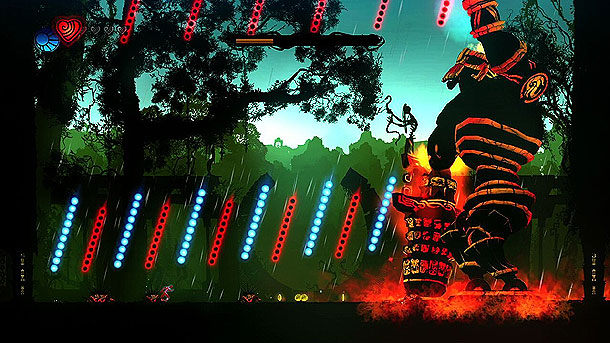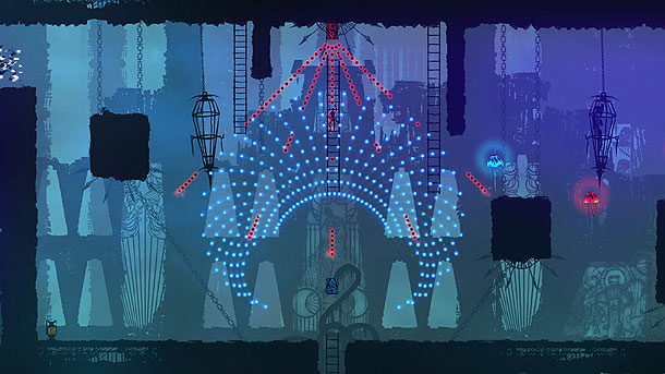 Die Parallelen zu „Metroid“ liegen auf der Hand, doch warum „Ikaruga“? Damit man sich nämlich noch mehr von bekannten Genrekollegen abhebt, spendierte man dem namenlosen Helden noch die Fähigkeit, zwischen roten und blauen Energieströmen hin und her zuschalten. Hat man z.B. die blaue Phase aktiviert, kann man bedenkenlos die blauen Ströme durchqueren. Dies erinnert frappierend an den bekannten Edelshooter und sorgt für kniffelige Geschicklichkeitsaufgaben. Dabei wird man von roten, respektive blauen Energiesalven beschossen oder aktiviert mit der passenden Phase Plattformen und Schalter. Was anfangs noch recht leicht von der Hand geht, artet mit zunehmender Spieldauer in Akrobatik aus. Die Salven werden immer komplexer und erinnern dabei fast an einen Bullet Hell Shooter, zum anderen muss man während eines Sprunges die zwei Phasen mehrmals durchschalten, um eine rettende Plattform zu erreichen.