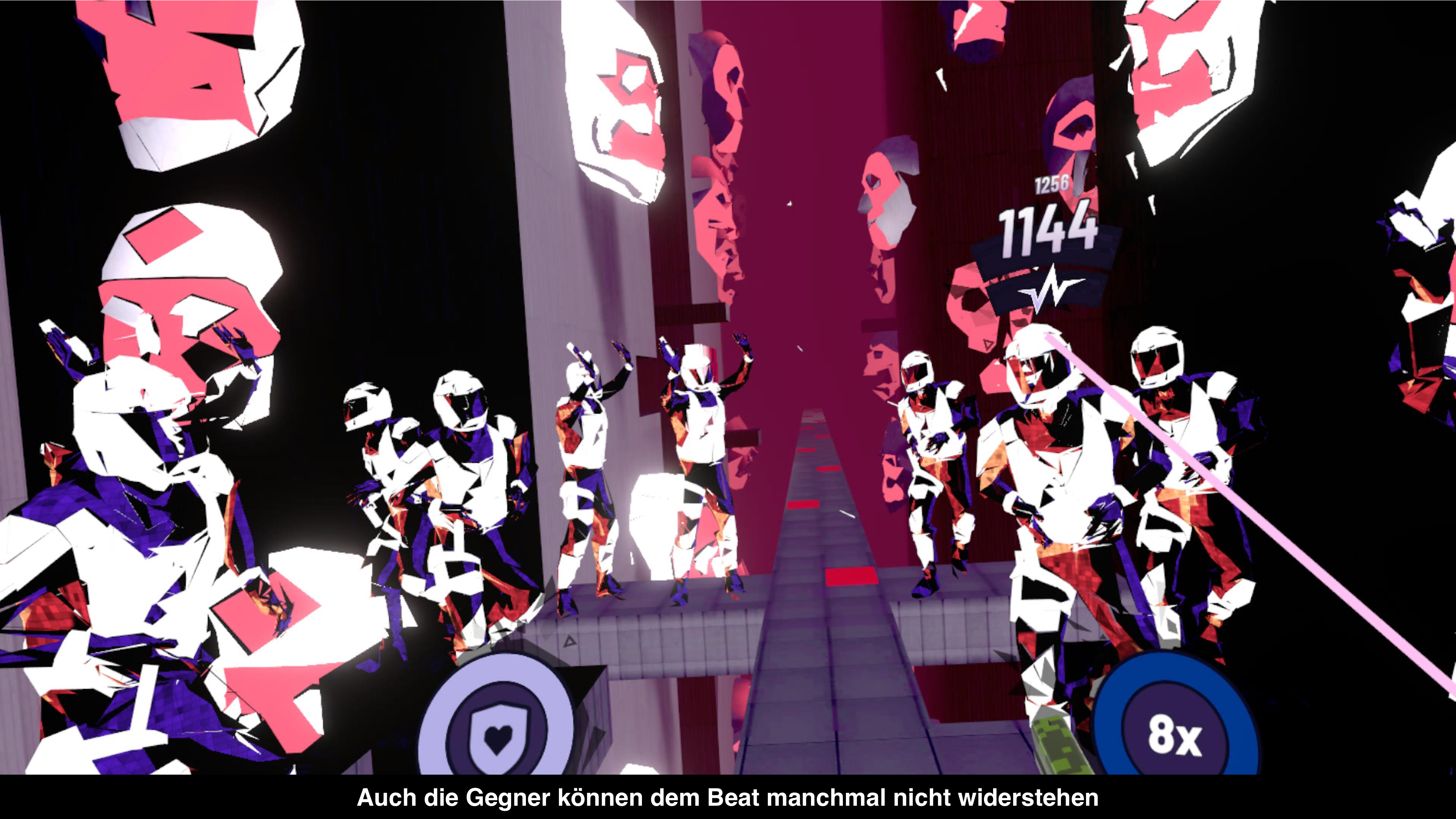 Das Spielprinzip ist relativ einfach erklärt. Quasi auf Schienen bewegt ihr euch durch ein geradliniges Level und von überall stürmen Gegner auf euch zu und eure Aufgabe ist es diese nun mit eurer Pistole zu erschießen, bevor sie euch treffen. Ihr weicht mit eurem Kopf aus und müsst euch umschauen, um alle Gegner zu erspähen. Mit euren Händen haltet ihr die virtuelle Pistole und zielt gekonnt auf die Gegner. Für jeden Treffer gibt es Punkte und mit mehreren Treffern könnt ihr euren Multiplikator hoch halten. Wer besonders viele Punkte erhalten möchte, erschießt Gegner im Takt der Musik. Denn das ganze Spielgeschehen ist mit fetten Beats unterlegt. Was simpel klingt, ist recht herausfordernd, weil vor allem auf höheren Schwierigkeitsgraden einiges los ist. Dann kommt euch zu Hilfe das man nicht super akurat zielen muss, um auch weiter entfernte Gegner zu treffen. Dank der neuen VR Controller ist dies aber auch kein großes Problem und die Erkennung funktioniert problemlos.
