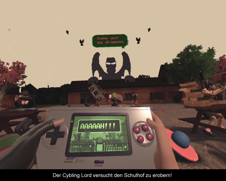 Der fiese Cyblin Lord will aus einem Videospiel ausbrechen und versucht die reale Welt zu unterjochen. Dabei dringt er in diverse Spiele ein, was unsere 8-jährige Heldin Nicola mit ihrem tragbaren Gear Kid verhindern muss. Um dies zu schaffen, schlüpft sie in die Rolle von Dot und springt von Spiel zu Spiel. Es handelt sich also um ein Spiel im Spiel mit Augmented Reality Anleihen, welches in der virtuellen Realität gespielt wird. Klar soweit? Kurz erklärt: Man sitzt im ersten Level in der virtuellen Schule im Unterricht, während man heimlich unter dem Tisch seinen 8-Bit Gear Kid auspackt und zockt. Dies bleibt allerdings nicht lange ungesehen und die Lehrerin mahnt euch an, das Teil wegzupacken. Um etwas Zeit zu gewinnen, könnt ihr mittels eines Blasrohres Papierkügelchen auf diverse Objekte verschießen und so die Lehrerin ablenken. So habt ihr zwar auf dem Gear Kid unendlich Leben im Kampf gegen den Cybling Lord, doch erwischt euch die Lehrerin drei Mal, heißt es Game Over für euch. Am Ende des Levels läuft der Gear Kid schließlich Amok und die Grafik bricht aus dem Handheld aus und verwandelt das Klassenzimmer in einen großen Level. Klingt verworren und verrückt? Ist es auch! Später geht es dann noch auf den Schulhof, wo euch neben normaler Jump and Gun Action noch ein simples Augmented Reality Moorhuhn Spiel erwartet, bevor es im dritten Level zurück ins Klassenzimmer geht. Abschließend gibt es nur noch einen abgedrehten Bossfight und Pixel Ripped 1989 ist zu Ende. Überbrückt werden die Levels durch witzige Zwischensequenzen mit allerhand Anspielungen, welche im groben Pixel Look gehalten sind.