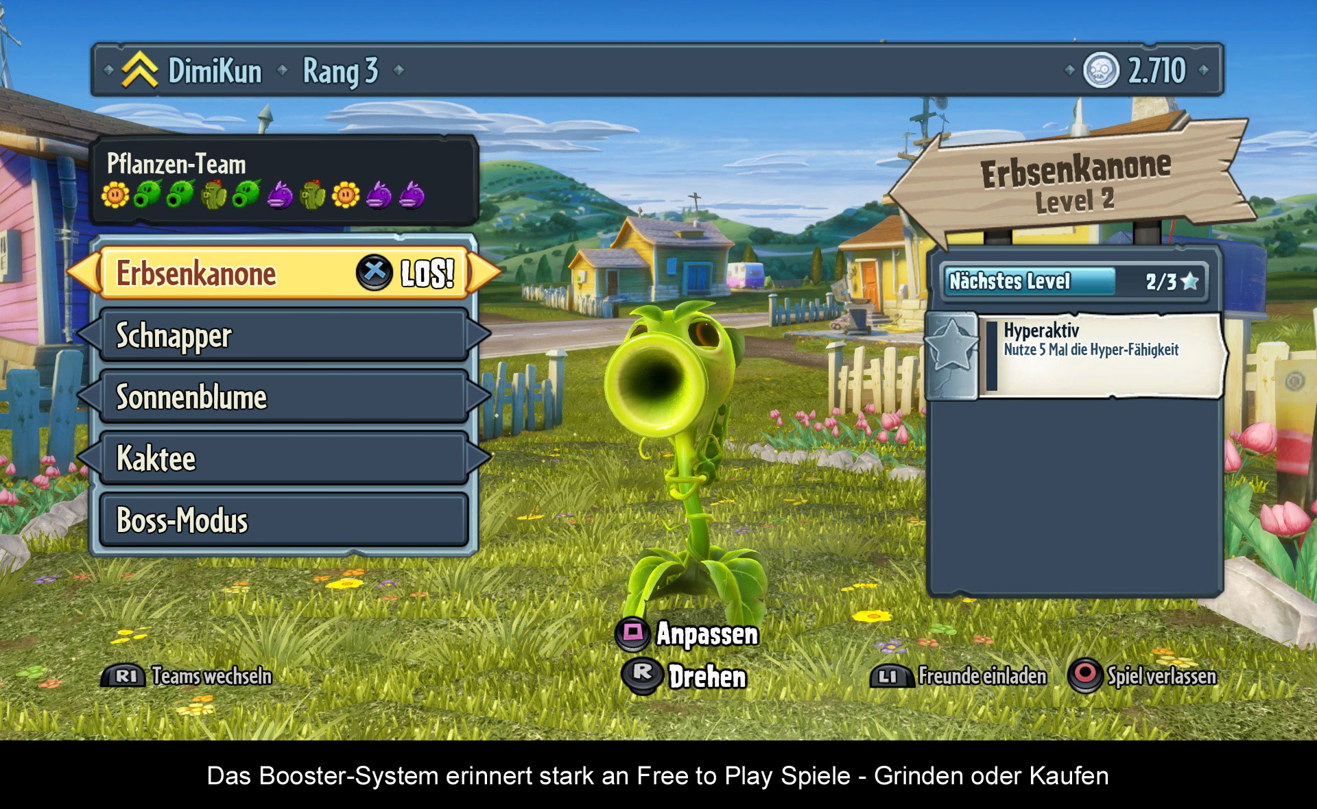 „Garden Warfare“ ist jedoch mehr als nur ein simpler Shooter. Dies liegt insbesondere an den verschiedenen Klassen, die man auf beiden Seiten finden kann. Genre-typisch gibt es unter anderem Nahkämpfer, Medics, wuchtige Angreifer und sogar Sniper. Jeder verfügt über spezielle Angriffe und Extras. Diese Extras bzw. Charakter-Booster werden unter anderem durch spezielle Sammelkarten aktiviert, die man im Verlauf des Spiels gewinnen kann. Und wem dies sogar noch zu anstrengend ist, kann besagte Booster auch gegen ein wenig Kleingeld erwerben - Dabei handelt es sich um weiteren Faktor, der an die Free to Play Vergangenheit des Spiels erinnert. Manche mögen es, manche nicht. Ich persönlich gehöre jedenfalls eher zur zweiten Sorte. Aber EA kennt den Markt. Und allem Anschein nach scheint es sich ja auch auszuzahlen.