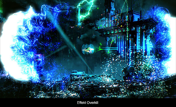 Auf den ersten Blick sieht Resogun recht unscheinbar aus und man könnte meinen, dass es so auch auf der PS3 möglich wäre. Wenn die Action dann aber losgeht, wird einem klar, dass hier etwas ganz besonderes vor einem stattfindet. Denn die ganze Welt und auch die Raumschiffe, sowie Aliens bestehen aus sogenannten Voxels. Voxel sind kleine Quadrate, die statt Polygonen verwendet werden, um die Modelle darzustellen. Die Besonderheit davon ist, dass man damit relativ gut Zerstörungen darstellen kann. Wenn man also einen Gegner erledigt, zerfällt dieser in tausend Einzelteile und das gilt auch für die Stadt, welche unter dem Beschuss leidet. Hinzu kommen dann zig Explosions- und Boost-Effekte, welche wirklich toll aussehen und worunter manchmal sogar ein wenig die Übersichtlichkeit leidet, da teilweise so viel auf einmal los ist. Besonders beeindruckend ist übrigens das Ende eines jeden Levels, wenn alles explodiert. Einfach nur toll! Etwas schade ist jedoch, dass jedes Level in Schwarz/Grün gehalten ist und kaum vom anderen zu unterscheiden ist. Etwas mehr Abwechslung in den Farben oder dem Design der Städte hätte sicher nicht geschadet, ist aber auch kein Beinbruch, da während der Action kaum noch etwas davon zu sehen ist. Soundtechnisch kann man mit einem tollen Elektro-Soundtack überzeugen, der aber in der Standard-Abmischung etwas leise ausfällt. Wirklich cool sind aber die ständigen Soundausgaben am Controller, welche neue Keeper, Multiplikatorenaufstiege und andere Gefahren ansagen und irgendwie das Gefühl vermitteln wirklich in dem Raumschiff zu sitzen.