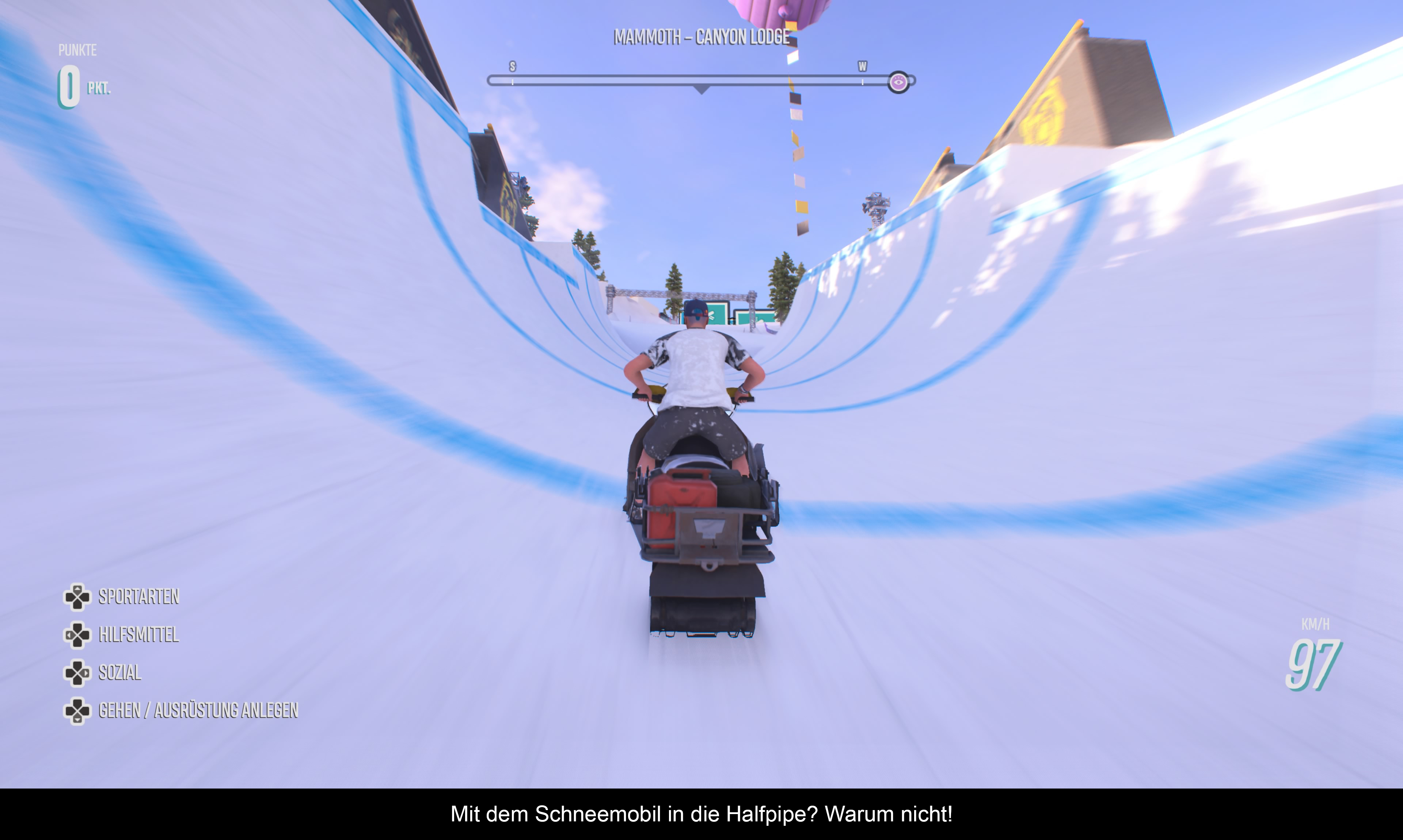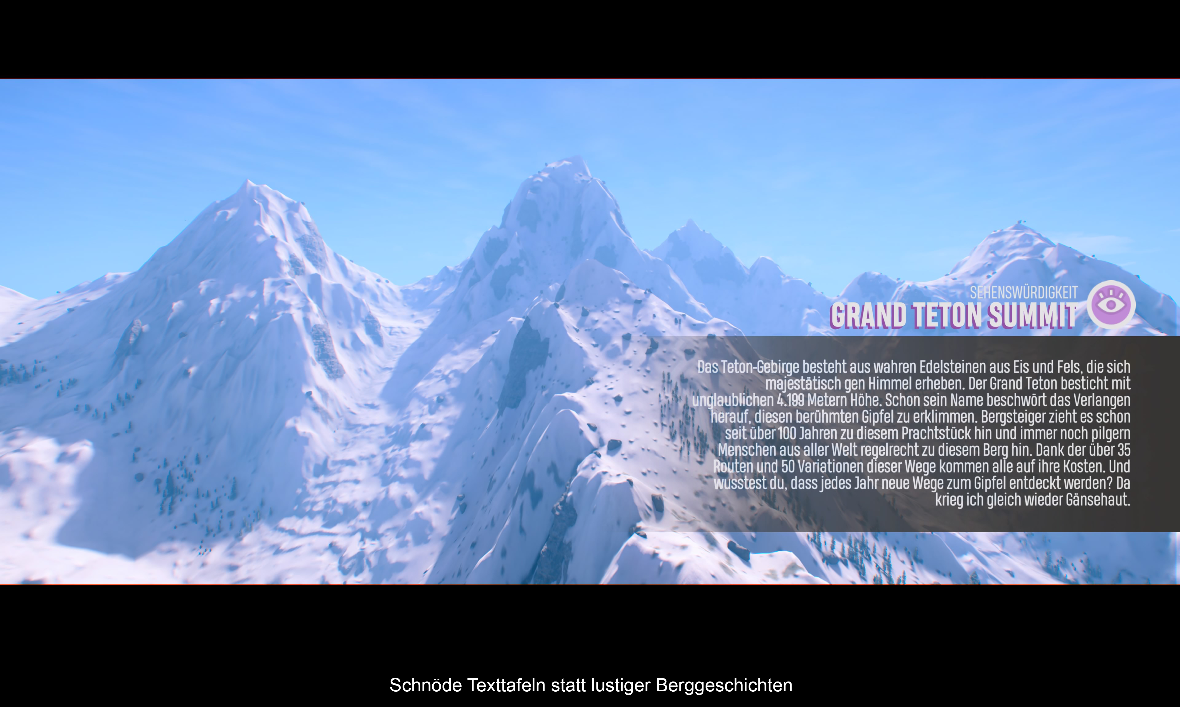 Ubisoft Annecy verpackte das gesamte Spektakel in ein riesiges Treffen der Sport Gemeinde. Die Aufgabe des Spielers ist es, bei Wettkämpfen wie den X-Games sich einen Platz auf dem Podium zu sichern, damit man sich am Ende beim International Event beweisen kann. Bei dieser Herausforderung wird sämtliches Können in verschiedenen Disziplinen wie Ski, Snowboard, Rad und Gleitschirm abgefragt. Begleitet werdet ihr dabei von der liebenswerten Suki und der „Legende“ Brett. Beide führen einen nicht nur in die verschiedenen Spielmodi ein, sondern melden sich auch beim entsprechenden Fortschritt zu Wort. Die Präsentation lässt sich hier am besten mit dem Jugendwort 2021 beschreiben: „Cringe“! Sie ist gut gemeint, aber irgendwie wirkt sie fehl am Platz und wurde auf „zu cool“ getrimmt. Gut, auch „Steep“ hatte mit den DLC erst so etwas wie eine Handlung, dafür gab aber auch die interessanten Berggeschichten. Diese wurden in der Republic durch Sehenswürdigkeiten und einfachen Texten ersetzt. Sehr schade, aber die Handlung steht ja nicht im Mittelpunkt!
