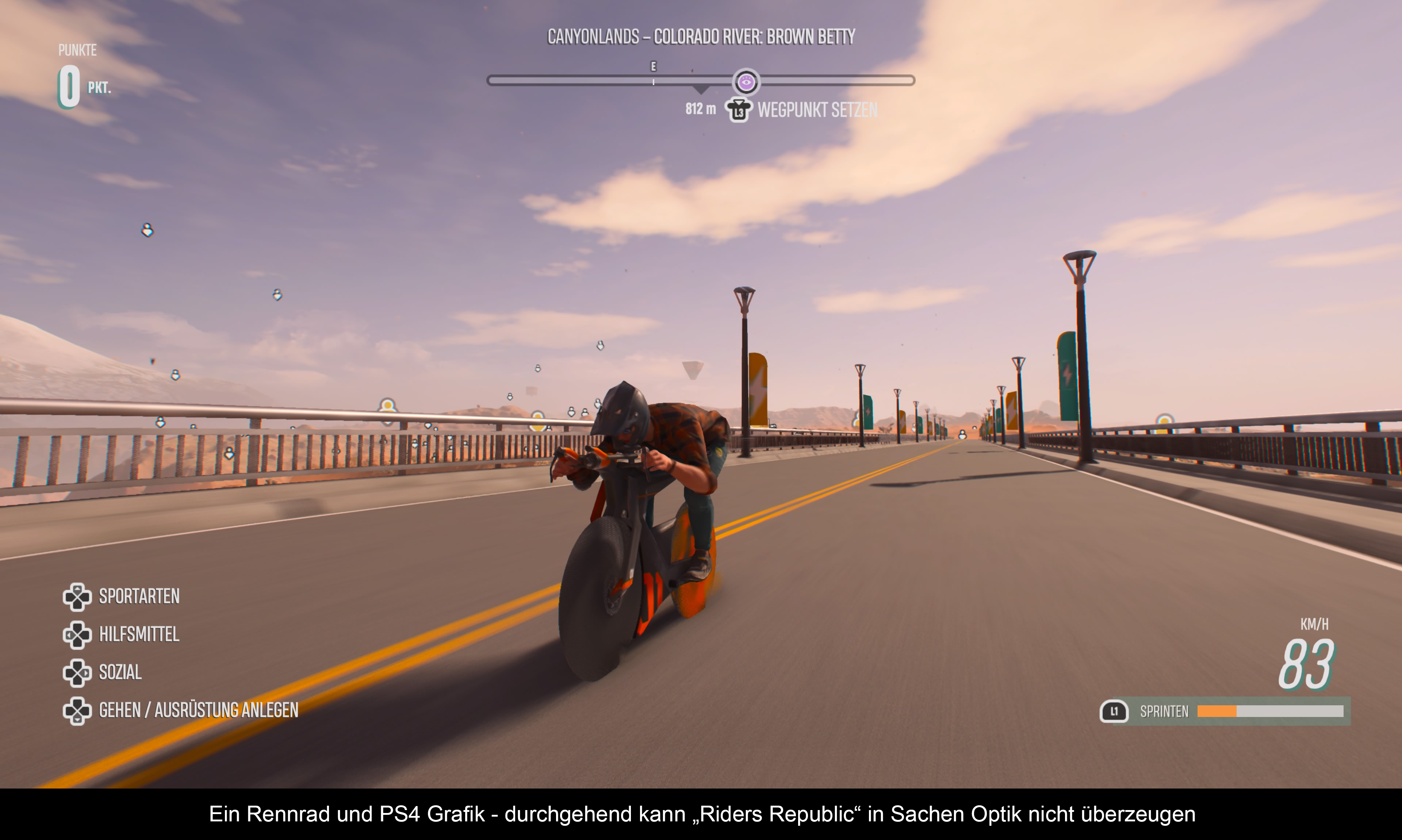 Bereits bei der Beta hatte ich massive Zweifel, in welche Richtung sich dieses Spiel grafisch entwickeln wird. Die konstanten 60FPS und 4K Auflösung sind schon mehr als in Ordnung, aber eigentlich sollte da noch mehr gehen. „Riders Republic“ entpuppt sich somit auf der PS5 als aufgemotzte PS4 Version. Die Kanten sind etwas schärfer und die Ladezeiten kaum existent, aber das war es dann auch schon. Besondere Controller-Features oder gar exklusive PS5 Merkmale (Trophy Tracking) sucht man vergebens. Zumindest konnte das massive Screen Tearing stark eingegrenzt werden und tritt nur noch vereinzelt bei Online Rennen zu tage. Dafür gibt es als Ausgleich massive Pop-Ins. Man merkt richtig, wie sich vor einem die Landschaft aufbaut. Sehr schade, dass man das nicht verhindern konnte, denn eigentlich hat das Spiel seine visuellen Momente! Zum Beispiel das Publikum während der Rennen, oder es gibt einen besonderen Wettereffekt wie einen Kometenschauer zu sehen. In der Spielwelt tummeln sich auch zahlreiche Tiere wie Schlangen, Hasen, Bären oder Fledermäusen. Wenn die Sonne im richtigen Winkel steht, alles in ein sanftes Rot gehüllt wird und man langsam durch ein Feld voller Glühwürmchen fährt, zieht einen die Atmosphäre in seinen Bann. Die Präsentation während der Wettkämpfe fällt nicht sonderlich spektakulär aus. Die Sprecher kommentieren zwar jeden Trick, wiederholen aber zu schnell ihre Phrasen und driften immer wieder in sprachliche Fremdschämbereiche ab. Der Satz: „Da hat wieder jemand Plumps gemacht!“ wird auf Dauer sehr anstrengend. Selbiges gilt auch für den Soundtrack. Dieser könnte durchaus umfangreicher und abwechslungsreicher sein. Teilweise wirkt das Gebotene etwas zu sehr Retro und ich meine hier nicht die klassische Musik, die man auch hören kann.