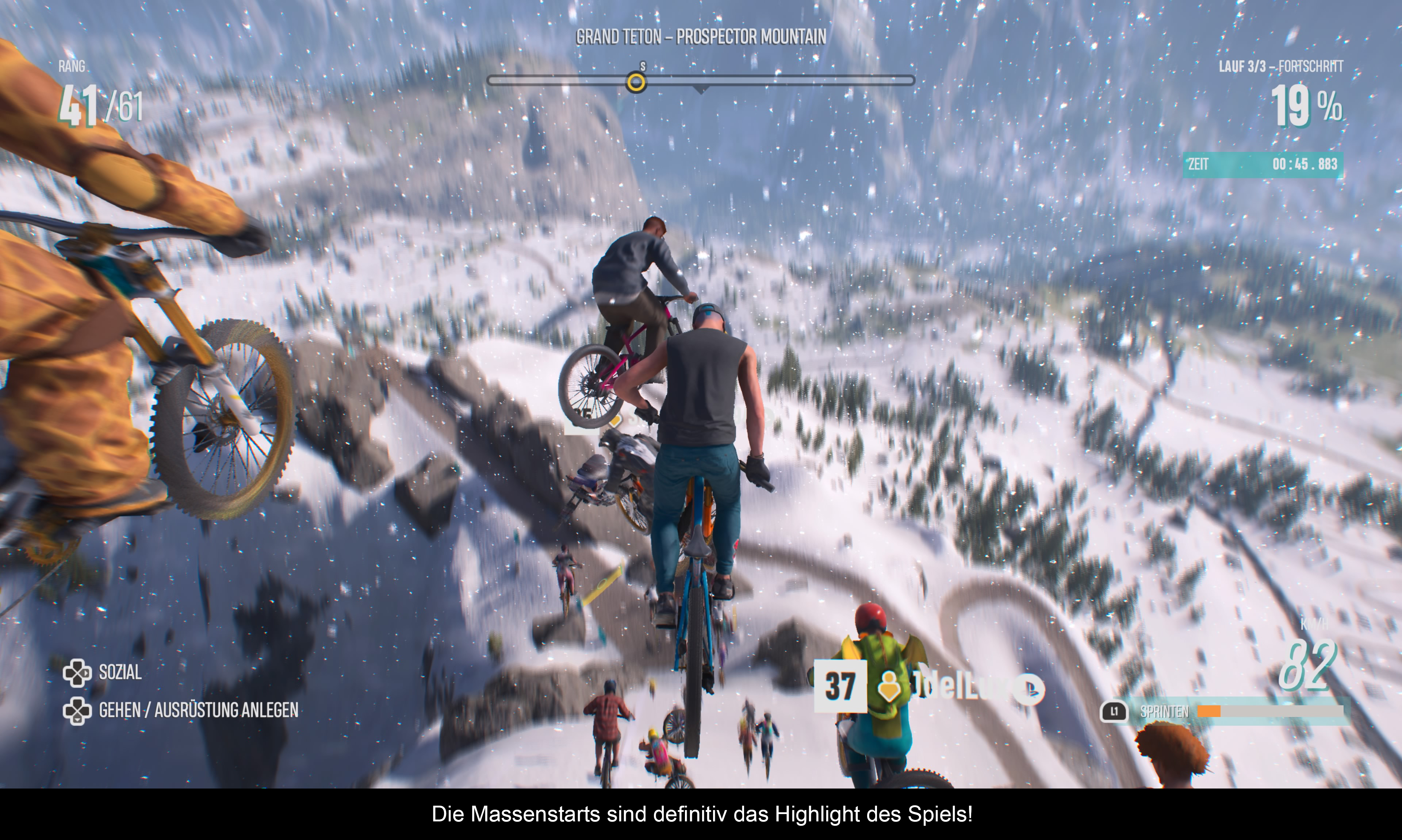 Ähnlich wie andere Spiele von Ubisoft ist auch „Riders Republic“ als Online Open World Titel konzipiert. Ihr seid in der Welt also nie alleine unterwegs und trefft immer wieder auf andere Rider! Wer das Spiel Offline genießen möchte, oder die Amazon Server mal wieder streiken, kann sich immerhin im Zen-Modus vergnügen. Wobei dieser auf das Minimalste reduziert wurde: Man hat also auf keine Outfits (die man mit echtem Geld gekauft hat), oder erspielte Fahrräder Zugriff. Das sollte jedem bewusst sein, der vorhat „Riders Republic“ nicht als MMO zu spielen. Wer sich aber auf das Konzept einlässt, wird schnell merken, dass die Entwickler sich dabei etwas gedacht haben. Die Karte ist nicht nur mit Onlinespielern bevölkert, sondern auch mit ihren „Geistern“ - Aufzeichnungen aus früheren Spielsitzungen. Somit ist an jeder Ecke etwas los, besonders in der Nähe von größeren Events. Aber auch bei den Rennen wird auf diese Geister zurückgegriffen und man startet nicht etwas gegen ein KI. Dies führt zu sehr seltsamen menschlichen Situationen bei Events, aber auch zu unterschiedlichen Schwierigkeitsgraden. Es kann schon mal sein, dass man unglücklicherweise gegen einen Spieler mit der besten Ausrüstung antreten muss. Wer lieber gegen richtige Menschen spielt, kann sich in speziellen Trick-Arenen beweisen, oder halt Rennen bestreiten. Je nach Können steigt man immer weiter in der Liga auf und schaltet Belohnungen frei. Das wahre Highlight sind aber die Massenstarts! Hier kämpfen 64 Spieler um die besten Plätze und das in einem mehrstufigen Rennen auf Ski, Bikes oder Gleitschirm. Ein Chaos das man schwer meistert, da hier vom Anfänger bis zum Meister, jeder Rider antritt. Schafft man es aber dennoch, einen passablen Platz zu erkämpfen, ist die Freude umso größer!