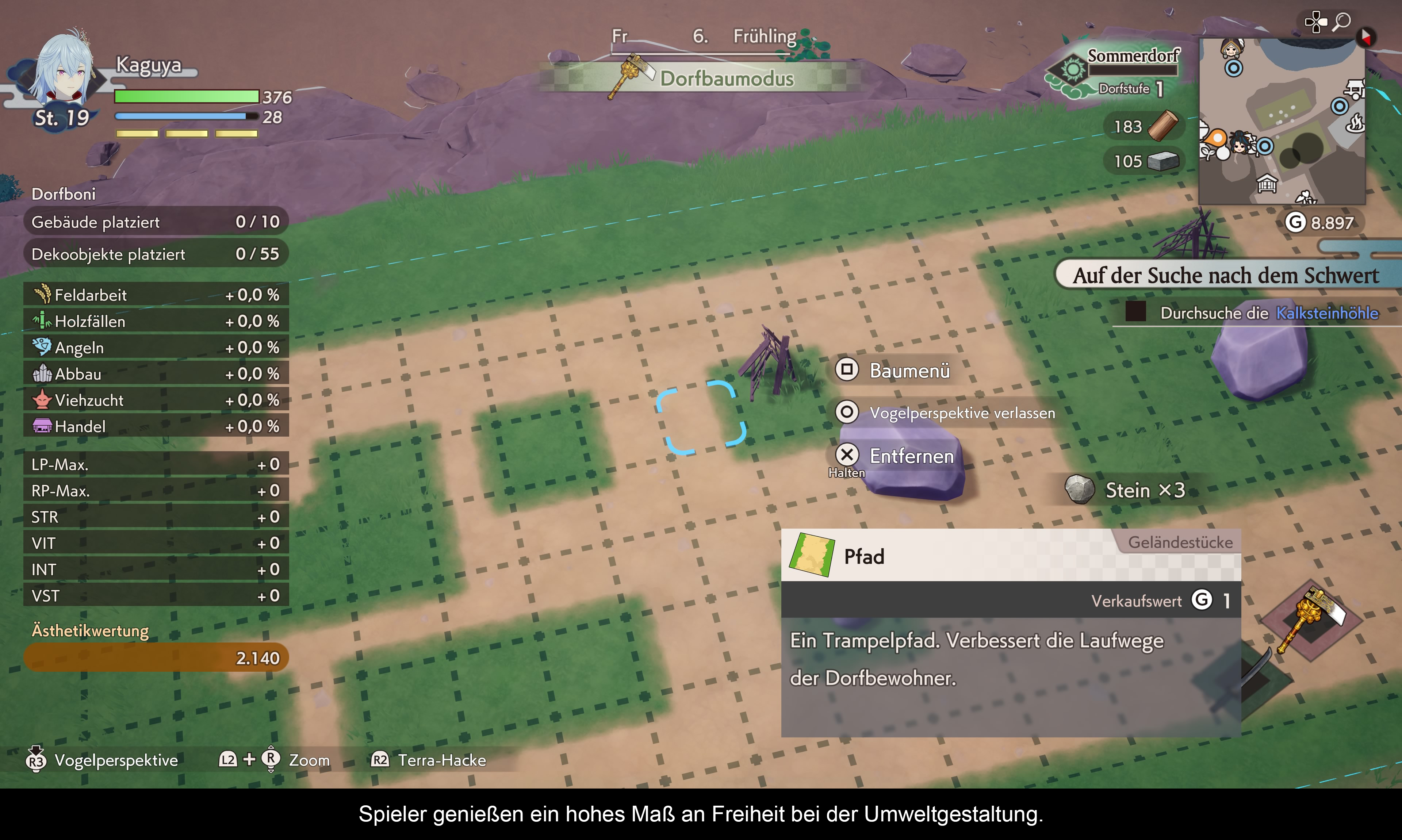 Und nachdem das Ziel einmal festgelegt wurde, geht es für den Spieler auch schon direkt ans Eingemachte. In bester Rune Factory-Manier geschieht das gleich auf zwei Ebenen. Zum einen gilt es, die vier Dörfer von Azuma schrittweise wiederaufzubauen. Das erfolgt durch die Aufwertung der landwirtschaftlichen Strukturen sowie durch den Bau neuer Gebäude und Shops. Gemeinsam sorgen diese Maßnahmen nicht nur dafür, dass die Dörfer an Charme und Lebendigkeit gewinnen, sondern auch, dass ein stetiger Cashflow entsteht. Das verdiente Geld lässt sich wiederum in die Infrastruktur reinvestieren – oder in neue Waffen und Ausrüstungsgegenstände stecken. Besonders interessant ist dabei, dass der Aufbau der Stadt direkten Einfluss auf die eigenen Charakterwerte hat. Jedes zusätzliche Gebäude verbessert sowohl Angriffs- als auch Verteidigungswerte, was vor allem bei der Suche nach den Naturgöttern entscheidend ist. Diese führt den Spieler nämlich durch weitläufige Gebiete, die von Monstern überrannt sind, und durch gewaltige Dungeons, in denen hinter jeder Ecke neue Gefahren lauern. Gleichzeitig dienen diese Expeditionen auch der Ressourcensammlung: Man fällt Bäume, bricht Erze aus dem Gestein oder entdeckt neue Rezepte und nützliche Items in der Umgebung.