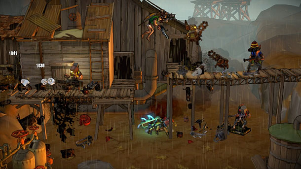 Ich spiele Walter P. Tugnut, einen grobschlächtigen Hinterwäldler, der in seinem großen Wohnmobil und mit einer ordentlichen Portion Selbstgebranntem gegen die Roboterapokalypse kämpft. Das war’s auch schon mit der Story. Wo kommen die Roboter her? Wieso gehen sie auf die Barrikaden? Keine Ahnung, ist auch egal, denn es geht hier ja schließlich um gaaaanz viel Loot! Nach kurzer Zeit ist man nur noch auf der Jagd nach kleinen Item-Kisten oder nach großen Gegnern, die ebenfalls neue Items freischalten.