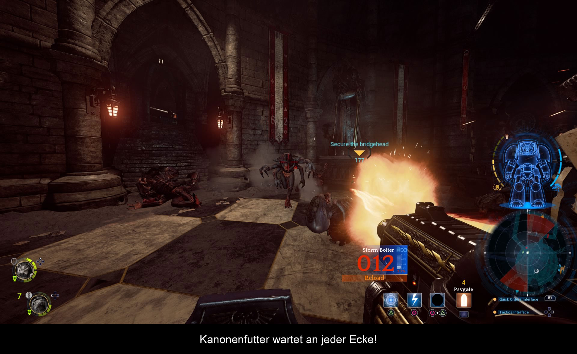 Damit kommen wir zum nächsten großen Punkt: Der Ausrüstung. Terminatoren sind die schwersten Rüstungen, die ein Space Marine tragen kann. Sie sind riesig, langsam und sehr schwer. Springen, ducken, in Deckung gehen – das ist alles nicht drin. Ist auch nicht nötig, denn eigentlich ist ein Terminator selbst die Deckung. Auf der einen Seite bleibt man damit dem Quellmaterial treu, auf der anderen Seite sind das Standards, die von den meisten Spielen heutzutage verlangt werden. Ich persönlich finde es gut, dass man sich an das Original gehalten hat. Zudem verfügt meine Spielfigur noch über zauberspruchähnliche Psyker-Fähigkeiten wie Blitze und Feuersäulen. Zu guter Letzt kann ich auch noch Geschütztürme hacken und Türen verrammeln, so dass ich den Gegnern den Weg abschneiden kann und nicht von hinten überrascht werde. In der Praxis fällt das allerdings zu wenig ins Gewicht, vor allem die Türme sind absolut nutzlos.