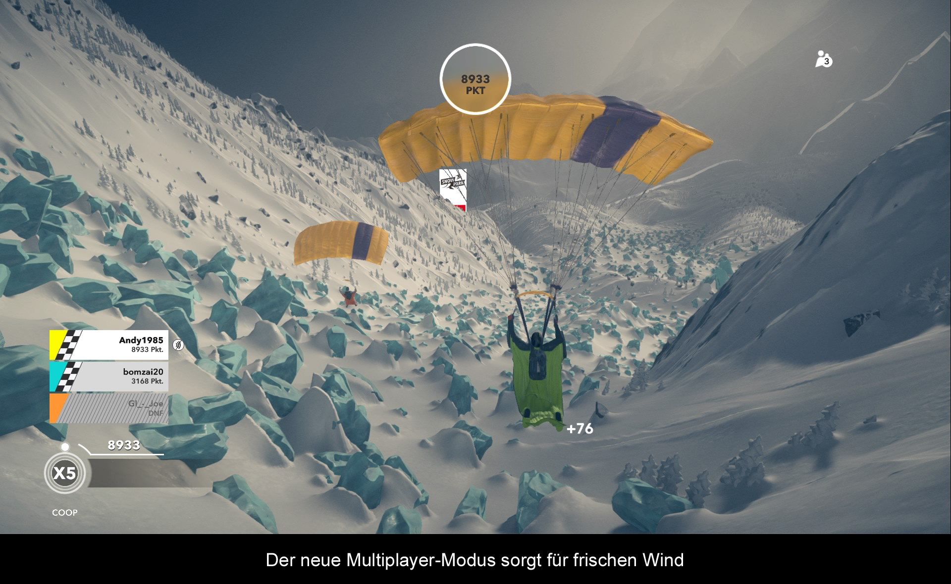 Auch wenn der DLC letztendlich enttäuscht, dient er doch als Ausrede, um wieder einmal in die Steep-Welt einzutauchen. Die Entwickler versorgen das Spiel stätig mit neuer Kleidung und interessanten Aufgaben. Das neueste Projekt ist die Einbindung eines Multiplayer-Wettkampfs. Statt zufällige Spieler auf der Piste zu entdecken, kann man nun auch zu viert in einem Wettkampf antreten. Das Matchmaking ist zwar noch etwas langsam und wirkt lieblos zusammengestellt, doch tut es seinen Dienst. Man wird in eine Serie von unterschiedlichen Wettkämpfen geworfen und muss zeigen, das man Rennen und Tricks gleichermaßen beherrscht. Am Ende gibt es eine einfache Tabelle, wo strickt nach Punkten abgerechnet wird. Als Belohnung erwarten Erfahrungspunkte. Hier und da noch ein paar kleine Änderungen und der Multiplayer-Modus würde das Spiel ordentlich abrunden. Ein weiterer positiver Schritt ist, dass man endlich die Steep Credits nutzen kann, um andere Sportarten freizuschalten. Man muss somit nicht mehr den DLC kaufen, sondern kann mit der erspielten Ingame-Währung zum Beispiel den Schlitten freischalten.