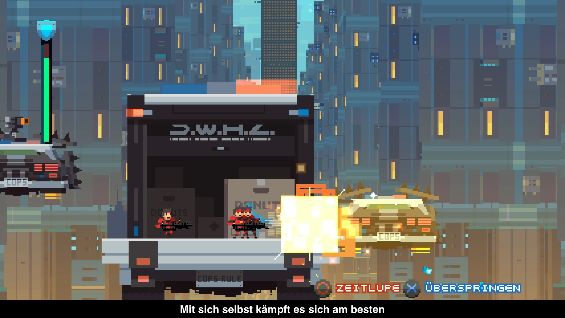 Was das Gameplay angeht, präsentiert sich Super Time Force Ultra als Action-Plattformer aus der Seitenansicht im Stile eines Metal Slug oder Contra. Dementsprechend fällt auch die Steuerung recht gleich aus und ist simpel gehalten. Ihr könnt springen und in acht Richtungen schießen. Die Besonderheit ist aber nun das Zeitreise-Feature. Denn pro Level habt ihr 60 Sekunden Zeit es abzuschließen, was erstmal nach wenig klingt. Doch pro Level hat man auch die Möglichkeit 30 Mal die Zeit zurückzudrehen und die Szenen nochmals zu erleben. Dabei bleibt das „alte Ich“ aber bestehen. Wenn ihr z.B. mit dem alten Ich einen Gegner besiegt habt, könnt ihr zurückreisen und euch das Geschehen in Ruhe aus der Ferne ansehen. Das klingt recht einfach, ist aber gar nicht so leicht, da das ganze gerne mal im Chaos endet, wenn fünf oder mehr Charaktere über den Bildschirm laufen und alle ihre Waffen abfeuern, wird es unheimlich unübersichtlich. Zudem gibt es Stellen, die etwas unglücklich laufen und man findet sich dann quasi in einer Endlosschleife wieder und muss die Zeit weiter zurückdrehen, um nicht ständig von den Schüssen der Gegner erledigt zu werden. Während man die Zeit zurückdreht, kann man auch seinen Charakter wechseln. Denn die Super Time Force besteht natürlich aus mehreren Leuten und jeder hat seine eigenen Fähigkeiten. Im Spielverlauf kann man auch weitere Charaktere finden und die Ultra Fassung auf der PlayStation bietet neben weiteren Charakteren auch noch spezielle Personen, wie Sir Galahad aus The Order: 1886, der Reisende aus Journey oder Sony Worldwide Studios Präsident Shuhei Yoshida, der mit seinem Handy Twitter-Nachrichten verschickt und so gegen die Gegner kämpft. Neben ein paar Collectibles und mehreren Welten mit je vier Leveln, gibt es leider nicht viel zu tun.